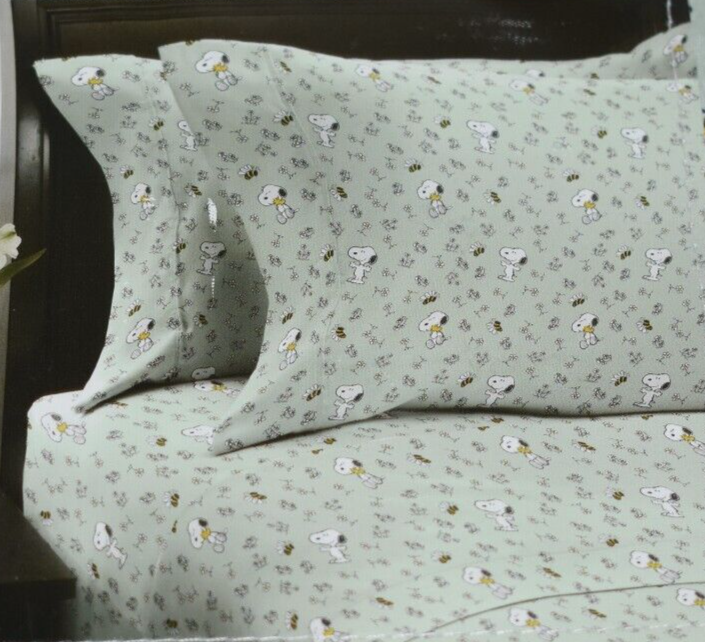 Peanuts Snoopy, Bee's, and Daisies Pattern Queen Size Sheet Set Green sheets with a Snoopy, Woodstrock, Bee's, and Daisies pattern Includes: 1 Flat Sheet - 90" by 102" 1 Fitted Sheet - 60" by 80" 2 Pillow Cases - 20" by 30" Made of 100% Polyester New in package Customer satisfaction is my # 1 Priority!! Please contact me if you are not satisfied with any aspect of your purchase before leaving any feedback. S5