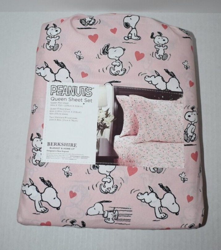Peanuts Snoopy and Hearts Pink Valentine Pattern Queen Size Sheet Set Pink sheets with a Snoopy, Woodstrock, and hearts pattern Includes: 1 Flat Sheet - 90" by 102" 1 Fitted Sheet - 60" by 80" 2 Pillow Cases - 20" by 30" Made of 100% Polyester New in package Customer satisfaction is my # 1 Priority!! Please contact me if you are not satisfied with any aspect of your purchase before leaving any feedback. S5