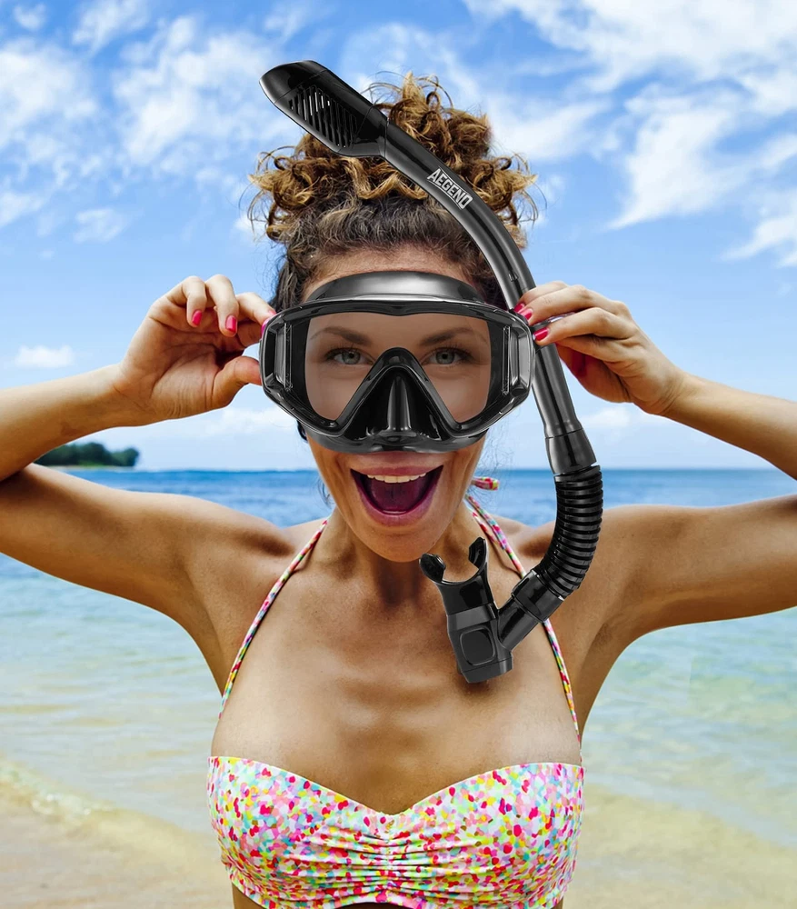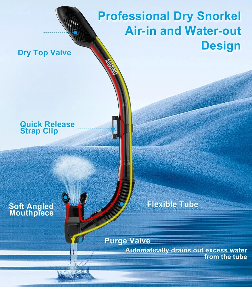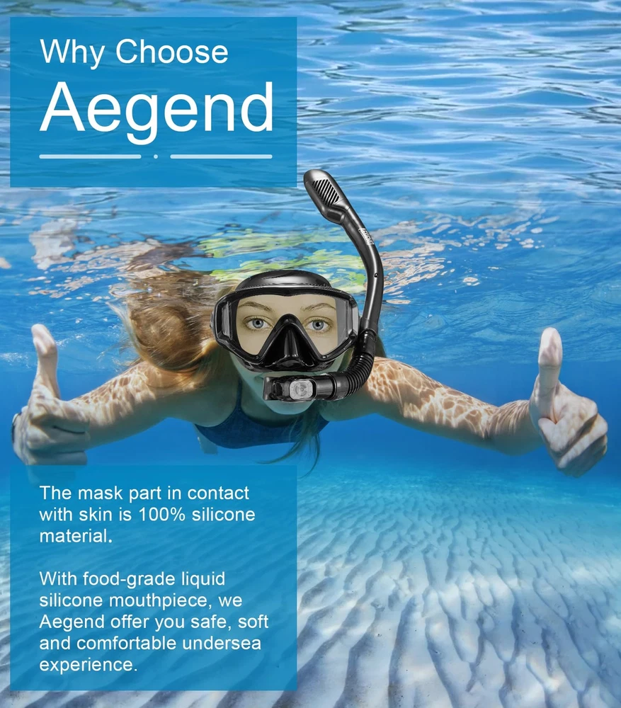 Snorkeling Gear for Adults ENHANCED ANTI-FOG LENSES- Advanced polycarbonate glass with anti-fog treatment avoids fogging up. Both the impact resistance and higher drop resistance are much better than tempered glass. You can relax with the lightweight while you snorkel, so enjoy the ocean’s secrets.Tips: Do not clean your lens with toothpaste which will abrade the lens. FULL PANORAMIC VIEW- The 180-degree view provides a better field of vision. Furthermore, the full-face snorkel view will not distort your horizons by adopting advanced polycarbonate lenses, eliminating any dizziness or discomfort. As a result, you can enjoy a large and clear view of the sea world. FOOD-SILICONE MATERIAL- The snorkel set is soft and comfortable, like a feather slipping your skin. The smooth silicone edge perfectly fits the face curve without any gap to keep the salt water from entering, you will not worry about leaks and red marks. In addition, with the food-safety rating material, the mouthpiece is comfortable in your mouth. DETACHABLE DRY SNORKEL-The snorkeling gear comes with a detachable snorkel. Easily blow out water through way purge valve. It sits at the bottom of a bulblike reservoir that is off from the mouthpiece tube, which makes it effortless to clear. You can even remove water from the snorkel while , all you do is give it a good blow. SIZE FITS ALL- With the adjustable elastic silicone strap, the diving can give a max fit for different face shapes, including men, women, and teenagers. It has a mesh bag, which is easy to carry and is a good companion for traveling. It is suitable for snorkeling, swimming, surfing, and more water activities.