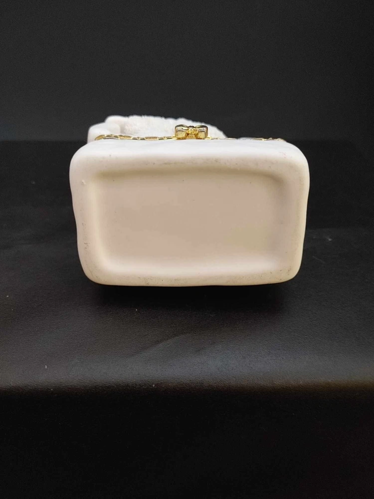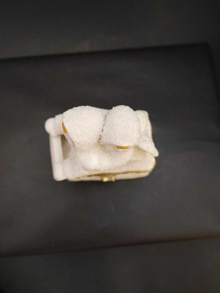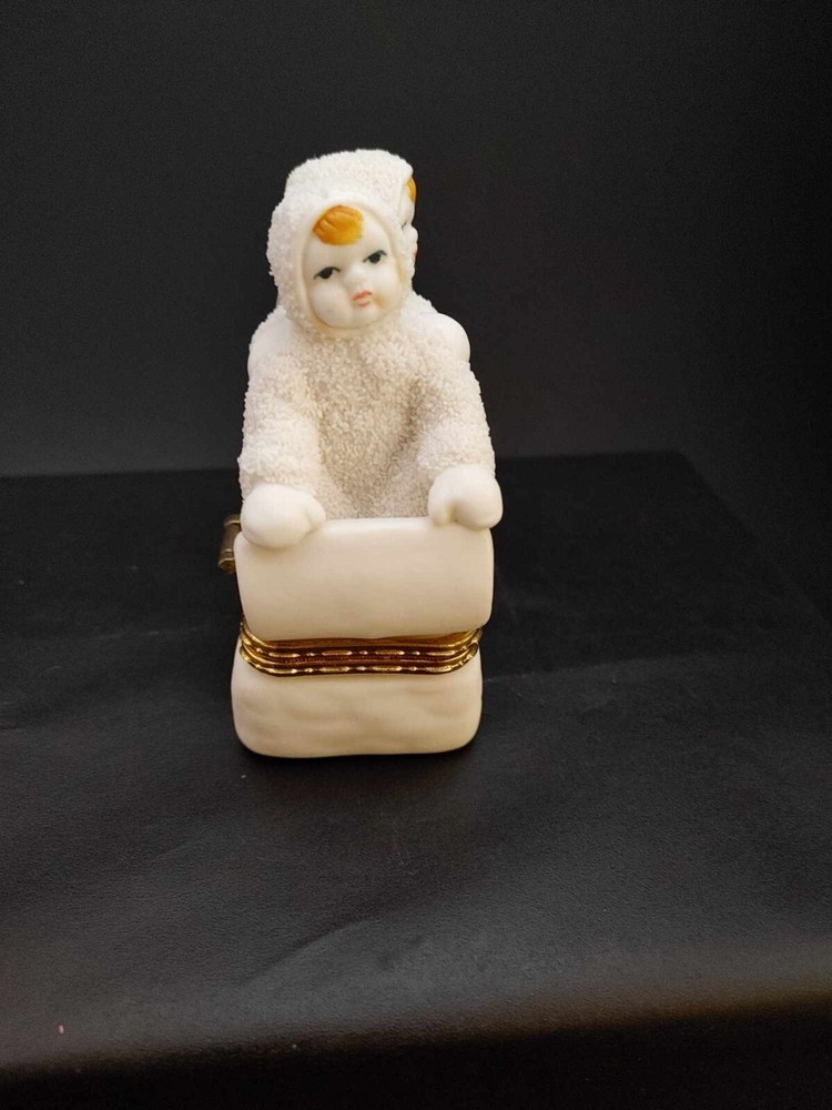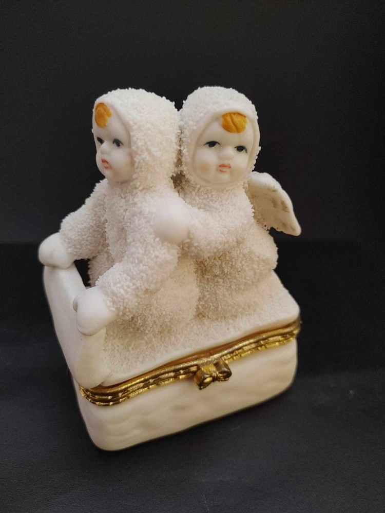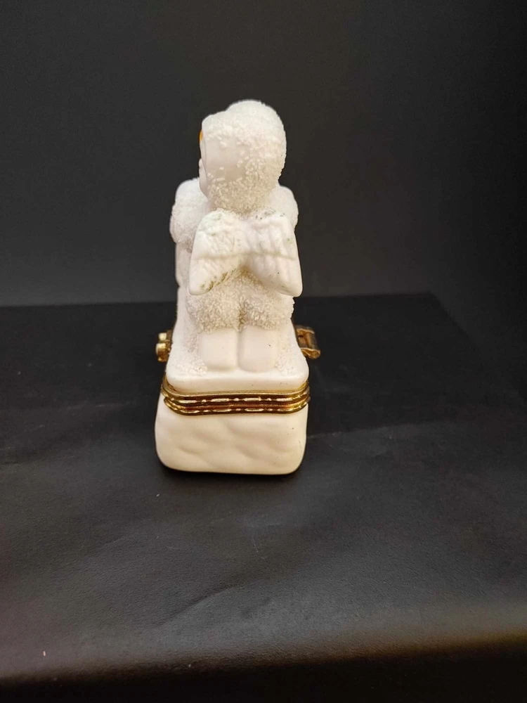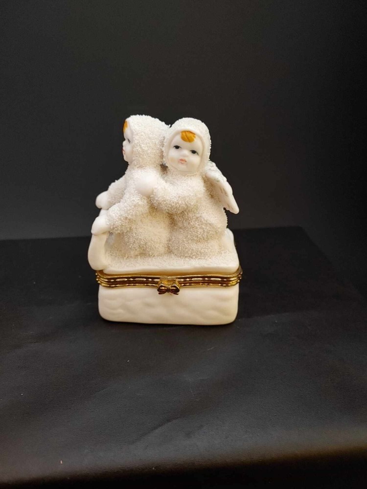 Snow Angels Sledding Trinket Box Hinged Gold Accent Seasonal Christmas Winter. Measures approx. 3.5" tall by 2.5" wide. In Very good condition with no chips, cracks or breaks. Ceramic