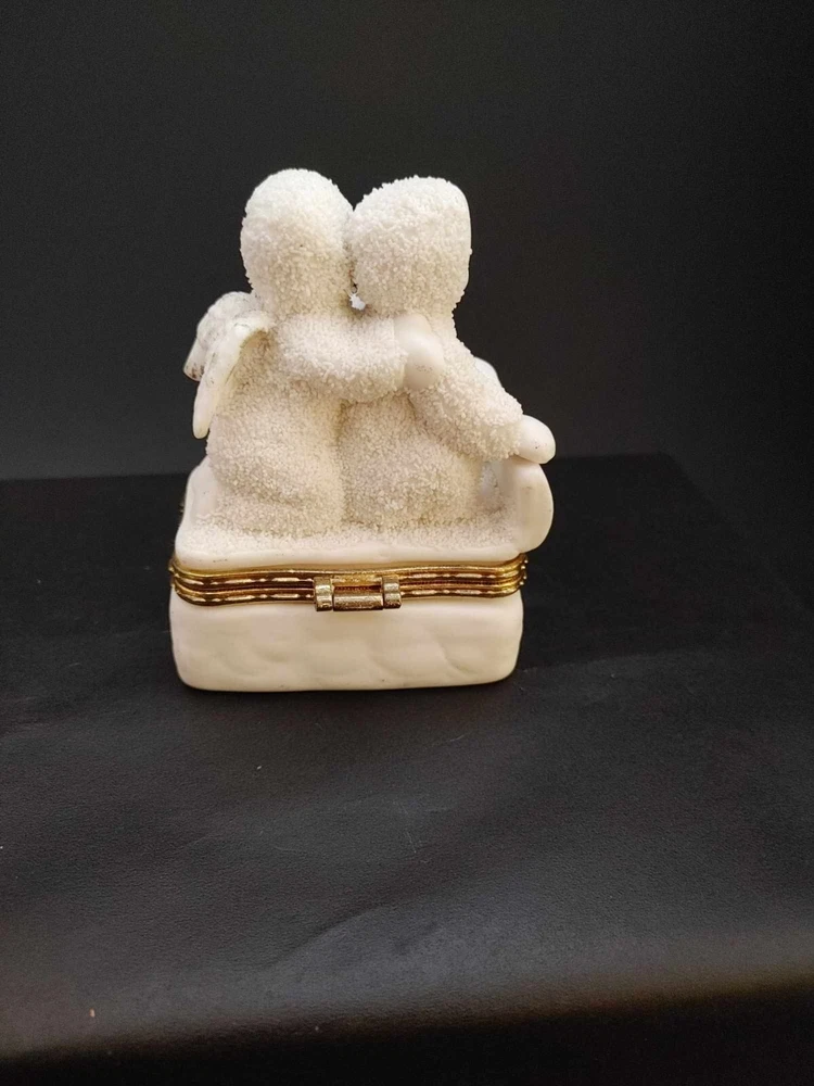 Snow Angels Sledding Trinket Box Hinged Gold Accent Seasonal Christmas Winter. Measures approx. 3.5" tall by 2.5" wide. In Very good condition with no chips, cracks or breaks. Ceramic