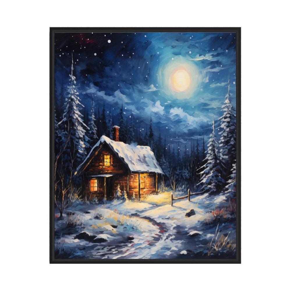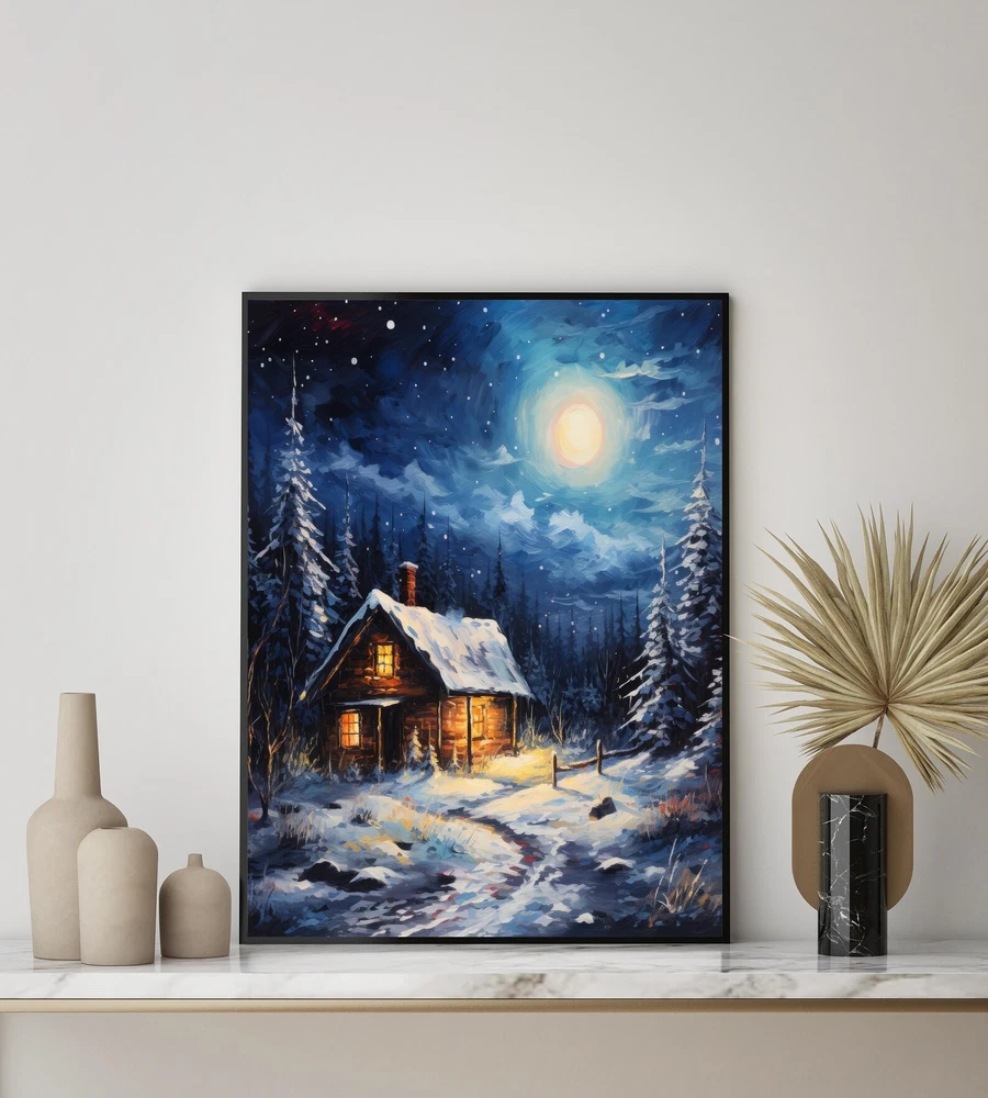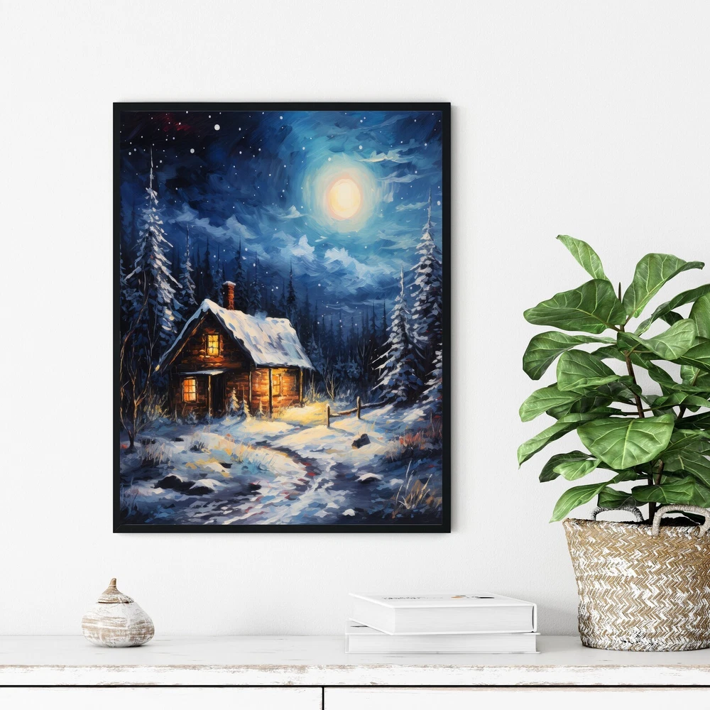 Snowy Cabin Poster Art Print Holiday Christmas Wall Decor Painting Artwork Material: Premium luster photo paper Print type: Inkjet printing One side printed + The finish provides the highest possible resolution and color saturation + Lasts up to 200 years in color and 400 years in black-and-white + Printed on high-quality resin-coated photo base paper medium + Posters can be hung with double-sided tape, tacks, or framed + Hand washing with a gentle cry cloth is recommended for extended durability I will hand select the best choice of paper for your chosen design to ensure top quality results for a beautiful, bright and luxurious print. All prints are sealed in cellophane slips for protection during transportation, and are shipped in a protective cardboard envelope.
