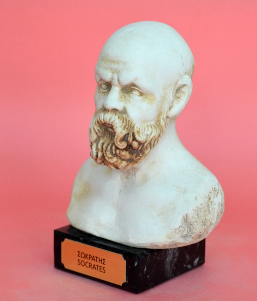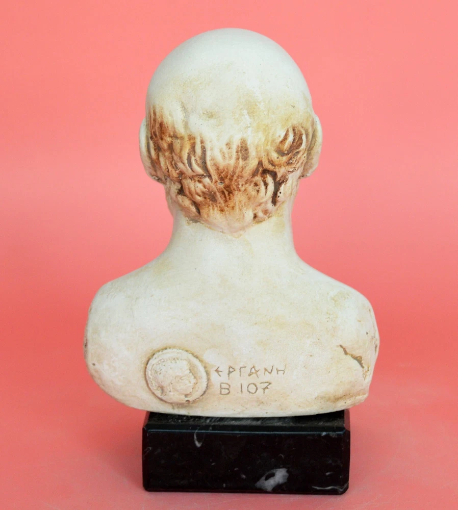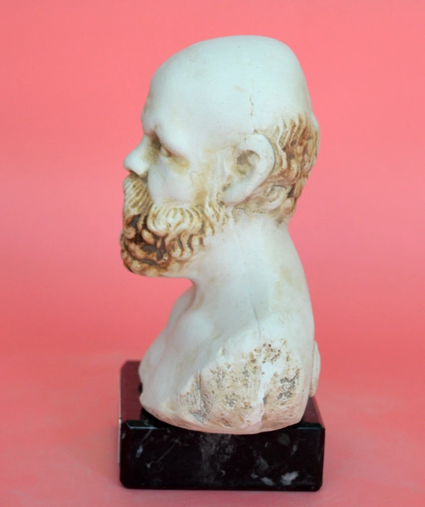 SOCRATES THE PHILOSOPHER Socrates was a classical Greek (Athenian) philosopher credited as one of the founders of Western philosophy. He is an enigmatic figure known chiefly through the accounts of classical writers, especially the writings of his students Plato and Xenophon and the plays of his contemporary Aristophanes. Plato's dialogues are among the most comprehensive accounts of Socrates to survive from antiquity, though it is unclear the degree to which Socrates himself is "hidden behind his 'best disciple', Plato" Please be aware that, due to the fact that our products are either individually cast, carved, hand painted and hand finished, there will inevitably be minor variations in size, colour and texture.(B107) Socrates Details: Condition: New, Handmade in Greece Material: Casting stone Height: 12.5 cm(5 inches) Width: 8 cm(3.1 inches) Length: 5 cm(2 inches) Weight: 400 g ********