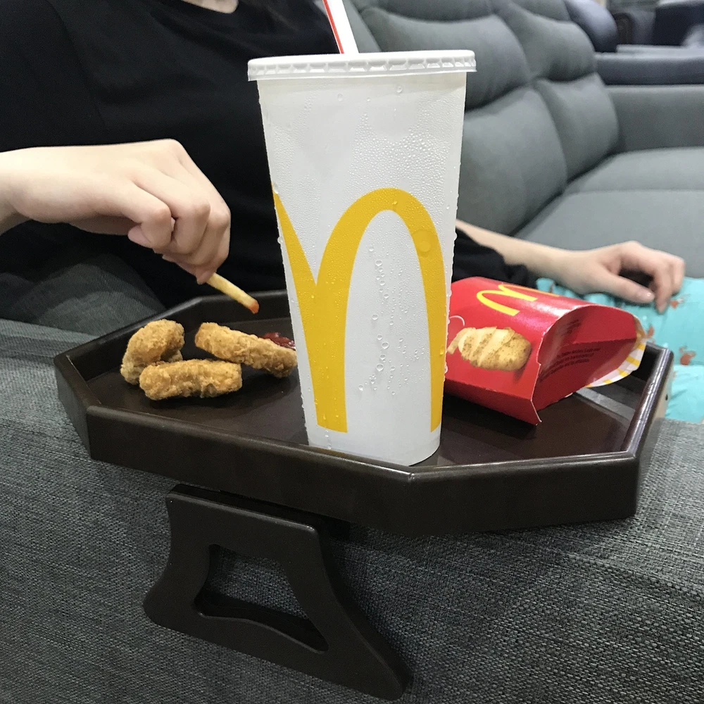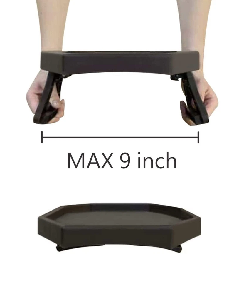 MAKE LIFE EASIER - easy and handy for reaching remote controls/drinks/snacks/phones, especially ideal for couch potatoes and elders with mobility difficulty USER-FRIENDLY NO ASSEMBLE REQUIRED - stress free. No tools and assemble required, simply clamp on and off with the spring loaded legs. Fits in round/square/curved arms width 4 to 9 inch. *Please measure the width of your couch armrest before placing the order* COMPACT SPACE SAVING DESIGN - no space for end table and coffee table? No worries! Couch Armrest Tray is "clamp-on" design, create an instant and stable side table for your coffee time in a second, an ideal replacement for huge side end table, great for households with limited space, apartment, dorm and RV MATERIAL: premium food grade plastic, easy to clean, simply clean with dish soap or damp cloth. Color: Brown MEASUREMENTS – 12.3 (L) x 9 (W) x 2.5 collapse/4.5 expand (H) inch, fits couch arm width between 4 - 9 inch. When not in use, can be stored under the couch or in the drawer with the 2.5" height