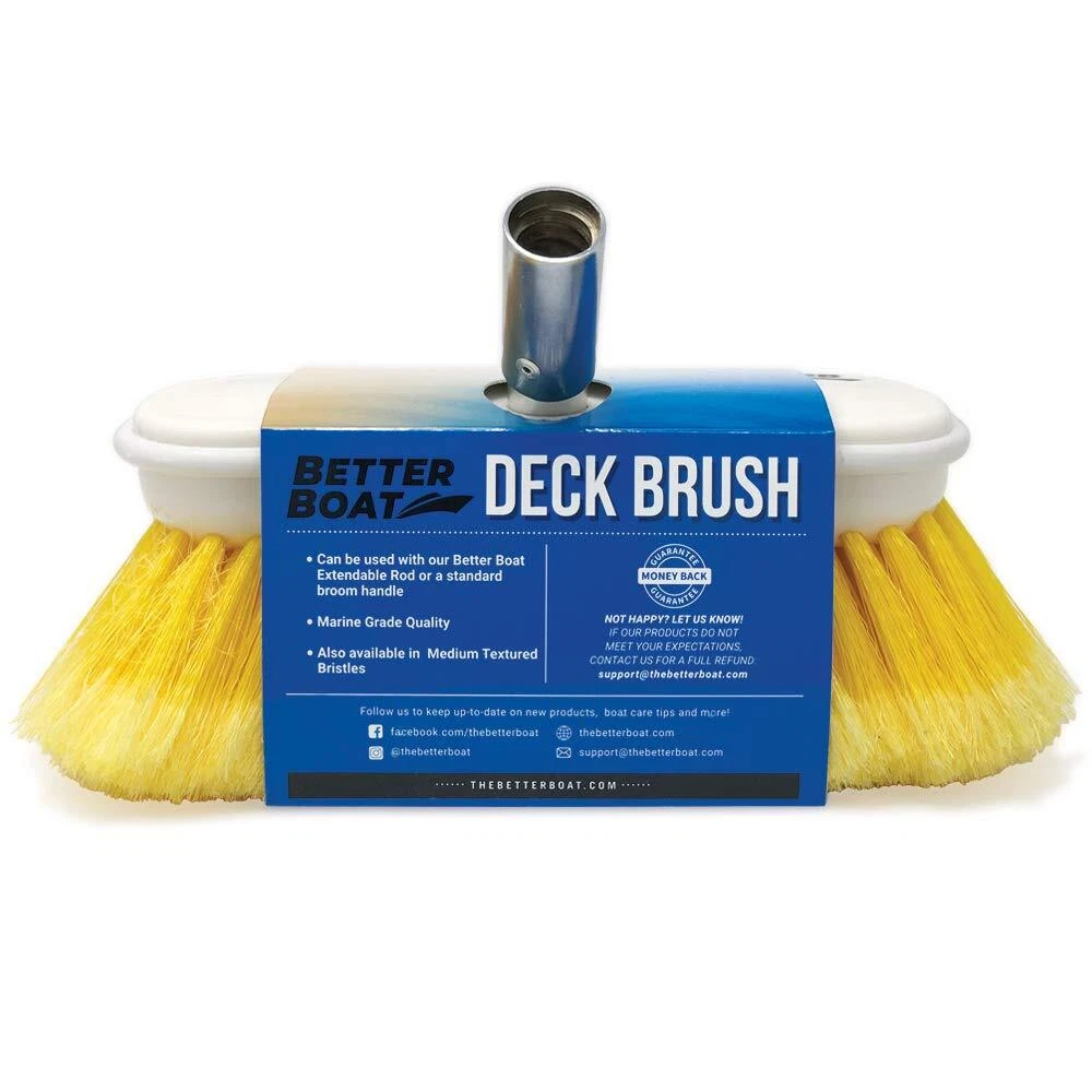 SOFT TEXTURED BRISTLES GENTLY REMOVE DIRT: Our heavy duty commercial grade brush head is ideal for scrubbing scum, washing dirt, grease, grime and bird-droppings without being harsh or scratching painted surfaces or clear gel or ceramic coats. WORKS ON MANY SURFACES: Car wash brush & boat brush head safely cleans fiberglass, wood, grout, tile, metal, siding, glass auto & RV. Cleaning scrub brush is scratch free and ideal for truck & car cleaning, decks, carwash, hull cleaner & deck brush. 3/4” ACME THREAD FITS MANY UNIVERSAL POLE TIPS: Our boat deck brush head works with our long extension Extendable Rod, and other telescoping handles, a standard broom handle or rod that fits a 3/4” acme thread and floats as well THICK RUBBER BUMPER PROTECTS SURFACE WHILE CLEANING: A thick wrap around rubber bumper protects boats and vehicles from damage and marks while cleaning. The large brush face is wide and deep so you can quickly clean large areas. WHY BETTER BOAT: We are a family owned American business committed to making premium quality RV care and boat cleaning supplies. We stand behind your satisfaction and our accesories, equipment & washing products including our attachment deck brush.