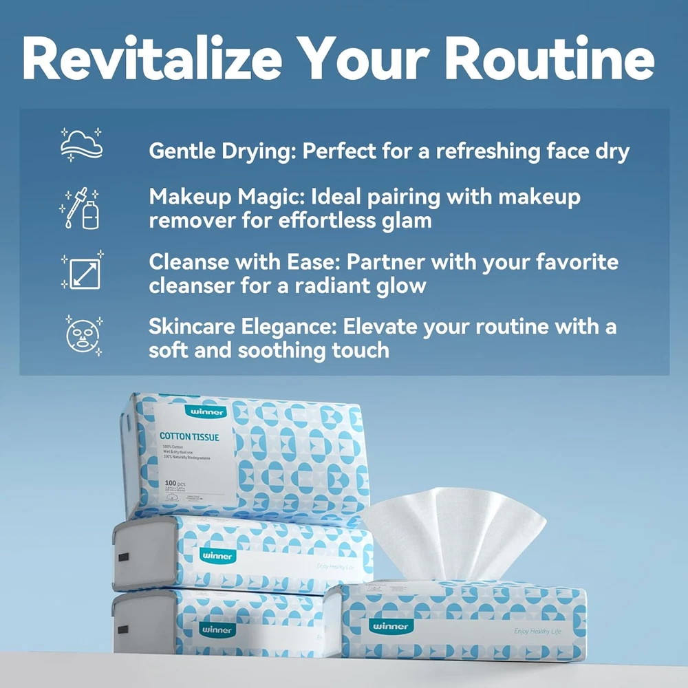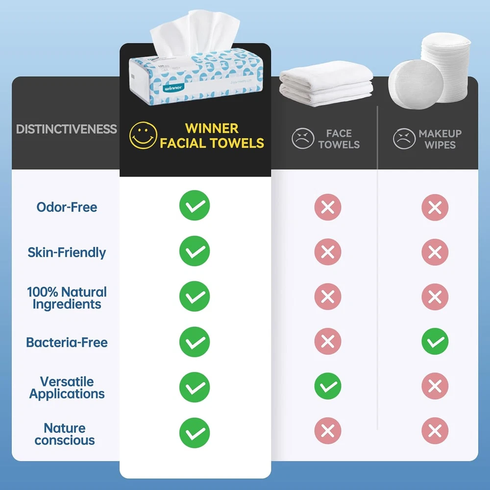[Clinically Proven – Visibly Reduces Dryness & Redness]: Clinically shown to help improve skin clarity and comfort—reducing visible dryness and redness over time. Gentle enough for daily use, even on sensitive skin [Ultra-Soft Comfort – Fresh & Clean in Seconds]: Thick, cloud-soft cotton glides smoothly across the skin. Perfect for face washing, makeup removal, or wiping after a workout—leaving your skin clean and refreshed, without irritation [Naturally Pure – 100% Cotton, Zero Additives]: Made from pure cotton with no synthetic fibers, fragrance, or harsh chemicals. Unscented, biodegradable, and safe for all skin types—including babies and those with sensitive skin [Cleaner Than Traditional Towels – One Use, Always Fresh]: Unlike traditional towels that are reused and may retain residue or buildup, our disposable face towel offers a fresh, clean start every time. A more hygienic choice for daily face washing and skincare routines [Multi-Purpose Essential – From Face to Family Use]: These face towels are perfect for a wide range of needs: skincare, baby care, household cleaning, pet wiping, travel, and more. Lightweight and easy to carry—your all-in-one cotton companion. Comes in 6 packs, 100 towels per pack—ideal for family sharing or long-term use Product description 87% Redness Reduction in 4 Weeks Disposable Use, Always Fresh Winner cotton face towels are disposable for a fresher, cleaner experience every time. Unlike regular towels, they avoid airborne bacteria and fungi buildup. Soft, Absorbent, All-Cotton Face Towels Experience the ultimate in softness and absorbency with our 100% cotton face towels. Perfect for drying your face gently and effectively, they're the ideal choice for your skincare routine. Choose Winner, There's Always an Option for You Add to Cart Add to Cart Add to Cart Add to Cart Add to Cart Add to Cart Add to Cart Customer Reviews 4.6 out of 5 stars 4,633 4.7 out of 5 stars 458 4.6 out of 5 stars 1,407 4.6 out of 5 stars 1,407 4.6 out of 5 stars 4,633 4.5 out of 5 stars 486 4.5 out of 5 stars 486 Price $36.99 $ 36 . 99 $36.99 $ 36 . 99 $34.99 $ 34 . 99 $12.99 $ 12 . 99 $12.99 $ 12 . 99 $22.99 $ 22 . 99 $33.99 $ 33 . 99 100% Cotton ✔️ ✔️ ✔️ ✔️ ✔️ ✔️ ✔️ Decomposable ✔️ ✔️ ✔️ ✔️ ✔️ ✔️ ✔️ Texture Smooth Smooth Smooth Pearl Embossed Smooth Smooth Smooth Single Sheet Size 8" x 8" 8" x 8" 8" x 8" 8" x 12" 8" x 8" 8" x 6" 8" x 6" Sheet Count 600 480 480 55 100 240 600 Thickness ++++ ++++++ +++++ ++++++ ++++ +++++ ++++ Skin Type Normal Normal, Sensitive, Oily Normal, Sensitive, Oily Normal, Sensitive, Oily Normal Normal, Sensitive, Oily Normal, Sensitive, Oily Packaging Type Soft Packaging Soft Packaging Soft Packaging Box Packaging Box Packaging Soft Packaging Soft Packaging