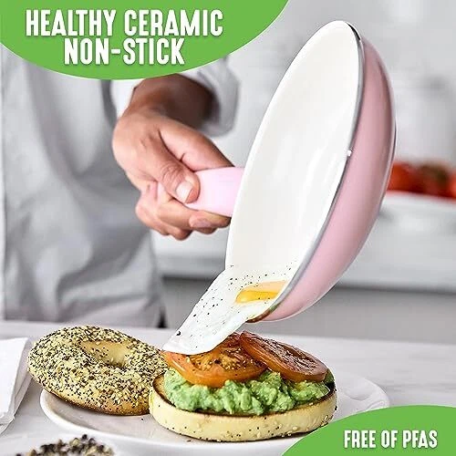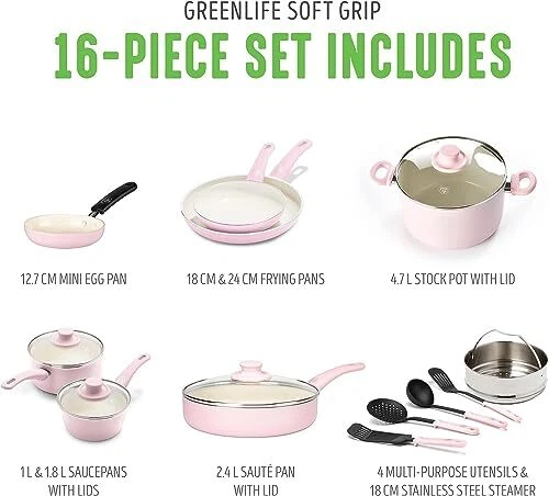 Return Policy Fast Delivery Trusted seller Soft Grip 16 Piece Cookware Set, Non-Toxic PFAS-Free Ceramic Nonstick, Frying, Sauce, Saute, Utensils, Glass Lids, Stay-Cool Handles, Wobble Free, Dishwasher & Oven Safe, Soft Pink Product Description SET INCLUDES: 4” mini frying pan, 7” and 9.5” frying pans, 1QT and 2QT saucepans with lids, 5QT stock pot with lid, 2.5QT sauté pan with lid, 7” stainless steel steamer, and 4 kitchen utensils HEALTHY CERAMIC NONSTICK: Our healthy and easy-to-clean ceramic nonstick coating is derived from sand and delivers effortless release with quick cleanup TOXIN-FREE: Our coating is free of PFAS, PFOA, lead, and cadmium so you can make every meal healthier EXPERT-DESIGNED COOKWARE: Crafted by culinary experts to meet the demands of both home cooks and professional chefs, ensuring superior performance in every kitchen WOBBLE-FREE BASES: Each frypan is reinforced with a wobble-free base for extra strength and even heating EASY TO CLEAN: Dishwasher safe, but most messes wipe away EFFORTLESS PERFORMANCE: Delivers on all stovetops, except induction and oven safe up to 350˚F MADE WITH RECYCLED MATERIALS: Cookware vessels (excluding handles) are made from a minimum of 65% recycled materials. Shipping Returns Payment Shipping Shipping is FREE to all addresses other than APO/PO boxes in the lower 48 states. All our stock ships from US-based warehouses. Shipped via USPS or UPS (depending on location and package weight) Unless stated otherwise, all orders will ship within 24-72 hours of your payment being processed. Check our feedback to see the great reviews of FAST shipping we offer. Returns Seller does not accept returns Payment We currently accept payment via eBay managed payments only. Once payment is cleared, we will dispatch your shipment within 1-3 business days. Please refer to the "Shipping" tab for more information regarding shipping speed to your destination.