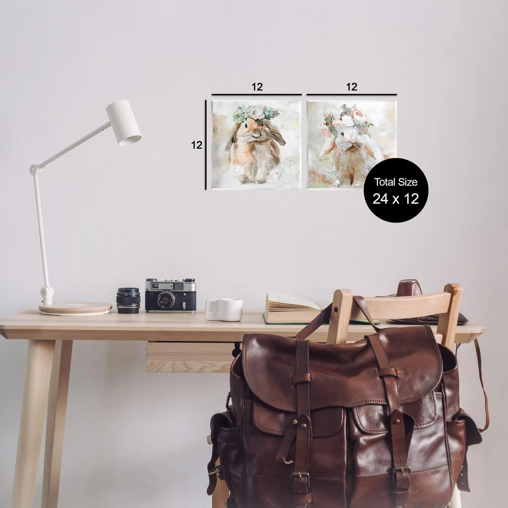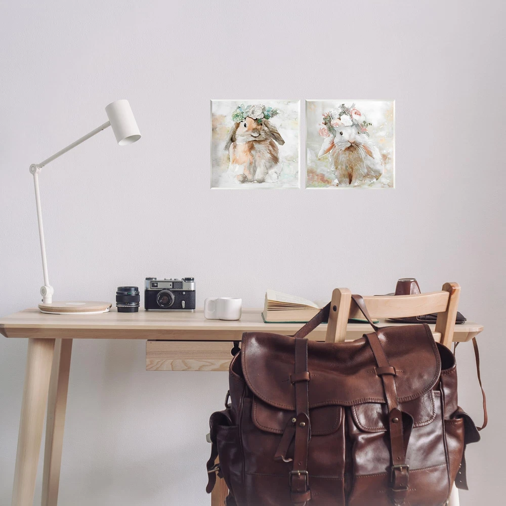 Fill any space with Stupell Wall Art Sets. Our wall plaques start as high-quality lithograph prints mounted on durable 0.5-inch thick MDF wood. Each piece is hand finished and comes with a fresh layer of white foil on the sides to give it a crisp, clean look. Plaques arrive ready to hang without installation and come with removable plastic corners to keep them from damage in transit. Wall Art is made in the USA. Dimensions: 2 Piece Set, Each Panel is 12 x 0.5 x 12 Inches Wall Art is Ready to Hang with Hardware Free Hanging. No Installation required. For Easy Set Up Lean or Layer Artwork on Shelf or Against Wall. Artwork is Permently Fixed into the Frame. All of our wall plaques start off as high quality lithograph prints that are then mounted on durable 0.5 inch thick MDF wood. Each piece is hand finished and comes with a fresh layer of foil on the sides to give it a crisp clean look. Made In USA. Artwork Relates To: Animal, Rabbit, Bunny, Spring, Flower, Floral Design by Steller Design Studio