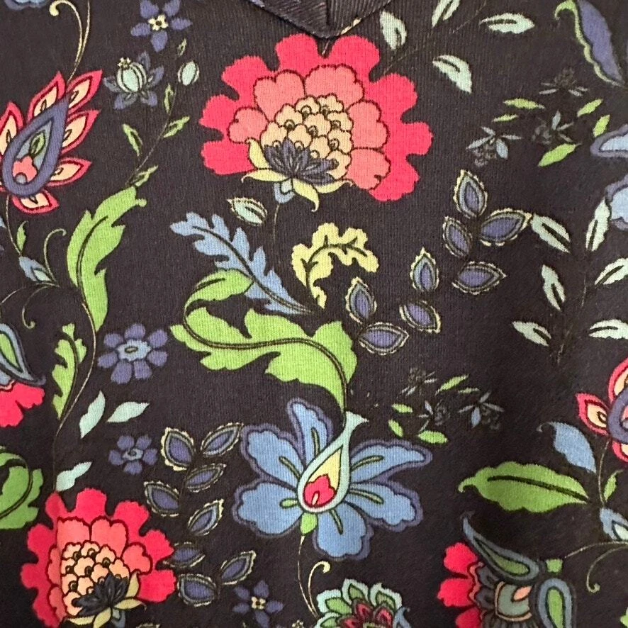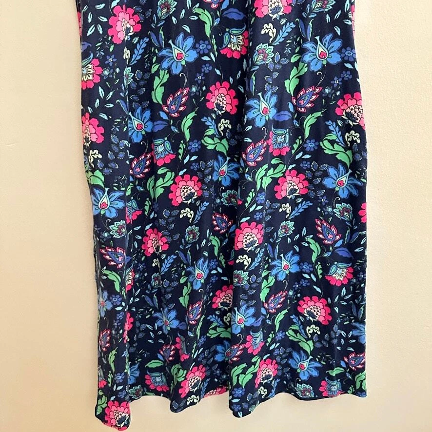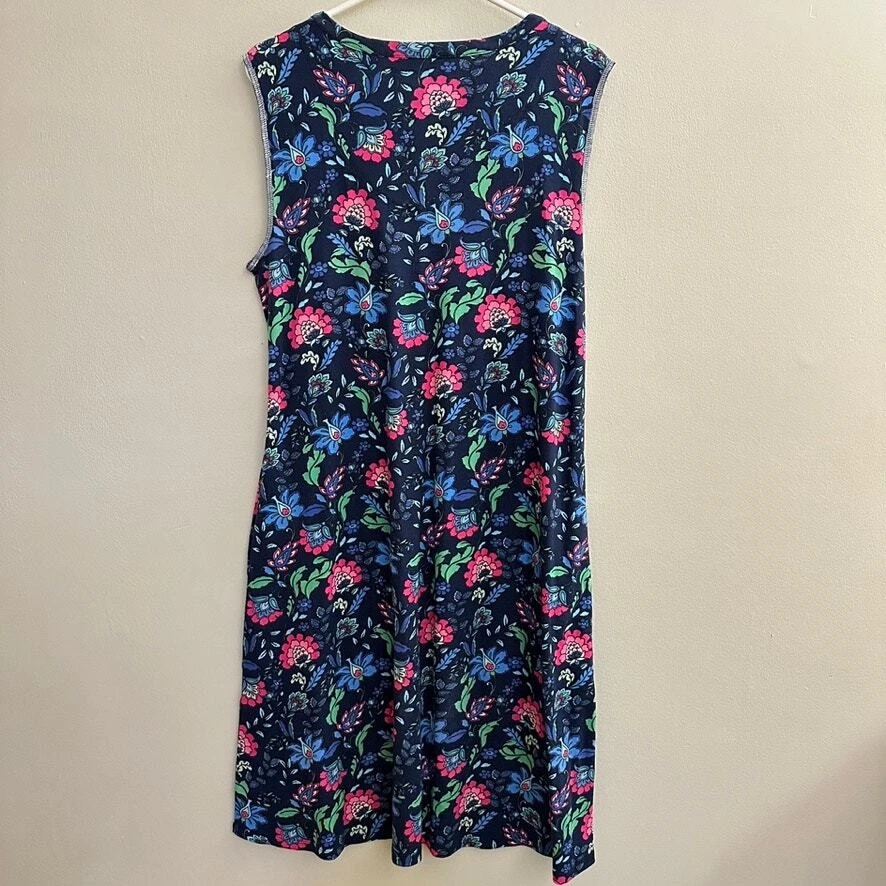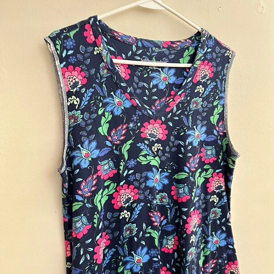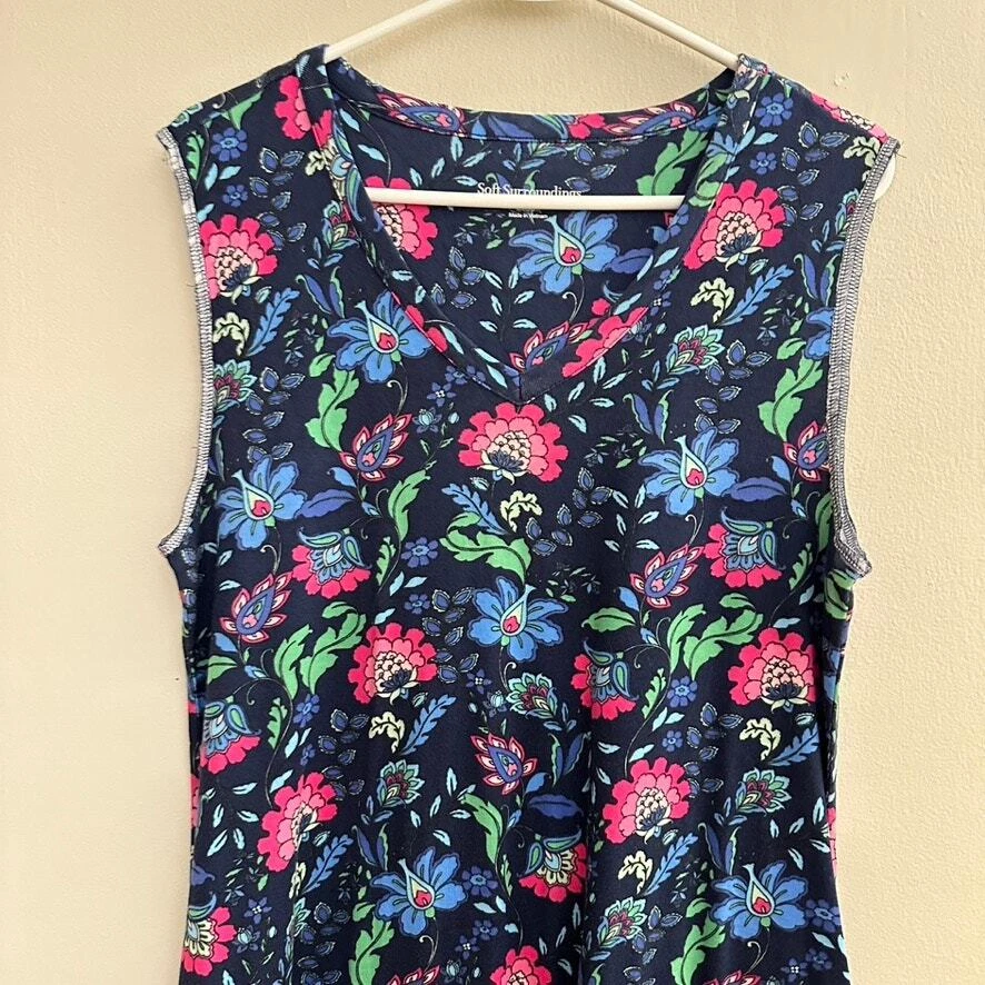 Soft Surroundings Essential Supima T-Shirt Dress Sleeveless Blue Folk Art Floral Knee-length t-shirt dress is made of the softest, smoothest, strongest and stretchiest cotton blend around. V-neck. Pockets. Size: MEDIUM Approx. measurements: 18" across (pit to pit), 40" long (shoulder to hem) Condition: Pre-loved and in gently used condition. Light wear. no stains, rips, or holes. The stitching along the sleeves is showing and is unravelling in some spots on the right arm. - see all pics for any wear/condition Actual colors may vary. We do our best to ensure that our photos are as true to color as possible. However, due to photographic lighting sources, inconsistencies of various monitors settings, we cannot guarantee that the color you see accurately portrays the true color of the product. folksy, folk art, feminine, cottage, cottagecore, boho, bohemian, summer,