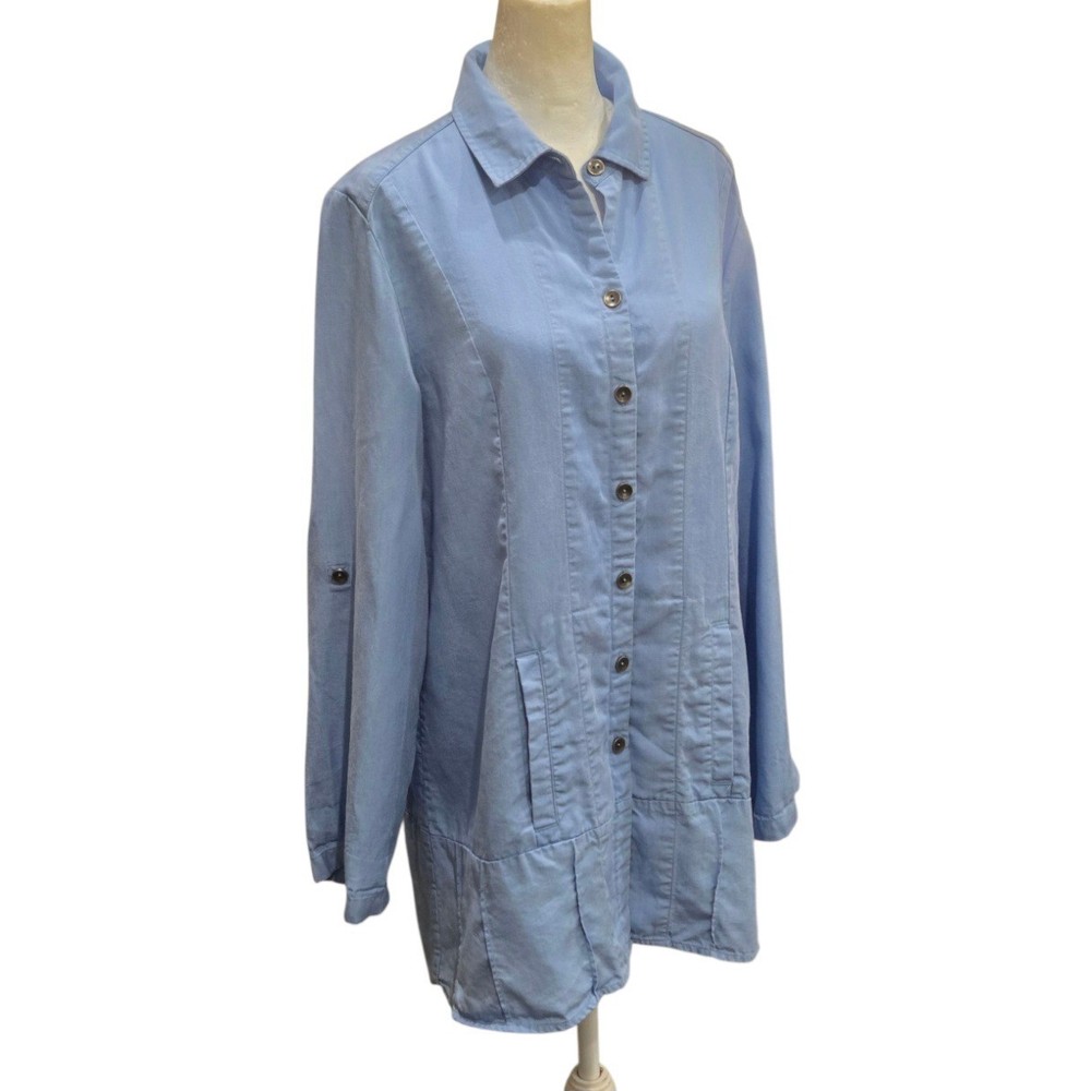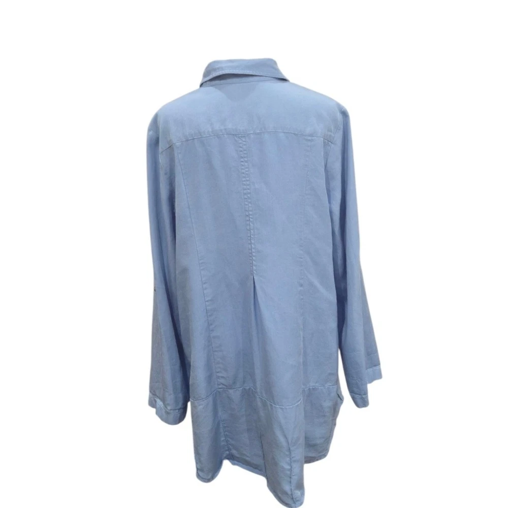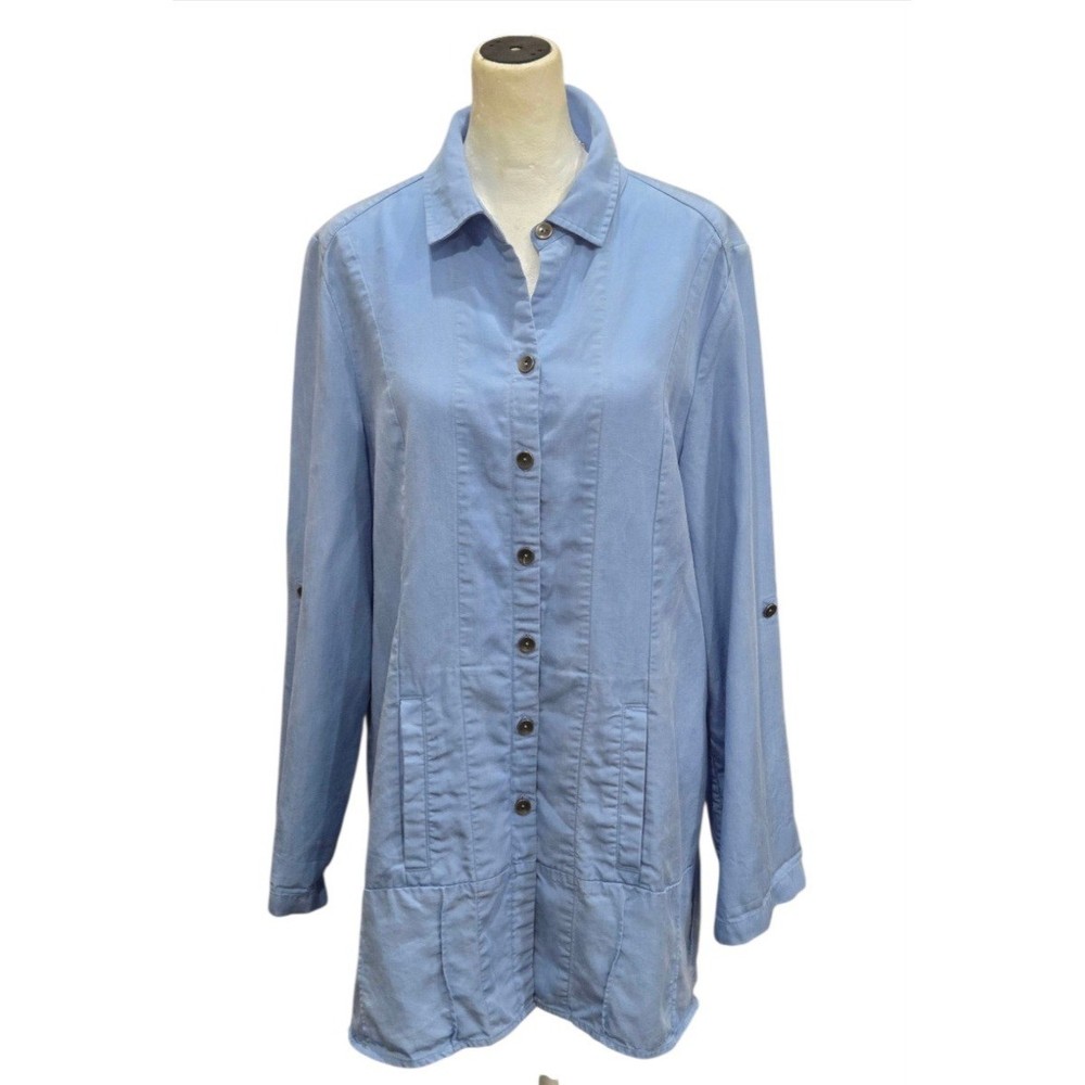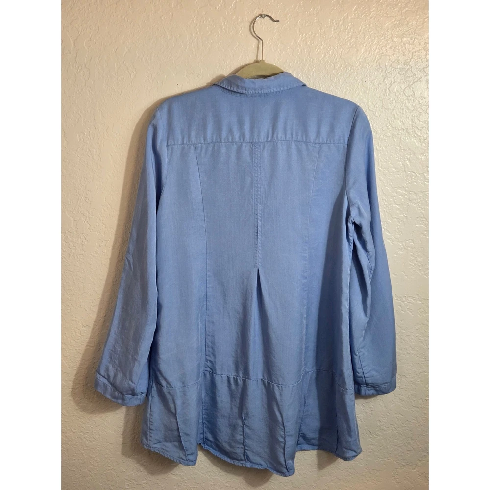 Breezy sophistication comes alive in this button-down tunic, perfect for adding a touch of effortless elegance to your wardrobe. The soft, flowing fabric drapes beautifully, creating a flattering silhouette that moves with you. Vertical seams streamline the figure, while the unique pleated hem adds a subtle yet eye-catching detail. Versatile sleeves with button-tab closures allow for customized comfort and style, making it easy to transition from casual daytime outings to elevated evening gatherings. Wear it open as a lightweight layering piece over a simple tank or buttoned up for a more polished look. Ideal for weekend brunch dates, relaxed vacation vibes, or everyday casual elegance. Excellent pre-owned condition. No visible imperfections Approximate flat laying measurements: Sleeve: 25 Pit to pit: 20.5 Length: 33 Style: Tunic Material: Tencel Lyocell Features: Lightweight, Pockets, Roll Tab Sleeves, Comfortable, Easy Care