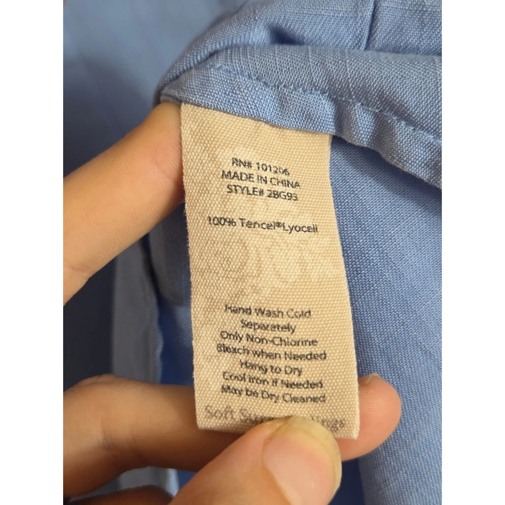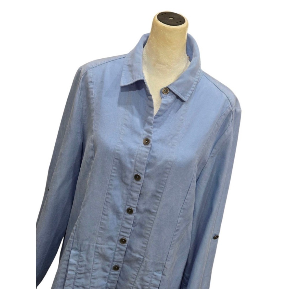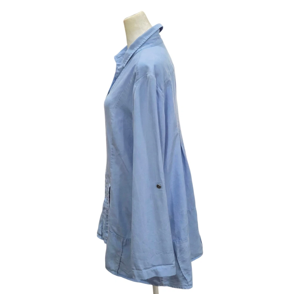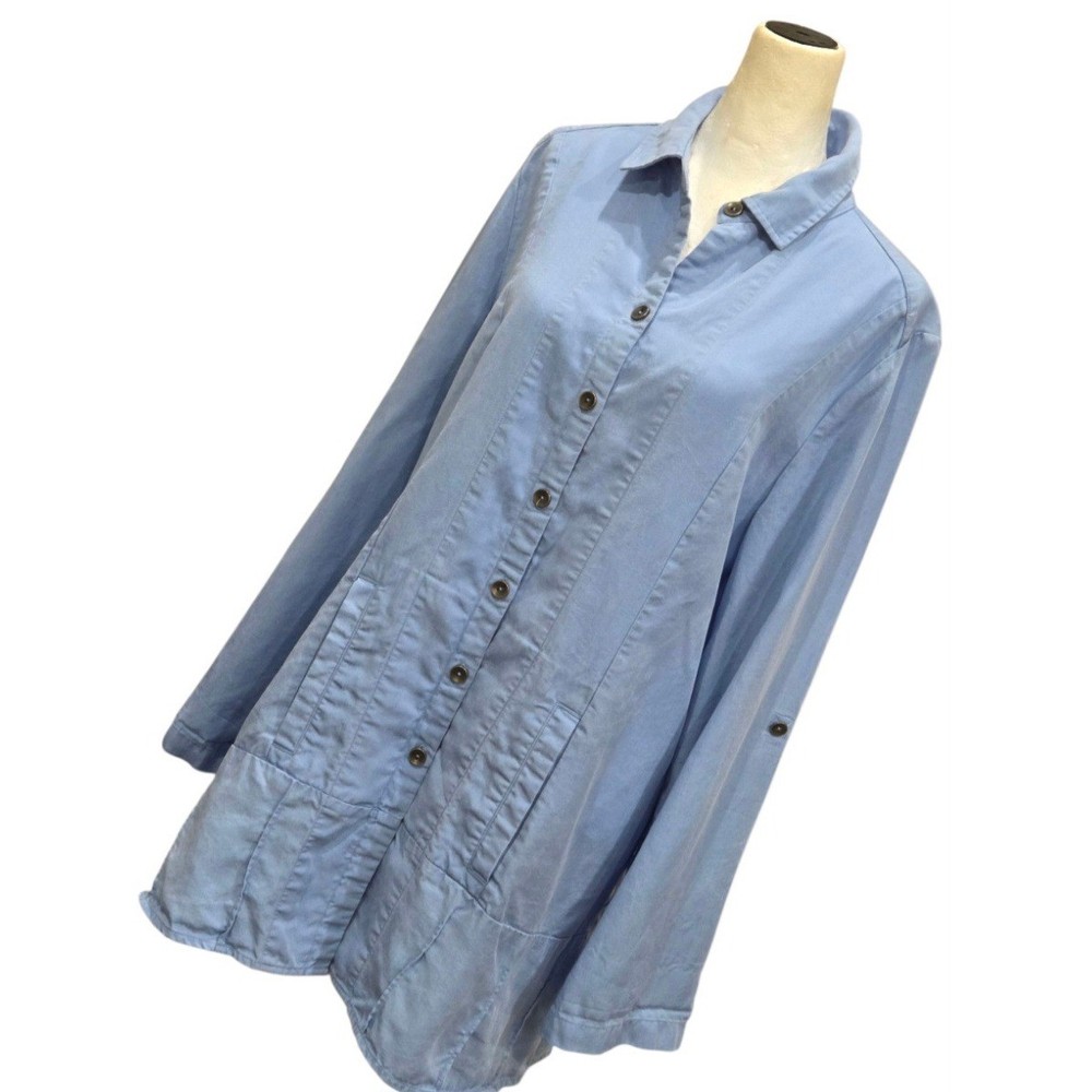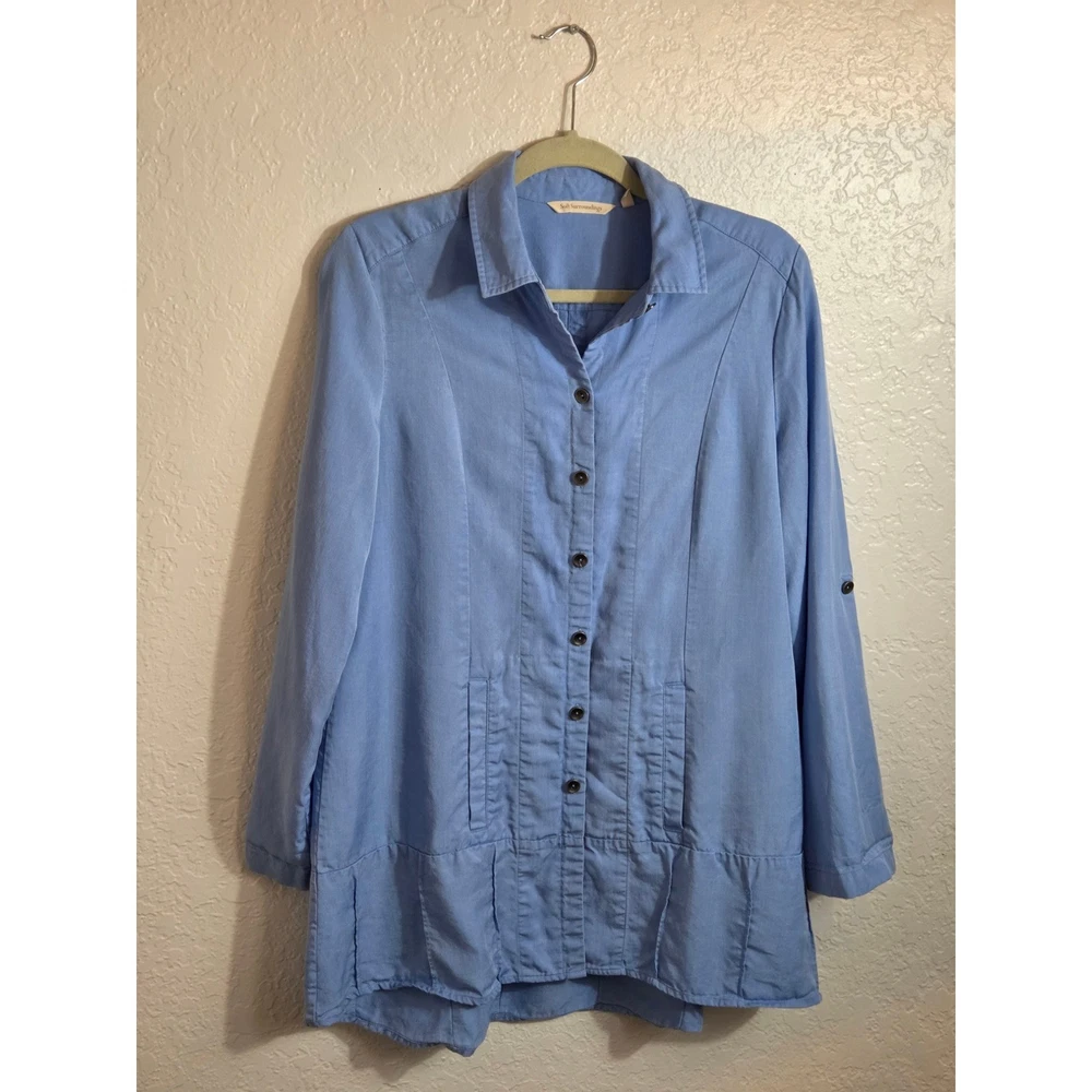 Breezy sophistication comes alive in this button-down tunic, perfect for adding a touch of effortless elegance to your wardrobe. The soft, flowing fabric drapes beautifully, creating a flattering silhouette that moves with you. Vertical seams streamline the figure, while the unique pleated hem adds a subtle yet eye-catching detail. Versatile sleeves with button-tab closures allow for customized comfort and style, making it easy to transition from casual daytime outings to elevated evening gatherings. Wear it open as a lightweight layering piece over a simple tank or buttoned up for a more polished look. Ideal for weekend brunch dates, relaxed vacation vibes, or everyday casual elegance. Excellent pre-owned condition. No visible imperfections Approximate flat laying measurements: Sleeve: 25 Pit to pit: 20.5 Length: 33 Style: Tunic Material: Tencel Lyocell Features: Lightweight, Pockets, Roll Tab Sleeves, Comfortable, Easy Care