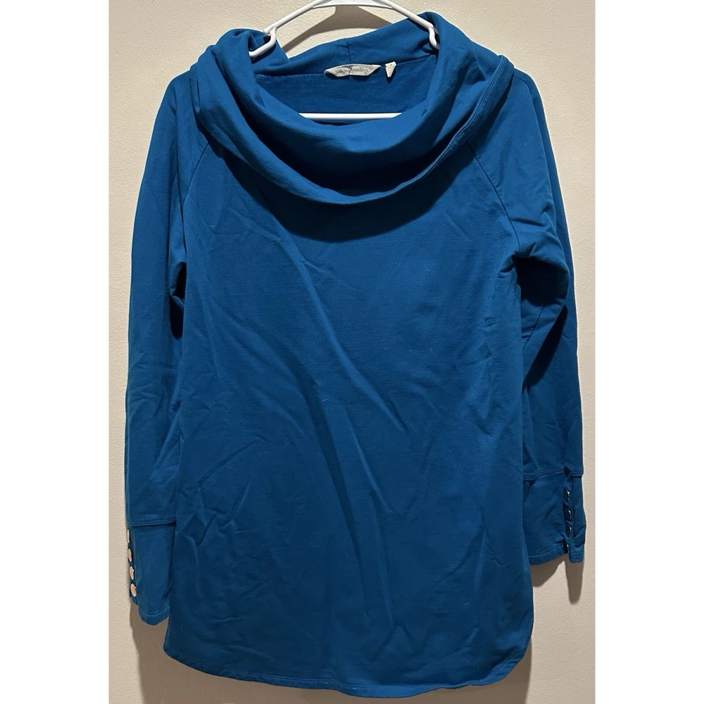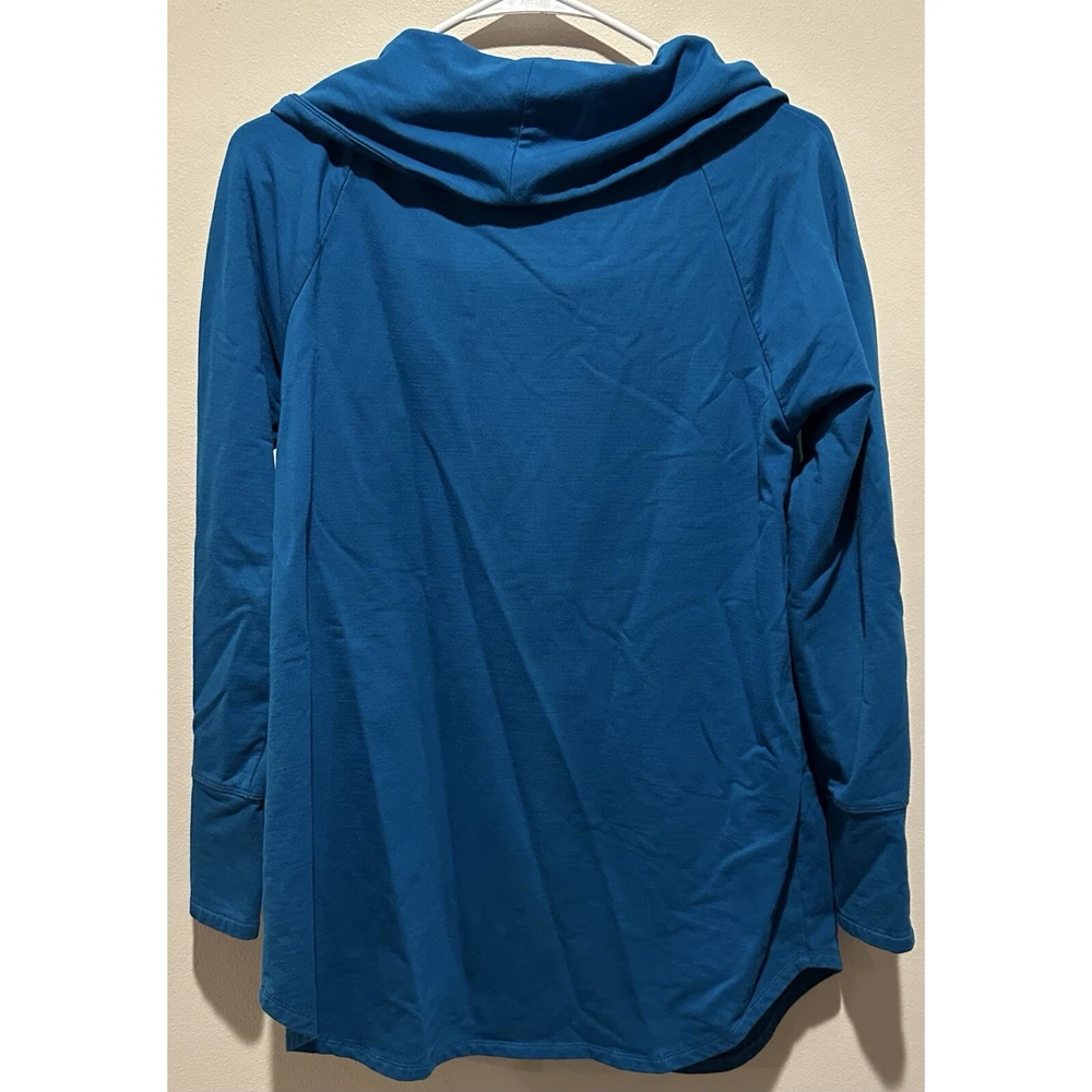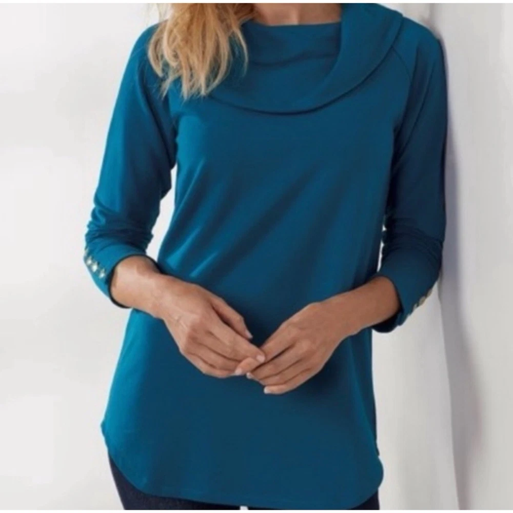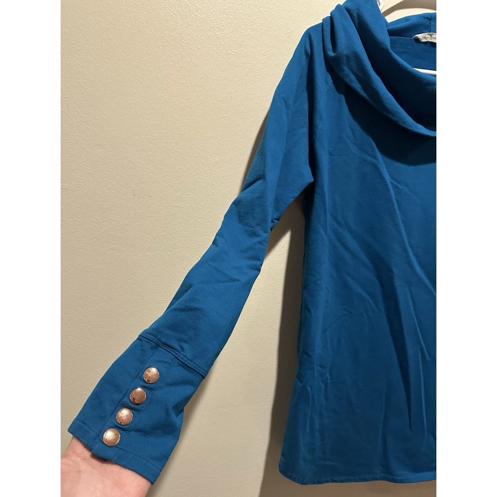 - Approx measurements: 181/2" armpit to armpit, 27" length, 24" sleeve length - EUC: excellent used condition; no stains, rips or tears - Lightweight sweater/thick top - Soft cotton blend - Wide cowl style mock neck - Dark Teal/ Turquoise Blue - Heavenly Soft - Valerie Pullover Tunic Top - Rose Gold accent on cuffs