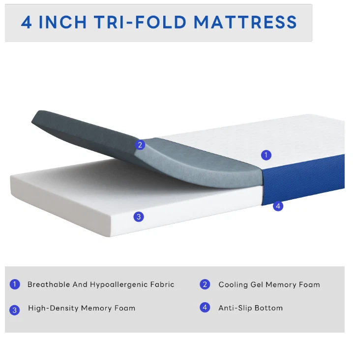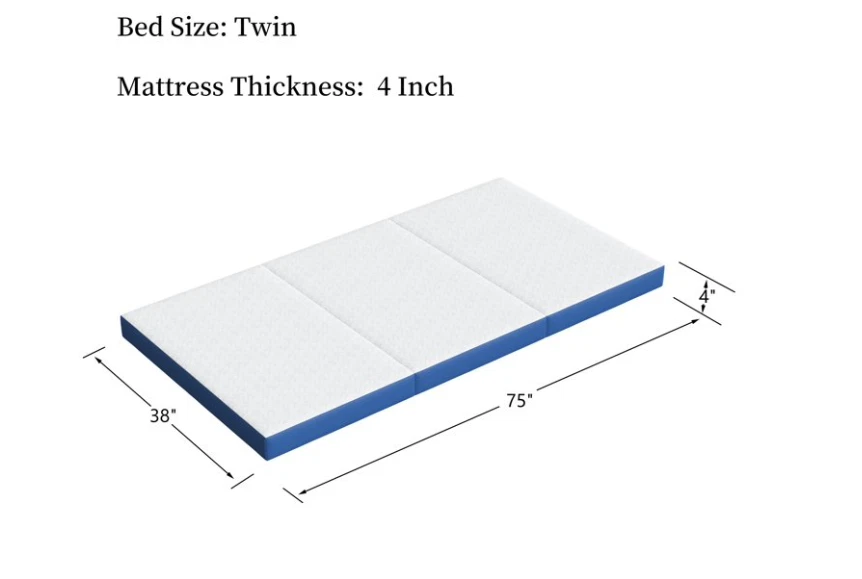 Experience the perfect blend of comfort and convenience with the Soges 4-Inch Tri-Folding Gel Memory Foam Portable Floor Mattress. Ideal for any bedroom setting, this twin-sized mattress boasts a medium firmness level, ensuring a balanced and supportive feel. Crafted with CertiPUR-US certified materials, it's a guarantee of quality and safety, wrapped in a soft, breathable fabric cover for added comfort.The mattress's compact design, with a package dimension of 26.26x9.76x9.49 inches, makes it an easy addition to any space. Weighing in at a mere 9.95 pounds, this portable mattress is designed for those who value both convenience and comfort, whether you're setting up a temporary sleeping arrangement or simply looking for an extra cushion on the floor. About this item 【Healthy Sleep】: The foldable mattress holds CertiPUR US Certification, and all other components are free from fiberglass or any harmful substances, providing a wholesome sleeping sanctuary for your loved ones. 【Stable and Easy to Maintain】: Our tri-fold mattress boasts a stay-put design with small bumps on the bottom for enhanced stability, even on wet surfaces. Additionally, the skin-friendly knitted cotton zipper cover is both easy to clean and machine washable, making maintenance quick and hassle-free. 【Comfortable & Durable】: Crafted with high-quality memory foam, this folding mattress contours to your body's shape, providing personalized support and relieving pressure points. Featuring a 2-layer design, including 2" gel memory foam and 2" high-density support foam, it keeps you cool and reduces body pressure all night. The medium firm feel offers additional comfort and ergonomic support. 【Versatile Usage】With its folding design, this mattress is perfect for any indoor or outdoor setting. It's ideal for accommodating guests, gaming with kids, traveling, camping, and practicing yoga in any room, mobile home, tent, or car. Whether you need a camping pad, travel mattress, guest bed, floor mattress, sofa bed, or car mattress, this folding mattress is an excellent choice. 【Space-Saving】Measuring 75" x 38" x 4" when laid flat and 25" x 38" x 12" when folded, our foldable mattress boasts a compact design that is perfect for small spaces and tight quarters. When not in use, simply fold it up and store it away – no need to sacrifice valuable floor space. Transform any room into a cozy retreat with our versatile foldable memory foam mattress. 【Warranty-Free】: We are confident that you will enjoy this sleep program and are committed to giving you the best night's sleep possible through our superior products. If your mattress is delivered defective or damaged, please contact our team for a replacement or refund. Please note that there is no trial period, opened mattresses cannot be returned.