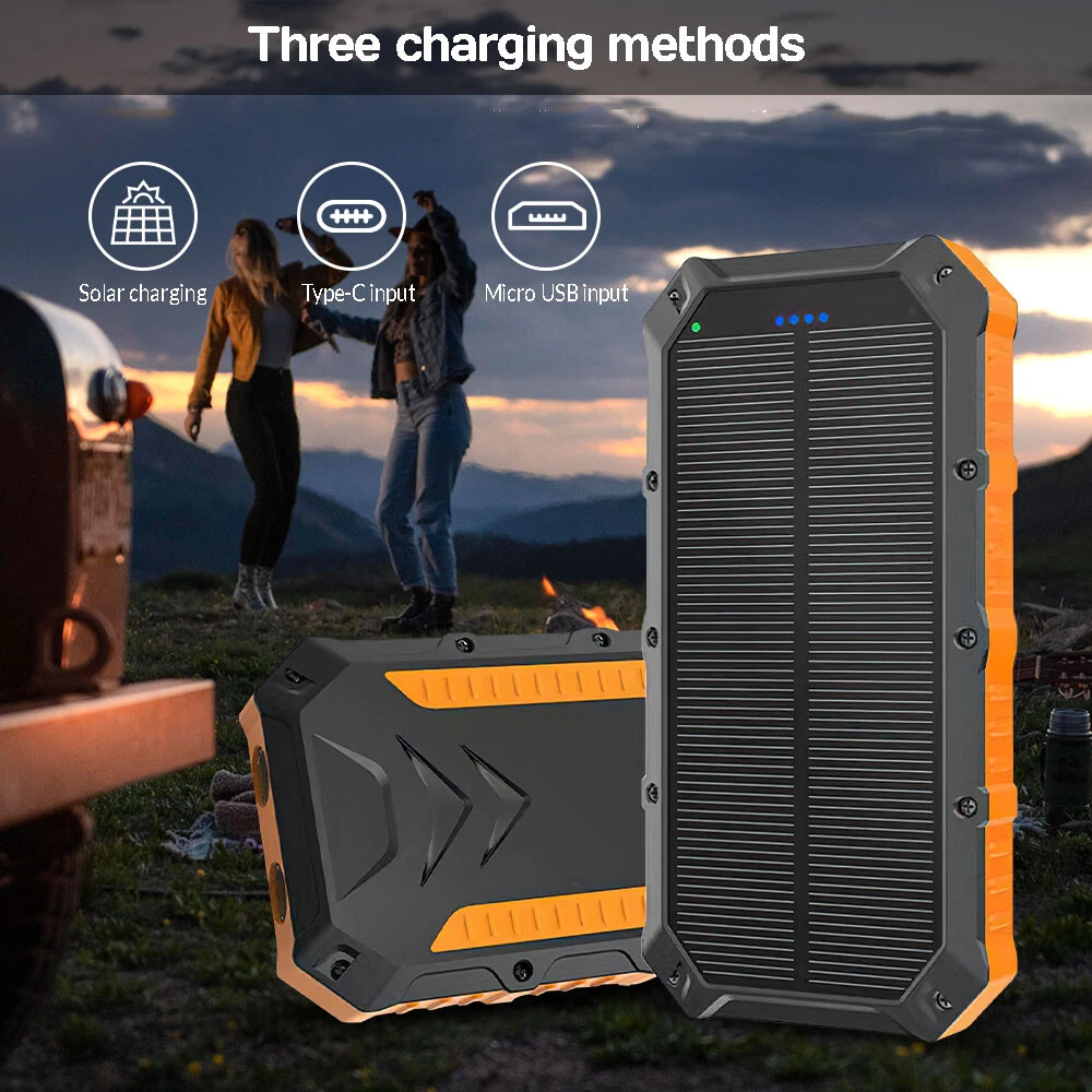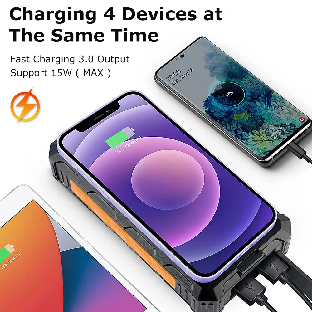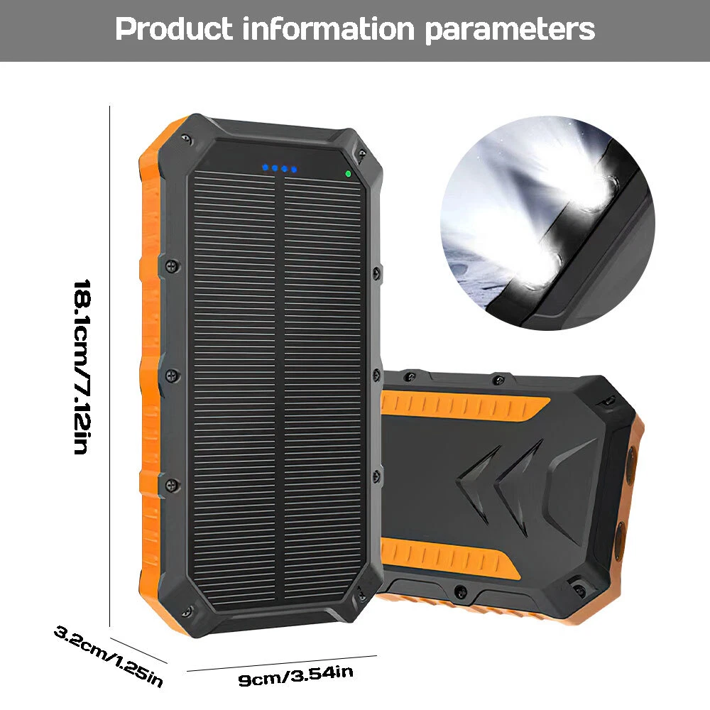 [Super Capacity] : The solar charger has a large battery capacity of 9800000mAh, and this solar charging treasure can charge your device many times. Super battery life allows you to get rid of the anxiety and worry about the exhaustion of equipment power anytime and anywhere. [Power Supply for 3 Devices at a time] : This solar cell phone charger is also equipped with four ports (Micro USB input, USB A&B output, USB C input/output), which provides 5V/3A high-speed charging to save time. It supports charging three devices at the same time. It can support QC3.0 fast charging protocol. Keep all devices active. Sharing with family and friends is perfect. [Two Different Charging Met hods] : The external battery charger can charge through the adapter and solar energy, so as to avoid the trouble of power failure. It is strongly recommended to charge through the wall socket in daily life, and use the solar charging function as an emergency backup solution. The USB cable in the package is only used to charge the solar charger. Charging other devices is not recommended, because incompatibility may reduce the charging efficiency. [R ugged Outdoor Design] : The charging treasure is made of sturdy professional ABS materials. This solar battery pack (IP64) is waterproof/shockproof/dustproof and can withstand harsh outdoor environment. It is equipped with double super bright LED lights, which is an essential tool for outdoor activities and family emergencies. The charging life is over 1600+ times, which is very reliable and durable. Specifications: Shell Material: PVC Battery Type: Lithium Polymer Battery Battery Capacity: 9800000 mAh Function: Support 15w Fast Charge Package Included: 1 x Solar Power Bank 1 x USB Cable