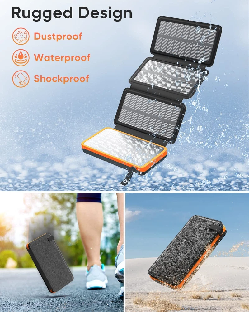 25000mAh High Capacity: The solar power bank charges up 6-8 times for a cell phone and 2.5 times for a tablet, great for a week-long trip. Large Solar Panels: This solar charger comes with 4 high-performance solar panels that can reach 6W in direct sunlight to keep your phone up and running even in places without electricity. Fast Charging: With the upgraded 15W output, the portable solar charger can fast charge an iPhone to 50% in 30 minutes. One USB C port and dual USB A ports achieve the simultaneous charging for three devices. Perfect for Outdoors: Built in bright flashlight; Compact and easy to hang it on your backpack to get sunlight, a must-have for various emergencies. 2.5X Recharging: The USB C port supports both input and output. A full recharge will take about only 8 hours with a PD fast charger (not included). Internal security system protects your device from damage.