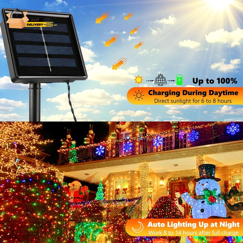 Store New Arrivals Add to Favorite View Feedback Contact Solar Christmas Lights, 2 Pack Total 144 FT 400 LED 8 Modes Waterproof Solar Christmas Lights Outdoor for Christmas Decorations (Multicolor) Description Light Source Type LED Style String Lights Number of Items 2 Power Source Solar Powered Number of Light Sources 200 Control Method Touch Theme Christmas Batteries Included? No Assembled Height 4.49 inches Controller Type Button Control Batteries Required? No Product Dimensions 5.94 x 5.55 x 4.49 inches Material Plastic Assembled Width 5.55 inches Seasons Christmas Is Discontinued By Manufacturer No Included Components 2 x 200 LED Solar String Lights, 2 x Solar Panel with Ground Stake Item dimensions L x W x H 5.94 x 5.55 x 4.49 inches Indoor/Outdoor Usage Outdoor Country of Origin China Light Color Multicolor Water Resistance Level Waterproof Item Weight 1.85 pounds Occasion Christmas Special Features Automatic On-Off Special Feature Automatic On-Off Color Multicolor Voltage 1.2 Volts Assembled Length 5.94 inches Size 200LED*2 Solar Powered and Auto On/Off: These multicolor solar Christmas lights use solar energy, eliminating extra electricity costs and battery replacements. The light sensor charges the lights by day and turns them on automatically at night 8 Modes and Memory Function: Use the On/Off and mode buttons to select from 8 lighting modes. The built-in memory chip saves your last mode setting, so you don’t need to reset it daily Waterproof: With an IP65 rating, these solar Christmas lights are designed to withstand all weather conditions, including heavy rain and snow, making them suitable for indoor and outdoor use Easy to Install: 2 Pack ,each string 72 ft (including 6.5 ft lead cable) with a solar panel and ground stake is ideal for wrapping around trees or decorating various outdoor spaces. Ensure the solar panel is exposed to sunlight Widely Used Solar String Lights: These solar-powered string lights are perfect for Halloween, Christmas, weddings, holidays, gardens, yards, lawns, fences, porches, trees, roofs, and decks Product Description Joomer Solar Christmas Lights 2 PACK 72ft 200 LED 8 Modes Solar String Lights Waterproof Solar Fairy Lights for Garden,Fence, Balcony, Outdoors Solar Christmas Lights 72ft 200 LED 8 Modes for Christmas , Garden, Patio, Fence, Balcony, Outdoors Decorations 8 Modes & Memory Function Just need to press the mode button and selects 8 different modes to satisfy your diverse needs. Super convenient. Build in Memory chip save your last modes setting and no need to reset mode every day. Light up your event/festival Ideal light for adding a fantastic atmosphere to your backyard, patio, gazebo, or lawn, or use it as a festoon to celebrate your wedding, anniversary, or graduation in style. Impress your bistro, cafe, or party guests with ambiance. Easy to install & Auto ON/OFF Built-in Lighting sensor technology, the string lights will light up automatically at dusk and automatically turns off at dawn. All you need to do is set it up and the lights will work automatically. Just hang the lights anywhere you like, set the panel somewhere it will get lots of sun, and use the stake to position it. NOTES How to check the string lights work during the Daytime? A. Completely cover the solar panel, and the String Lights will light up. B. If not, Leave the Solar Panel in the sun for an hour and then completely cover the solar panel again and it should light up. Make sure that the solar panel is NOT sheltered from the sun, because it needs to absorb enough energy from the sun. It is ONLY designed to be protected from rain. Please do NOT immerse it in the water. The solar string lights have a memory function . It will return to your previous setting when you turn it off and turn it on again. The solar panel is with light sensor feature ,so that the string lights can automatically turn off at dawn and turn up at dusk. High Efficiency Solar Panel & Adjustable Design With less charging time and more working time, a full charge of 6 hours will work more than 8 hours. No extra electricity consumption occurred Adjustable design enables solar panels to absorb sunlight energy efficiently. 200 LED Christmas solar string lights Solar-powered led light strings, low voltage power, non-plug-in, no utility energy costs. Energy-saving outdoor solar lights have a high energy conservation rate. Lighting sensor technology: the string lights will light up automatically at dusk and automatically turns off at dawn. Waterproof: The solar Christmas lights can withstand all kinds of weather(IP65), including heavy rain and snow, perfect for indoor and outdoor decorations. What's in the box? 2 x 200 LED Solar String Lights 2 x Solar Panel with Ground Stake 1 x User Manual ABOUT US We offer the best prices around on high quality products. Our E-store includes media such as books, movies, music and games while offering electronics, toys, sporting apparel, clothing, tools, general home, garden items and more. SHIPPING We are always working hard to ensure your package arrives as soon as possible. Please understand that some factors like weather, high postal traffic, and the performance of shipping companies are outside of our control. We offer free shipping to the lower 48 states and ship within 2 business days of payment, usually sooner. We do not accept P.O. Boxes. Please provide a physical address. For shipping outside of the continental USA, we only use eBay's Global Shipping Program.The item is shipped to KY and then sent to the rest of the world. International customers are responsible for all duties and taxes. Continue to check out in order to calculate costs for shipping the item to your country. Messages regarding eBay's Global Shipping Program MUST be directed at eBay EXCLUSIVELY. RETURNS We offer a 30-Day Return Policy on items which you are not completely satisfied with. You have the option for a full-refund or an exchange of the item. No returns are available on items sh