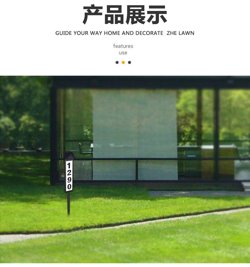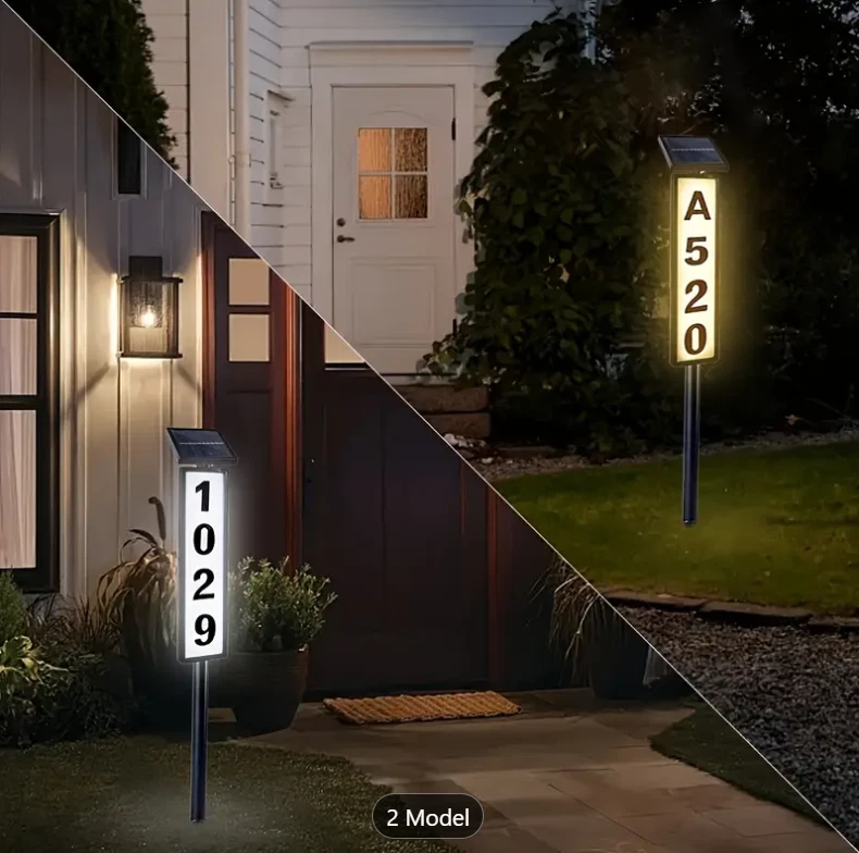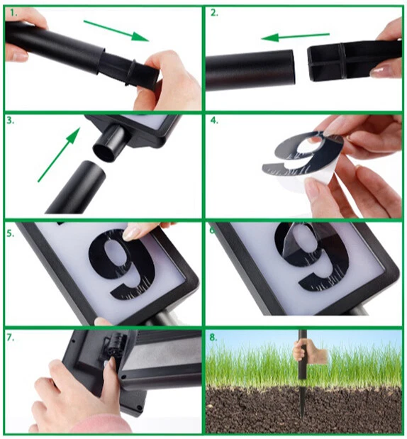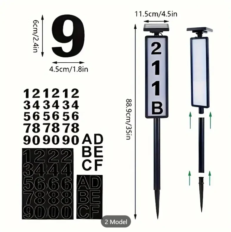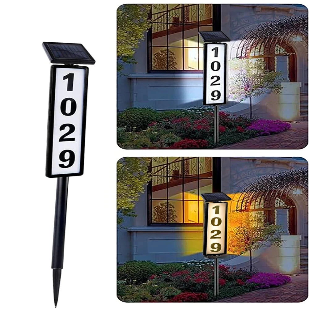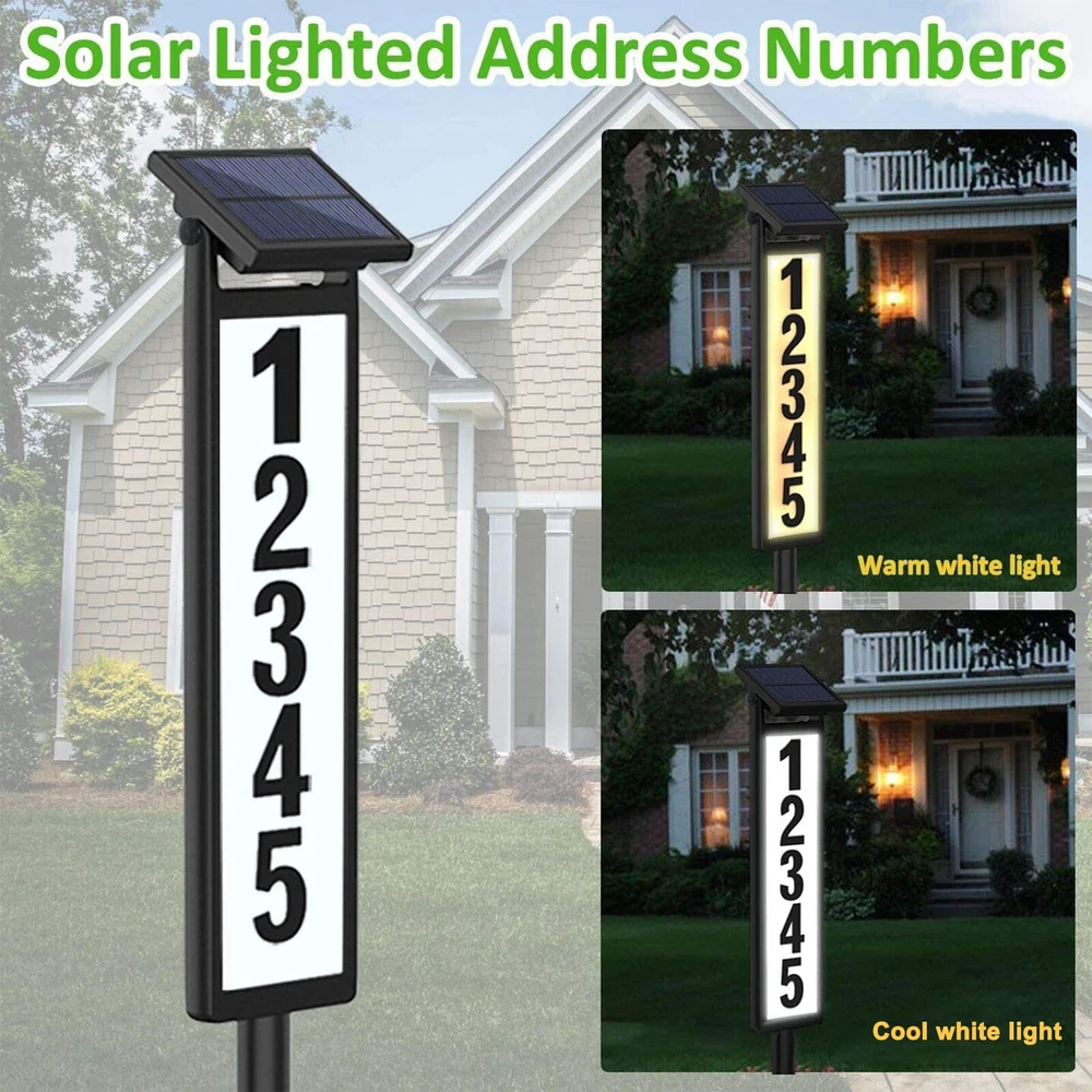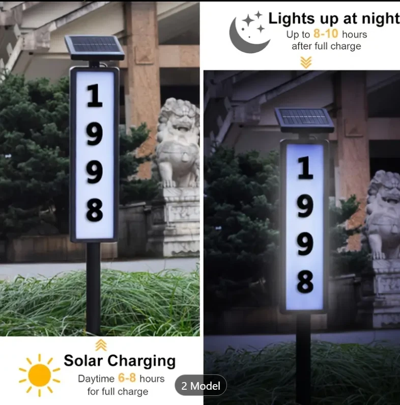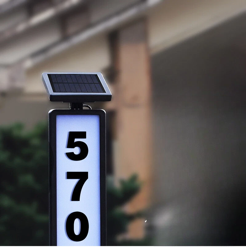 1pc New Solar Digital Door Sign Light, Decorative LED House Number Light, For Houses, Villa Indicator Lights, Solar Powered [Height 35 Inches] Specification: Control Method: Light Sensor Embellishment: Other Embellishments Finish Type: Polished Special Features: Low-voltage Fixture Type: Detachable Light Fixture Form: Floodlight Lamp Shade Material: Acrylonitrile Butadiene Styrene Included Components: LED Lens Material: Acrylonitrile Butadiene Styrene Power Supply: Solar Charging Remote Control Included: No Battery Properties: Solar Battery Solar Battery: 2* 600mah Nickel Battery Solar Panel:2v 100mah Polysilicon charging time:6-8h Lighting Time:8h Features: Solar Powered: This doorplate light is powered by solar energy, making it eco-friendly and energy-saving. It charges during the day and lights up automatically at night. Illuminated House Numbers: The light illuminates your house numbers, making it easy for visitors, delivery drivers, and emergency services to find your home even in the dark. Ground Stake Sign: The light comes with a ground stake, allowing you to easily install it in your yard or garden. It's a perfect way to display your house number and add a stylish touch to your outdoor space. Waterproof: The doorplate light is designed with a waterproof feature, making it durable and suitable for outdoor use, even in rainy or snowy weather. Warm Tips: (1)Please note, the solar light is designed to work when the environment gets dark. The selected location should not benear a light source such as porch light or street light,as these might keep the solar lights from automatically turning on. (2)Although the battery has been charged by the manufacturer, the electric charge may have dropped by the time consumer receives the product, Please let the solar light charge for a full day for maximum performance. (3)The surface of the solar panel must be kept clean. Dust accumulated on the surface will reduce the charging efficiency. (4)If the solar light stops working after it has been used for a long time,the battery may need to be replaced. You may openthe battery cover and replace it with a new rechargeable battery. (5) If the solar light does not tum on automatically at night after 6 hours of charging during the day, please check the followings. Make sure the power switch is at the "W* or “C” position. Check the battery and make sure the battery contact the terminal securely. Package List: 1 * Solar house number light
