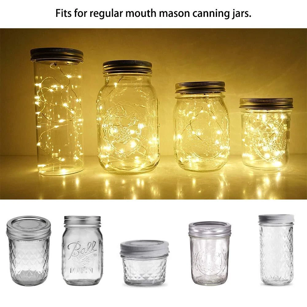 DIY Your Own Garden Decor Lights • With the mason jar solar lights, you could make full use of your mason jars to DIY beautiful garden decor lights, deck decor lights and patio decor lights. • Hang them on the tree, when you have a garden party or wedding night, these maosn jar night lights will definitely create beautiful and warm ambient beyond your expectation. • Put them in your patio or along the pathway, they will provide enough accent lighting for you. • Decorate your house indoor or outdoor as well, good choice when you need some sweet atmosphere. <2019 Upgraded Model> - Rust resistant layer, more durable. - Larger solar panel, charge more efficiently. - 15 LED bulbs, brighter than 10 bulbs old version. - Reinforced waterproof design, more durable in rough weather. Warm Notice: Light color: Warm White Led Light Quantity: 15 Charging Time: full recharge need 6 hours. Working time: 5-7 hours when the battery fully charged Lid Diameter Size: 2.76 inch(70mm)/Insert 2.17 inch(55mm). If you receive the lid lights and find it is not bright, please put the lids under the sun for charging at first. Please notice that each lid has a switch below, slide it to turn on before charging by solar. Package included: 6 x Solar mason jar lid lights(AAA Rechargeable Battery Included) 6 x Stainless Steel Wire Hangers Tips: Mason Jars Not Included is a brand dedicated in decorative lights, our factory has 5 years experience in lights craft. We always listen to our customers’ advice and improve our product. We believe that our products can bring you a good shopping experience. UPDATED MASON JAR LID LIGHTS - Cozy warm Lights, with 15 micro LED, much brighter than 10 LED jar lights. Larger solar panel, charge more efficiently. The edge of the lid uses rustproof material instead of cheap alloy, you would find it more durable in humid weather. SOLARPOWERD - Press the button to switch it on and expose them to direct sunlight, a built-in light sensor ensures that it turns on at dusk and turns off by dawn automatically. Generally charge in the sun 6-8h will light up 8-12h. If there is not enough sunlight in your area, you can also place one AAA battery to make it work. INDOOR & OUTDOOR - You can use this jar lid light in your bedroom/kitchen/living room to create a comfortable environment, besides, due to the O-shape seal ring design, this jar lid light is 100% waterproof! You can rest assured to put your shinning mason jar in your yard/garden, no need to worry about the rain. DIY WITH CREATION - Enjoy decorating your Mason jar with your creation! Shape the silver string lights as you like and fill mason jars with fruit, sand, dried flowers, shells, pebbles, berry sprigs, seasonal things etc., let your imagination run wild. WHAT YOU GET - Pack of 6 units of Mason Jar LED String Lights Lid with 6 hangers. A very Good Deal to order. LED lights can last 50,000 hours under regular using, with 12 months Quality !