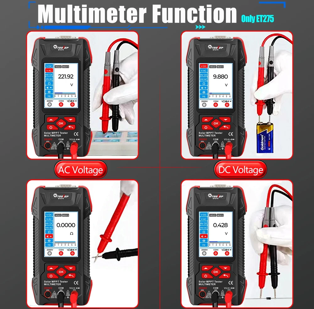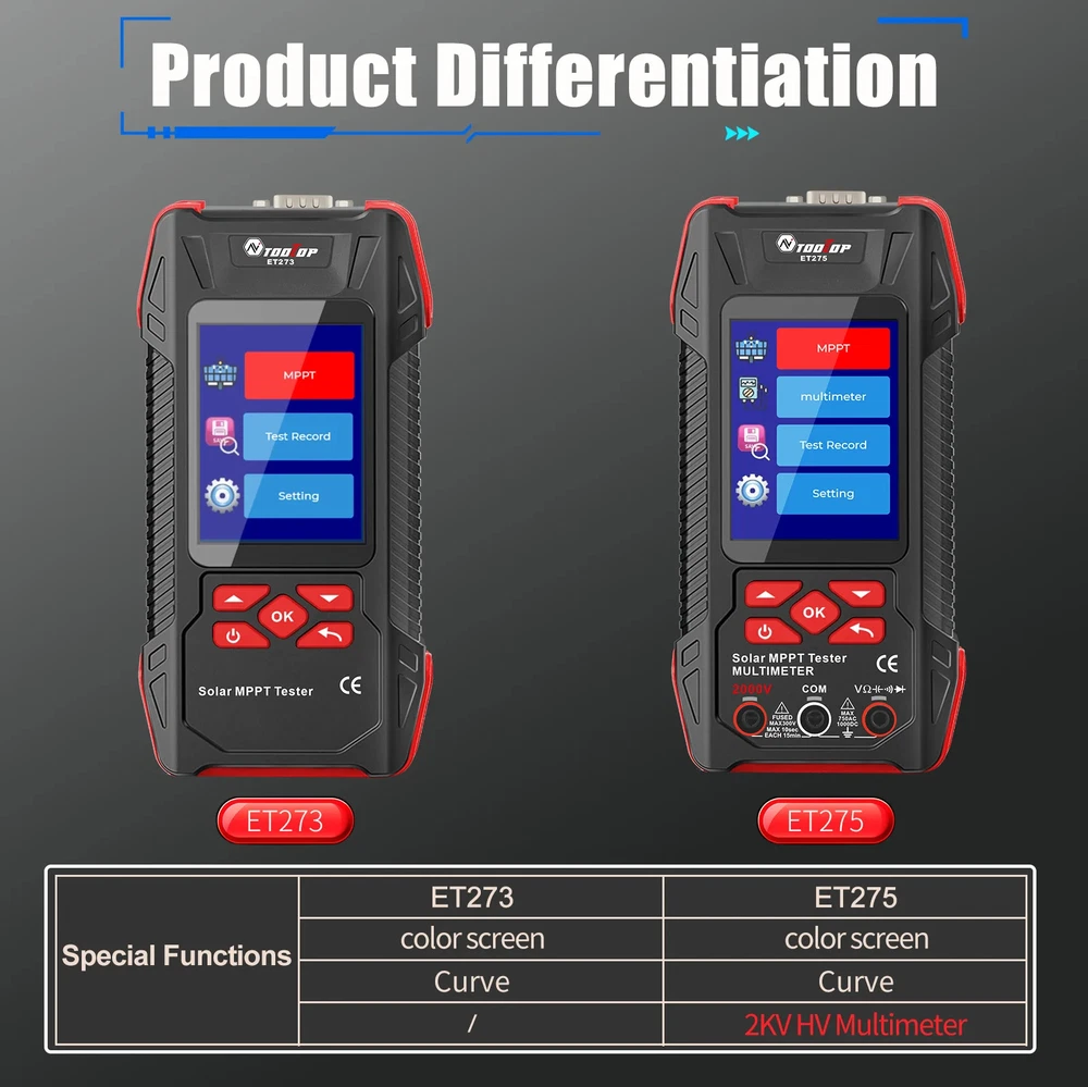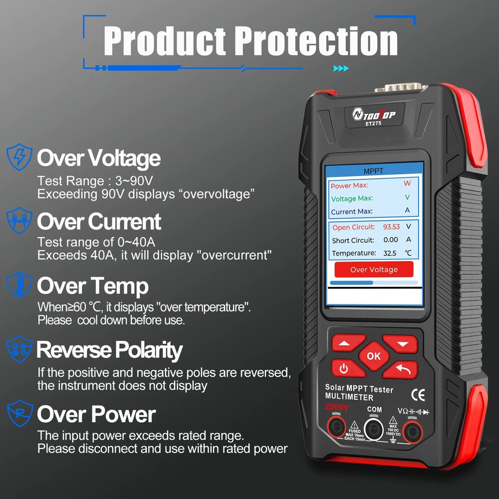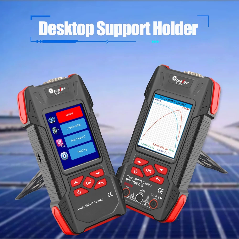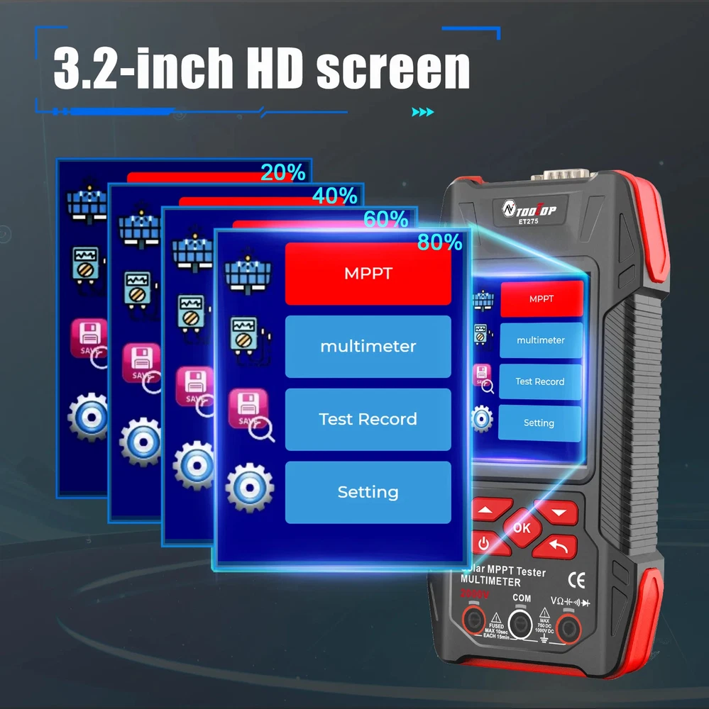 TOOLTOP New 2000W Solar MPPT Power Tester 3.2 Inches 2KV 60000 Counts Multimeter Photovoltaic Solar Power Meter Two models choose Features: Maximum Power Point Tracking (MPPT), including MPPT test data logging and MPPT curves Support testing of 2000W high-power photovoltaic modules measurement Accurately measures key parameters such as Pmax, Voc, and Isc (accuracy ±1.5%) Comprehensive protection against overvoltage, overcurrent, reverse polarity, and overtemperature Large 3.2-inch with 240*320 resolution display, showing all measurement results on one screen Built-in high-capacity 1500mAh rechargeable lithium battery 2000V AC/DC high-voltage measurement, 60,000 counts digital multimeter ( ET275 ) Suitable for PV module production, acceptance, and maintenance, enabling rapid fault diagnosis. Other functions: automatic test data saving, automatic shutdown, brightness, and sound settings Specifications: Solar Voltage: 3~90.00V , ±1.5%+5 Solar Current: 0~40.00A , ±1.5%+5 Solar MPPT Power: 0~2000.0W , ±1%+5 Sampling point: 1000 digit group Voltage Curve: Color/Green Current Curve: Color/Blue Power Curve: Color/Red Data record:100 Display: 3.2 inches,240*320 resolution interface: DB9 Protect: Over voltage/Over reverse polarity/over current/over temperature protect Multimeter ( Only for ET275 ) Display: 60000 counts High DCV: 2000V(±0.8%+0.8) High ACV: 2000V(±1.5%+0.5) DC Voltage:600mV~1000V(±0.5%+0.3) AC Voltage:600mV~750V(±0.8%+0.5) Resistance: 600.00Ω~60MΩ(±1%+0.6) Capacitance:6.0000nF~60MF(±2%+0.6) Frequency: 6.0000Hz~6Mhz(±1%+0.1) Countinuity test: <10Ω buzzing Diode test:support Other Parameter Screen: 3.2 Inches color screen, resolution 240*320 Languages: Chinese, English, German, French, Spanish Battery: Built-in 1500mA.H rechargeable lithium battery (with protection circuit) Power: 5V/2A/10W or higher required; ( charger not included ) Low Battery Detection Function: support Auto Power Off: support ET273 Package List: 1 x Solar MPPT Tester 1 x Solar Test Clip 1 x USB Cable 1 x Storage Bag 1 x English User Manual ET275 Package List: 1 x Solar MPPT Tester 1 x Solar Test Clip 1 x Multimeter Test Leads 1 x USB Cable 1 x Storage Bag 1 x English User Manual Shipping policy 1. We will send out your order within 3 working days, the tracking number will be updated to you once your order has been shipped. Standard shipping will take 8-12 business days for delivery and expedited shipping takes 2-7 business days. If there is any delay, it may be caused by bad weather or custom inspection which is not in our control, but don't worry, we will keep to follow your order until final delivered. 2. We try our best to make you get desired products as soon as possible. In case you receive wrong products, please contact us timely for exchange or refund. If damaged, please refuse to sign and send us the message ASAP. 3. Shipping cost does not include DHL/FedEx /UPS Remote area service charge , buyer will afford USD45 if your address belongs to it ,we will contact you after receive your order. Warranty&Return Policy: 1.-We encourage all customers to communicate with us through eBay messages. If you have any questions or comments whatsoever regarding our products function or listing questiones, we are waiting to hear from you 2.-A 1 year warranty is offered for this product.If the product malfunctioned under proper usage per instructions manual within the warranty period, please contact us to obtain shipping instructions and send it back at your shipping costs. Import Taxes or Duties 1.- Import duties, taxes and other charges happened in your side are not included in the item price. These fees not included in our price. 2.- Please check with your country's importing policy about the duties and charges before purchase. Feedback 1.- As your feedback is very important to our development, we sincerely invite you to leave positive feedback for us if you are satisfied with our product and service. 2.- Please contact us before you leave a neutral or negative feedback, we will try our best to solve the problems.