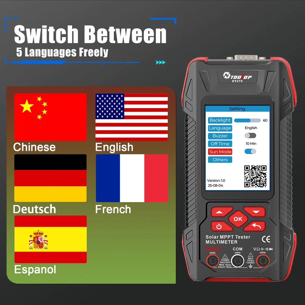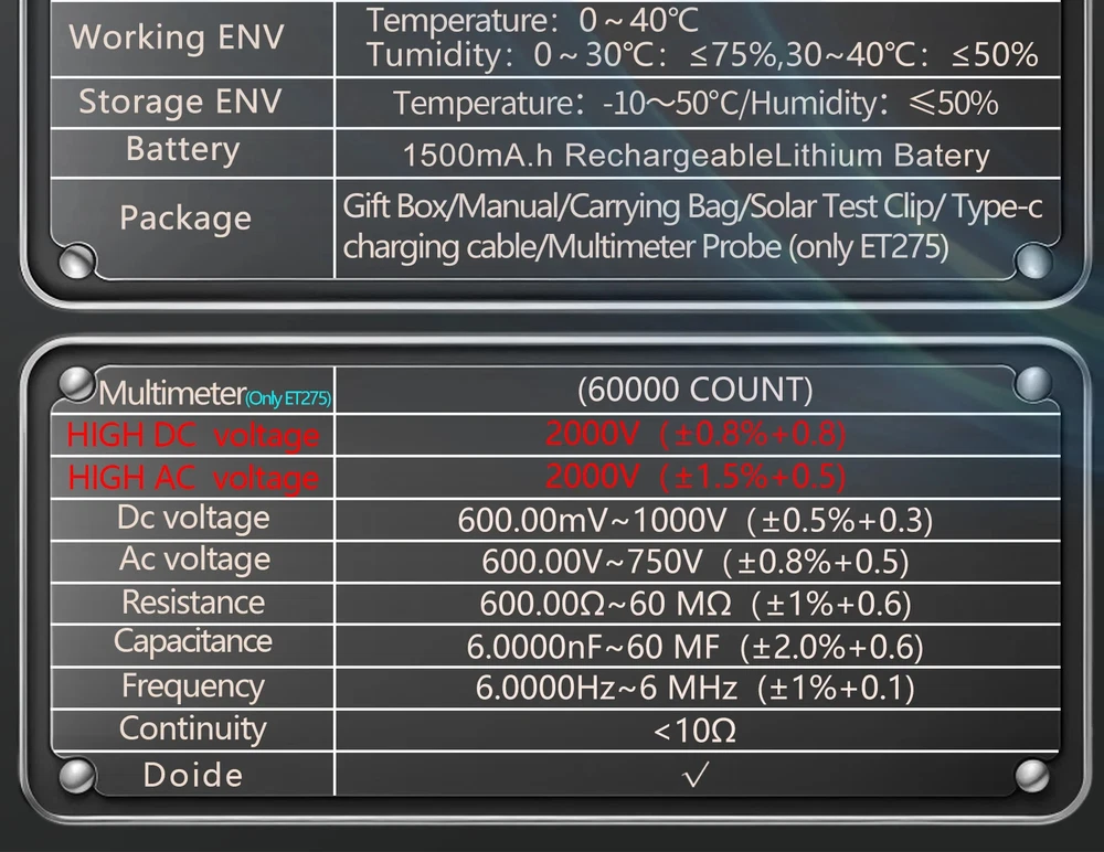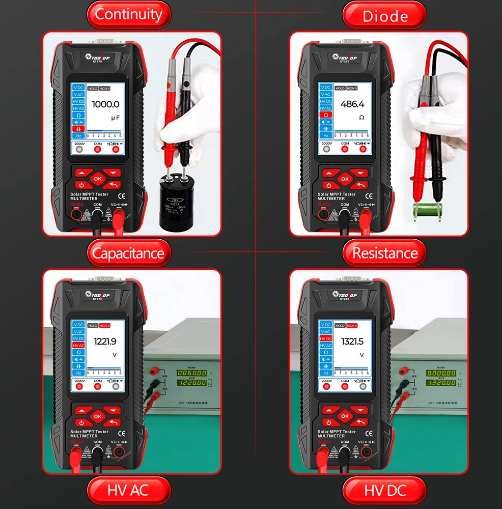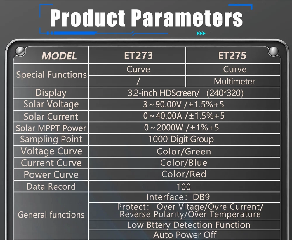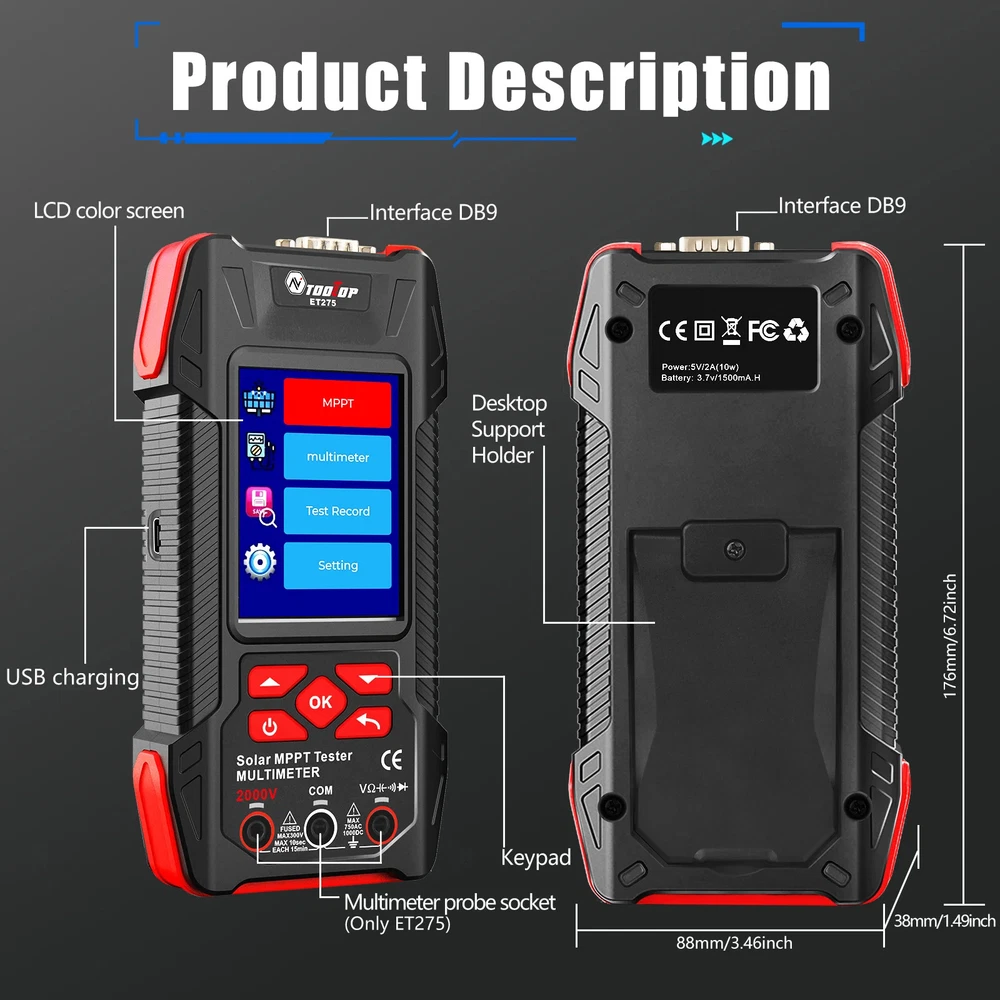 TOOLTOP New 2000W Solar MPPT Power Tester 3.2 Inches 2KV 60000 Counts Multimeter Photovoltaic Solar Power Meter Two models choose Features: Maximum Power Point Tracking (MPPT), including MPPT test data logging and MPPT curves Support testing of 2000W high-power photovoltaic modules measurement Accurately measures key parameters such as Pmax, Voc, and Isc (accuracy ±1.5%) Comprehensive protection against overvoltage, overcurrent, reverse polarity, and overtemperature Large 3.2-inch with 240*320 resolution display, showing all measurement results on one screen Built-in high-capacity 1500mAh rechargeable lithium battery 2000V AC/DC high-voltage measurement, 60,000 counts digital multimeter ( ET275 ) Suitable for PV module production, acceptance, and maintenance, enabling rapid fault diagnosis. Other functions: automatic test data saving, automatic shutdown, brightness, and sound settings Specifications: Solar Voltage: 3~90.00V , ±1.5%+5 Solar Current: 0~40.00A , ±1.5%+5 Solar MPPT Power: 0~2000.0W , ±1%+5 Sampling point: 1000 digit group Voltage Curve: Color/Green Current Curve: Color/Blue Power Curve: Color/Red Data record:100 Display: 3.2 inches,240*320 resolution interface: DB9 Protect: Over voltage/Over reverse polarity/over current/over temperature protect Multimeter ( Only for ET275 ) Display: 60000 counts High DCV: 2000V(±0.8%+0.8) High ACV: 2000V(±1.5%+0.5) DC Voltage:600mV~1000V(±0.5%+0.3) AC Voltage:600mV~750V(±0.8%+0.5) Resistance: 600.00Ω~60MΩ(±1%+0.6) Capacitance:6.0000nF~60MF(±2%+0.6) Frequency: 6.0000Hz~6Mhz(±1%+0.1) Countinuity test: <10Ω buzzing Diode test:support Other Parameter Screen: 3.2 Inches color screen, resolution 240*320 Languages: Chinese, English, German, French, Spanish Battery: Built-in 1500mA.H rechargeable lithium battery (with protection circuit) Power: 5V/2A/10W or higher required; ( charger not included ) Low Battery Detection Function: support Auto Power Off: support ET273 Package List: 1 x Solar MPPT Tester 1 x Solar Test Clip 1 x USB Cable 1 x Storage Bag 1 x English User Manual ET275 Package List: 1 x Solar MPPT Tester 1 x Solar Test Clip 1 x Multimeter Test Leads 1 x USB Cable 1 x Storage Bag 1 x English User Manual Shipping policy 1. We will send out your order within 3 working days, the tracking number will be updated to you once your order has been shipped. Standard shipping will take 8-12 business days for delivery and expedited shipping takes 2-7 business days. If there is any delay, it may be caused by bad weather or custom inspection which is not in our control, but don't worry, we will keep to follow your order until final delivered. 2. We try our best to make you get desired products as soon as possible. In case you receive wrong products, please contact us timely for exchange or refund. If damaged, please refuse to sign and send us the message ASAP. 3. Shipping cost does not include DHL/FedEx /UPS Remote area service charge , buyer will afford USD45 if your address belongs to it ,we will contact you after receive your order. Warranty&Return Policy: 1.-We encourage all customers to communicate with us through eBay messages. If you have any questions or comments whatsoever regarding our products function or listing questiones, we are waiting to hear from you 2.-A 1 year warranty is offered for this product.If the product malfunctioned under proper usage per instructions manual within the warranty period, please contact us to obtain shipping instructions and send it back at your shipping costs. Import Taxes or Duties 1.- Import duties, taxes and other charges happened in your side are not included in the item price. These fees not included in our price. 2.- Please check with your country's importing policy about the duties and charges before purchase. Feedback 1.- As your feedback is very important to our development, we sincerely invite you to leave positive feedback for us if you are satisfied with our product and service. 2.- Please contact us before you leave a neutral or negative feedback, we will try our best to solve the problems.