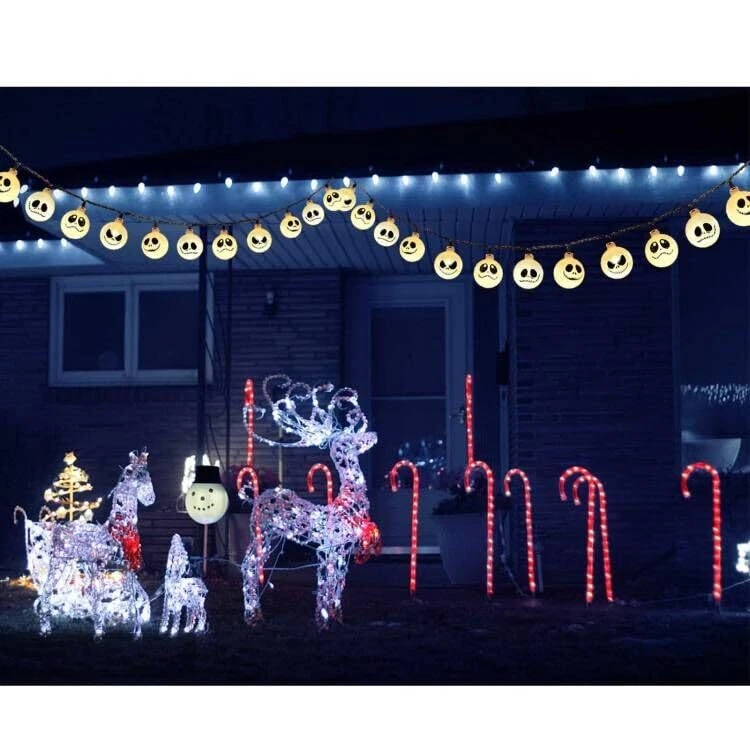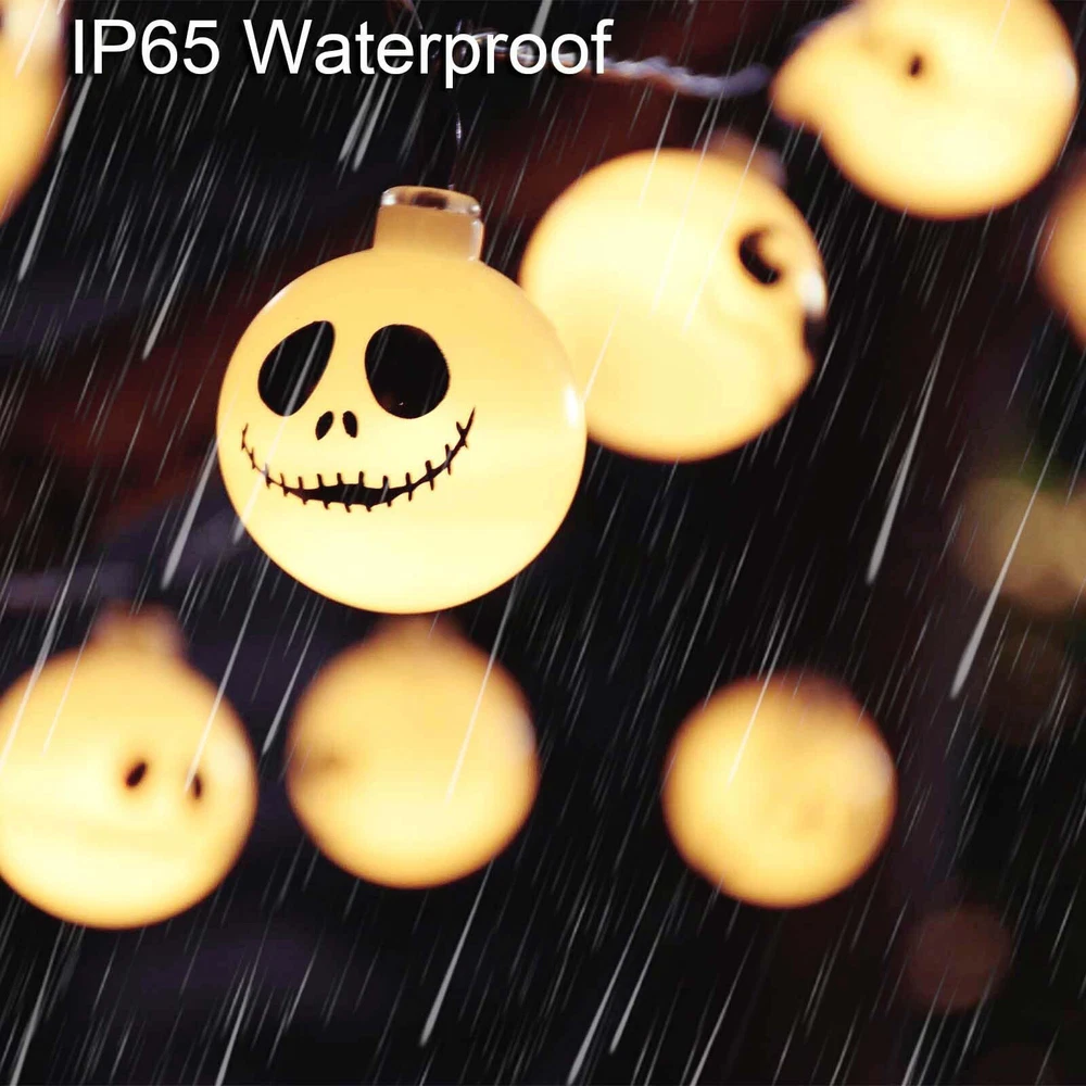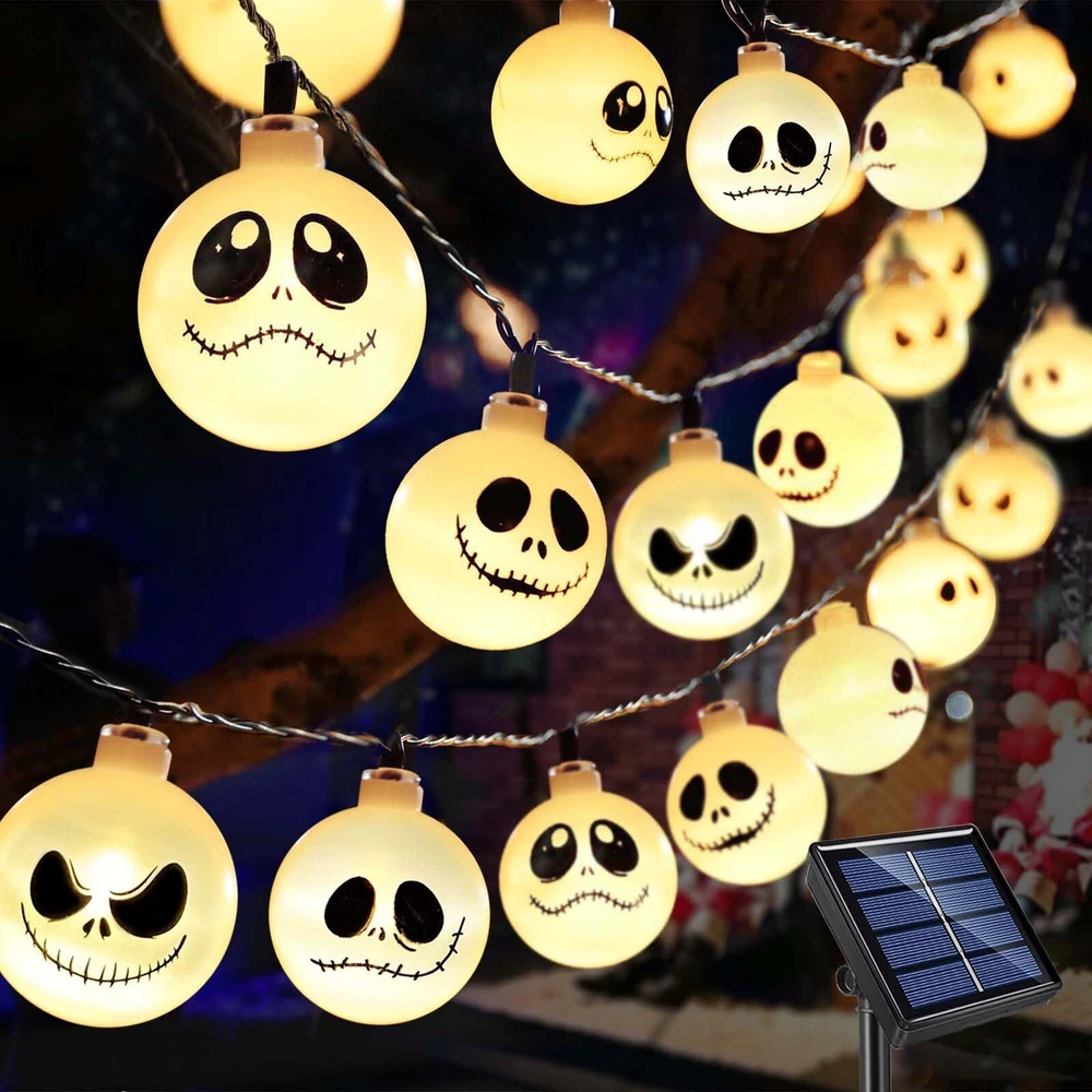 Upgraded Solar Nightmare Before Christmas Halloween Decorations Lights, 8 Modes Outdoor Waterproof Solar Powered Christmas Halloween String Lights for Garden Patio Yard Xmas Tree Decor(30 LED) 【Unique Design】 - these night before Christmas decorative string lights are with 4 Different pattern, which will be a lovely addition to your tree for Halloween, Christmas or any other occasion. It completed our nightmare before Christmas theme. 【30 LEDs Nightmare String Lights 】 - The set of 30 Led Lights, 26.25ft total length. can be hung in your home, porch, front path, garden or yard. This is the perfect addition to your christmas decorations. 【Solar Powered Auto On/Off】- Solar-powered, no outlet needed, no electricity charge, Built-in light-sensor, auto on at nights and recharged in daytime. 【Upgraded Lasting Long Solar Panel】- new designed version, larger solar panel, charging for 6-8 hours, can be last for 8-10 hours. (ensure the switch is in “ON” position) 【Waterproof & 8 Modes】- IP65 waterproof. 8 different lighting options can set different lighting patterns, fit different occasions, moods, feelings. christmas decor outdoor lights. 【Widely Use】- idea for outdoor halloween christmas decor, perfect for outdoor porch, railing, front yard, gate, outside tree, balcony, golf cart, deck, window, walkway, fence. Great Christmas gift idea.