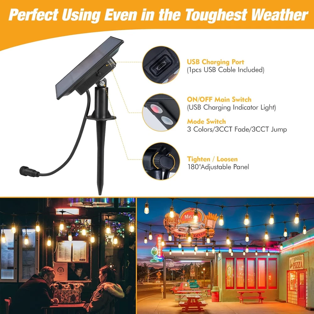 Store New Arrivals Add to Favorite View Feedback Contact Solar String Lights Remote Control,35Ft Dimmable Solar String Lights Outdoor, 10 Shatterproof Solar Patio Lights, Ambience on Your Garden Backyard Description Item model number 35FT Light Source Type LED Style Modern Power Source Solar Powered Number of Light Sources 10 Control Method Remote Theme Space Style Number 35FT Controller Type Remote Control Occasion Type Christmas Additional Features Solar Powered, Dimmable, Shatterproof Package Dimensions 10.35 x 6.26 x 6.1 inches; 3.15 Pounds Indoor/Outdoor Usage Outdoor Material Type Plug Light Color White Water Resistance Level Waterproof Occasion Christmas Special Feature Solar Powered, Dimmable, Shatterproof Bulb Shape Size ED28 Color Temperature 2.7E+3 Kelvin Color White (2700K, 4000K, 5000K) Indoor Outdoor Usage Outdoor Voltage 1.2E+2 Volts Included Components remote control, spare bulbs Style Name Modern Size S14 35 FT 【Upgraded 3 colors string lights with FADE JUMP function】 This is an awesome string lights you’ve never met!! Built by the latest LED technology, 2700K 4000K 5000K color lights are all in one string- From warm white to daylight white for choosing, our LED patio string lights can be customized for any arrangements like birthday party, family/friends reunion or wedding reception. 【Fully dimming by included remotes】 No need to buy extra dimmer anymore!! These LED bistro string lights can be dimmed by included remote controller from 25%-100%, you can pick up the suitable brightness for all your occasions. Also there’s always a back-up for you as we equip each string lights with 2pcs remote controllers, never worried for the remote missing 【Commercial-grade & waterproof IP65】 Made of Industrial grade casing, thicker flexible cord and Shatterproof plastic bulbs, our string lights are designed to withstand the wear and tear of year-round outdoor use; Layers of insulation enhance the strand to withstand extreme temperatures, rainy, windy, or damp climates, perfect for long-time indoor/outdoor use 【Easy installation for any occasions】 Use cup hooks, guide wires, or zip ties with the built-in loops to hang the outdoor lights perfectly, enlighten any event or create a festive flair within minutes. Each strand contains 15 hanging E26 base S14 bulbs spaced 3 feet apart. Link up to 3 strands max. The patio lights are still cool after long period of use with 24V safe low voltage 【Your satisfaction is our priority】 Package contains 15+3pcs LED Bulbs, 1 pack 48ft stands, 2pcs remote controllers and user manual. We proudly stand behind all of our products 100% with confidence and offer a full 12-Month warranty. If you are not fully satisfied for any reason, please email us; we are committed to making it right for you in 24hrs. Product Description Why choose Auroraworld Outdoor String Lights? Auroraworld Outdoor String Light is an ideal light for adding comfortable atmosphere, give an inviting warm glow that will bring any room or party to life. Perfect for any event or everyday use, illuminate your backyard, patio, gazebo, or use as a festoon to celebrate your wedding, anniversary, or graduation in style. Impress your bistro, cafe, or party guests with ambiance. End-to-end Connection Each strand has end to end connector, and you can easily connect up to 60 strands, which is long enough for all kinds of activities. Shatterproof Plastic bulbs of string lights enable sustainable, durable, and long-lasting design, no worry from glass shards, especially for outdoor use Waterproof IP65 waterproof, outside string lights can withstand extreme temperatures, rain, and windy or humid climates, which is durable for long-term use. It is the best choice for outdoor lighting or decoration. ABOUT US We offer the best prices around on high quality products. Our E-store includes media such as books, movies, music and games while offering electronics, toys, sporting apparel, clothing, tools, general home, garden items and more. SHIPPING We are always working hard to ensure your package arrives as soon as possible. Please understand that some factors like weather, high postal traffic, and the performance of shipping companies are outside of our control. We offer free shipping to the lower 48 states and ship within 2 business days of payment, usually sooner. We do not accept P.O. Boxes. Please provide a physical address. For shipping outside of the continental USA, we only use eBay's Global Shipping Program.The item is shipped to KY and then sent to the rest of the world. International customers are responsible for all duties and taxes. Continue to check out in order to calculate costs for shipping the item to your country. Messages regarding eBay's Global Shipping Program MUST be directed at eBay EXCLUSIVELY. RETURNS We offer a 30-Day Return Policy on items which you are not completely satisfied with. You have the option for a full-refund or an exchange of the item. No returns are available on items shipped outside of the USA. PAYMENT We accept PayPal. CONTACT US This page content is yet to come Please ad us to your favorite seller and visit again later Thank You CUSTOMER SATISFACTION We try our very best to make sure every customer is completely satisfied. If there's a problem, message us! We're happy to help. WE ACCEPT Copyright © 2021 AutoDS. | All Rights Reserved