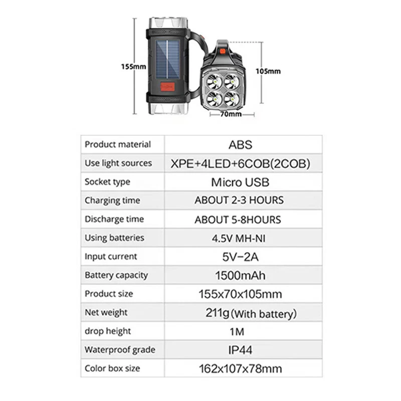 Electric Callus Remover Foot Sander Rough Feet Rechargeable Dead Skin Tools USA 11.98 USD 12.99 USD Free shipping 8% off Super Bright 990000LM Rechargeable LED Headlamp Head Light Torch Flashlight Lamp 12.98 USD Free shipping 19"Men Laptop Backpack Bag Anti-Theft Extra Large Travel School Waterproof Bag 25.59 USD Free shipping Hair Curling iron Short And Long Hair Ceramic Coating Two-Temperature Control 13.99 USD 0.99 USD Cordless Massage Belt Electric Heated with Back Support Waist Vibration Massager 29.59 USD Free shipping Concealed Carry Fanny Holster Tactical Military Pistol Waist Pouch Gun Bag 12.33 USD 12.98 USD Free shipping 5% off Rechargeable Spotlight,Spot Lights Hand Held Large Flashlight 1000,000 Lumens 27.98 USD 2.66 USD Solar Portable LED Flashlight USB Rechargeable Camping Tent Light Lantern Lamps 10.99 USD Free shipping Portable Plasma Pen Mole Removal Dark Spot Remover Skin Wart Tag Tattoo Beauty 16.5 USD Free shipping 36"in Tactical For Gun Bag Gun Padded Soft Case Carbine Hunting Black Backpack 24.29 USD 26.99 USD 0.99 USD 10% off 50PCS GOLF Shoe Spikes Replacement Studs Soft Fast Twist Cleat For Footjoy USA 10.99 USD 0.99 USD TWS Audifonos inalambricos 5.3 Bluetooth Auriculares For iPhone Samsung Android 9.99 USD Free shipping Solar Power 300W LED Torch USB Rechargeable Light Outdoor Camping Tent Lamp Bulb 12.99 USD Free shipping Tactical Helmet Cover for Fast MH PJ BJ Helmet For Airsoft Paintball Helmet Cove 4.99 USD Free shipping Bicycle Motorcycle Mount Invisible Selfie Stick For Gopro Insta360 X3 X4 Max 20.99 USD Free shipping 1000 Lumens Premium Rechargeable LED Flashlight Stainless Steel Pen Light 6.99 USD Free shipping SAFE & SECURE SHOPPING SATISFACTION GUARANTEED FAST SHIPPING Store Categories Store Categories Other Auto & motorcycle parts Headlamp & Flashlight Camping & Hiking Hunting Equipment Cycling Equipment 3C Tools Promotion Hot Sales!!! Cars & Motorcycle Accessories Electronic Product Car Light You may also like Solar Tent Light Rechargeable LED Flashlight Camping Power Torch Lantern Lamp Product Description Description : Solar Charge & USB Charge : 2 charging modes make it easier and faster for you to use this solar flashlight. 4 core headlight long shot. Solar Charge: Equipped with solar panels, as long as there is weak sunlight, it can be quickly charged at any time. USB Charge: There is an USB charging port on the side of the flashlight, which can be connected to a computer, car, power bank and power outlet. 2 Independent Switches & 4 Light Sources : Switch 1 control front lamp white light Side lamp COB white light. Switch 1 control rear lamp white light COB side lamp warm light. You can change the light source to suit your needs, making your outdoor activities more efficient and comfortable. Super Bright & Multistage Heat Dissipation : This product can be super bright in very dark places and is a good partner for any outdoor activity. In addition, the flashlight's grip is also convenient for you to hold it while walking, exploring is no longer difficult, no fear of rain and snow outdoors. IP44 Waterproof & High Quality Material : The searchlight is equipped with a thick waterproof ring on the outside and built-in circuit insulation protective, which can be used normally even in bad weather such as rain and snow. Made of ABS material with non-slip handle, the flashlight is light and portable. A lamp in hand, no fear of wind and rain, so you can use it with peace of mind. Wide Application : This solar flashlight is ideal for hiking, camping, hunting, exploring, dog walking, biking and other outdoor activities. And can be used as a searchlight or warning light in bad weather outdoor activities. It can also be used to charge other items in an emergency. Good Experience : You will get:1 Two Side Solar Flashlight, 1 USB Cable. And we provide a one-year warranty after-sales service for our products. If you have any questions or receive a defective product, please feel free to feedback and we will provide you with a solution right away. Specification: Item Nam e : Solar Flashlight Material : ABS Color :Silver Use Light Sources : 4LED+6COB Charging Method : Solar Charging + Micro USB Charging Cable Battery Type : 1500mAh Lithium Battery Charging Time : 2-3hrs Working Time : 5-8hrs Waterproof Grade : IP44 Maximum Range : 200-500m / 656-1640ft Rated Power : 5w Voltage : 4.5v Product Size : 15.5 x 7 x 10.5cm / 6.1 x 2.8 x 4.1inch Package Size : 16.2 x 10.7 x 7.8cm / 6.4 x 3 x 4.2inch Package Weight : 211g / 0.47lb Package Included : 1 x Flashlight 1 x USB Charging Cable Payment Shipping Returns Contact Us Payment 1. This is the payment method we can accept: Paypal 2. You can checkout and pay immediately after the auction ends or you complete the purchases. If you need an eBay invoice sent to you by Email, please contact us before making payments. 3. Once the checkout is completed, you will not be able to include any additional purchases. We start to process and fulfill your order once payment is received. New purchases after the checkout will be processed separately. 4. Payments are expected within 4 days after the order is confirmed. Unpaid item (UPI) strike may be filed with eBay upon non-receipt of payment. Shipping 1. How much is the shipping & handling (S&H)? Our shipping and handling charges are clearly stated in the Shipping and Payments section of the item page, and we provide Free Shipping for most items. 2. For multiple purchases, the combine shipping discount will be automatically calculated when you check out and pay all of your purchases together. Items checked out separately may not be combined and the combine shipping discount will not be offered automatically. 3. Please make sure the correct Ship-To address is entered before checking out. Once the payment is completed, you may not be able to change the shipping address. We shall not be held responsible for any wrong or undeliverable addresses. 4. We usually ship within 1-2 business days of re