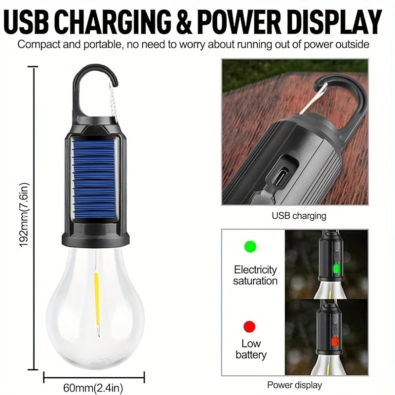 Solar Tent Lights LED Lantern,Backpack Hanging Lamp with Clip Hook,USB recharge Product List: 2/4/6/8*Solar Light 2/4/6/8*USB Cable 1. Powerful Solar Charging & Dual Power Modes Enjoy ultimate power freedom with our upgraded solar-powered lights. Just place them under the sun for efficient charging. No more worrying about dead batteries during adventures! For a quicker boost, use the included TYPE-C cable. This makes them a truly reliable outdoor camping essential , rain or shine. 2. Exceptionally Long-Lasting & 3 Brightness Modes Experience unparalleled runtime with our energy-efficient LED technology. On a full charge, these lights provide extended illumination throughout your night. Choose from 3 practical modes (Low/Medium/High) to perfectly match any activity—from creating ambient mood lighting to lighting up your entire campsite for tasks or safety. 3. Rugged, Waterproof & Built for Outdoor Adventures Designed to endure the elements, this camping light is constructed from high-impact ABS material and features a waterproof rating (IPX4 or higher, please confirm your product's specific rating). It resists splashes, dust, and accidental drops, ensuring it stands up to the rigors of hiking, camping, fishing, and any outdoor challenge. 4. Ultra-Portable & Versatile for Any Occasion Compact, lightweight, and incredibly versatile. Hang it in your tent, use it as a lantern on the picnic table, or take it on nighttime walks. Its gentle light is also perfect for backyard parties, patios, or as a reliable emergency light during power outages at home. It’s the all-in-one lighting solution for both your outdoor escapades and indoor needs. 5. Your Satisfaction is Our Priority We are confident in the quality and durability of our solar camping lights. Your peace of mind is our top concern. If you have any questions or concerns, our customer support team is here to ensure you have a perfect experience with your new outdoor gear.
