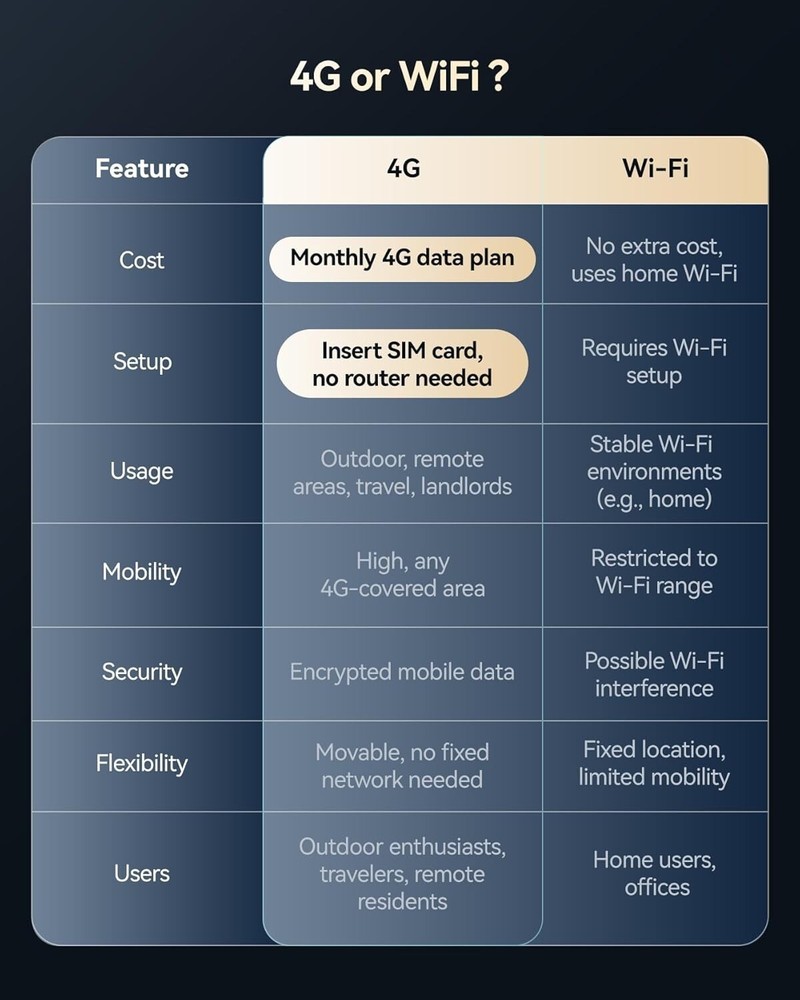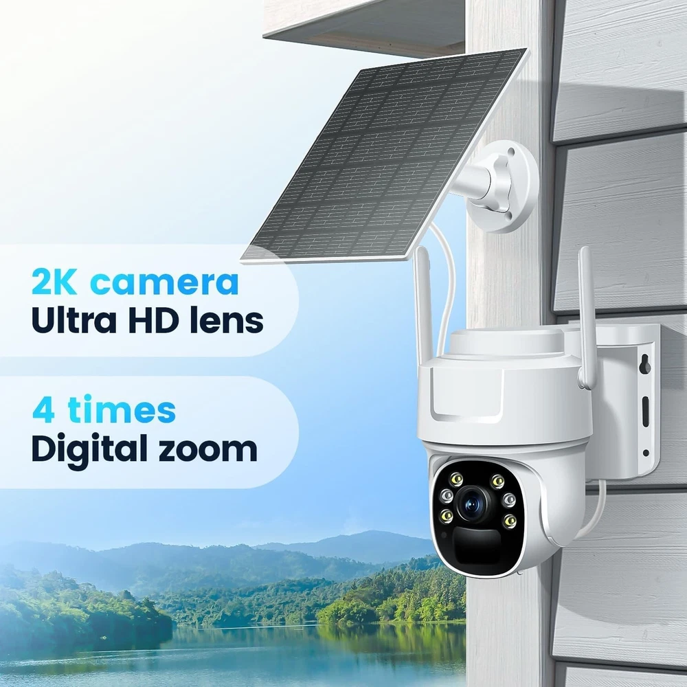 4G LTE Cellular Security Camera, Solar-Powered No WiFi Needed Wireless Outdoor Security Camera with PIR Motion Sensor, 355° Live View, 2K HD Night Vision, Remote Access, 2-Way Audio, Built-in SIM Card No WiFi or Power Needed for Constant Monitoring: The 4G LTE cellular security camera, suitable for use in the US, Mexico, and Canada, is solar - powered with a built - in 10400 mAh battery, requiring no internet connection, making it ideal for remote locations like farms, graveyards, and construction sites to ensure constant surveillance Built-in SIM Card with Flexible Data Plans: Comes with 300MB of prepaid data for camera connectivity. The SIM data plan can be renewed in-application at $14.9 per month, $79.9 for 6 months, or $149.9 annually (only with the included SIM card). Enjoy unlimited data viewing without worrying about data limits, and it supports TF cards (up to 128 GB, not included) and optional cloud storage service for secure event uploads, accessible anytime via the iCam365 app. Remote Control and 2K Live Viewing: This outdoor cellular security camera offers 2K resolution, 355° pan, and 100° tilt, allowing you to control it remotely via the ICAM365 app for clear live video anytime, ensuring the safety of your property Smart Tracking, PIR Detection, and Two-Way Audio: High-sensitivity PIR motion sensors reduce false alarms, sending timely alerts when motion is detected and saving video locally. The built-in microphone and speaker allow for real-time two-way audio, making it easy to communicate with visitors or deter intruders All-Weather Protection for Any Conditions: Whether it's a sunny day or a stormy night, the IP66 waterproof certification ensures the camera operates reliably in any weather. Enjoy peace of mind knowing your property is secure, regardless of the conditions outside