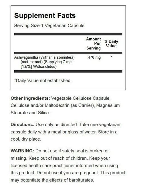 About This Item We aim to show you accurate product information. Manufacturers, suppliers and others provide what you see here, and we have not verified it. Ashwagandha is a potent adaptogen, helping the body to adapt to physical, environmental and emotional stressors. Dpuf Take one vegetarian capsule one to two times a day with a meal or glass of water. Used in Ayurvedic medicine as a rejuvenating tonic, Ashwagandha is known in the West as an adaptogen, a nutrient that appears to exert a stabilizing influence on body systems during periods of stress. Solaray Ashwagandha 470 mg - 60 Vegetarian Capsules Supports resistance to fatigue Immune System Support Helps Body Adapt to Stress Environmental and emotional stressors Use only as directed. Store in a cool, dry place. Indications: Health Concern: Blood Sugar Support Anti-Stress Support Adrenal / Thyroid Support Fertility Ingredients: Ingredients: Vegetable cellulose capsule, cellulose and/ or maltodextrin (as carrier), magnesium stearate and silica. Directions: Dosage: Use only as directed. Take one vegetarian capsule daily with a meal or glass of water. Specifications Features 60 Vegetarian Capsules Brand Solaray Manufacturer H&H Wholesale Gender Unisex Size 30x Count 60 Recommended Use Use only as directed. Take two capsules one or two times daily with a meal or glass of water. Store in a cool, dry place. Assembled Product Dimensions (L x W x H) 3.70 x 2.00 x 2.00 Inches Will be wrapped with care. ~ ~FREE SHIPPING~ Any questions, please feel free to contact us. Buy with confidence! Thanks for looking!