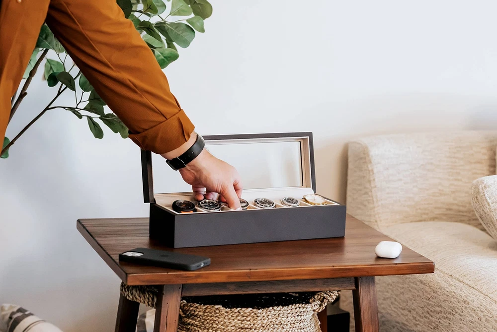 Give your watches a home they deserve with this SOLID, SLEEK watch box. Our refreshing design carefully incorporates deep ridges, straight lines, and a REAL GLASS display. ✅ We’ve simplified closing your watch box with our timepiece safe MAGNETIC ENCLOSURE, ensuring the lid stays tightly locked in place. ✅ Our ultra soft watch pillows have been designed to fit most sizes and styles of watches, including large faced watches, watches with small bands, and various other styles of men's and women's watches. ✅ The finely tuned espresso color is slightly glossed and paired with a black felt bottom that prevents any furniture surface scratching. ✅ With six slots to fill, you now have the perfect reason to go searching for your new timepiece.
