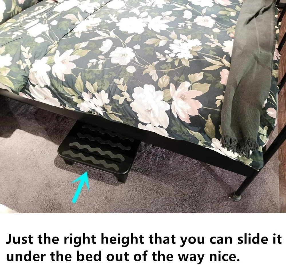 Solid Wood Bed Step Stool Super Large/Bedside Steps for High Beds/Solid Wood Super Sturdy Hold Up to 500 LBS (Dark Brown) Crafted from natural wood, which is sturdy and beautiful, relieves your fatigue and benefit to your health. Our step stool is designed to help you climb into bed with ease.You can also use it in kitchen, livingroom,bathroom and more. Smooth surface! - Our Stool is fully sanded and smooth to the touch. All corners and edges have been fully rounded and sanded .All wood screw construction.There are no exterior screw holes, no staples, nails or glue. With 5 pack black non-slip treads which you can apply or not.Our pre-cut black treads reduce slippery areas and increase safety by covering a larger stool surface. It is easy to install. Clean the surface first! Then peel and stick. Simply take out of the box and place in your living room or kitchen,bathroom.Super large and stable,16.6" Wide x 12.6" Deep x 6" High.Vented design ensures a natural flow Product Description Do you have a high bed or are you recovering from an injury? Our step stool is designed to help you climb into bed with ease. No Sharp Edges Before we assemble our stools, we round over all edges and corners. The rounded indents make it safe and easy for children to carry. There are no sharp edges to worry about. Smooth Surface Our stool is fully sanded and smooth to the touch. All Wood Screw Construction All wood screws are installed from the inside. There are no exterior screw holes. This item contains no staples, nails or glue. Specifications Net Weight: 5.5 lbs Max. Load: 500 lbs Number of Ladder Step:1 Material: Australian Beechwood Natural wood Platform size: 16.6" x 12.6" Size: 16.6" x 12.6" x 6"(L&W&H) Important information Safety Information Ensure the stool is stable before use, and do not exceed the maximum weight capacity of 500 lbs. Use non-slip treads for increased safety. Directions 1. Take out of the box and place in your desired location. 2. The stool is super large and stable with a vented design for natural flow, and can support up to 500 lbs. 3. Ensure the smooth and fully sanded surface with rounded and sanded corners and edges is safe to use. 4. Apply the 5 pack black non-slip treads for increased safety if desired.
