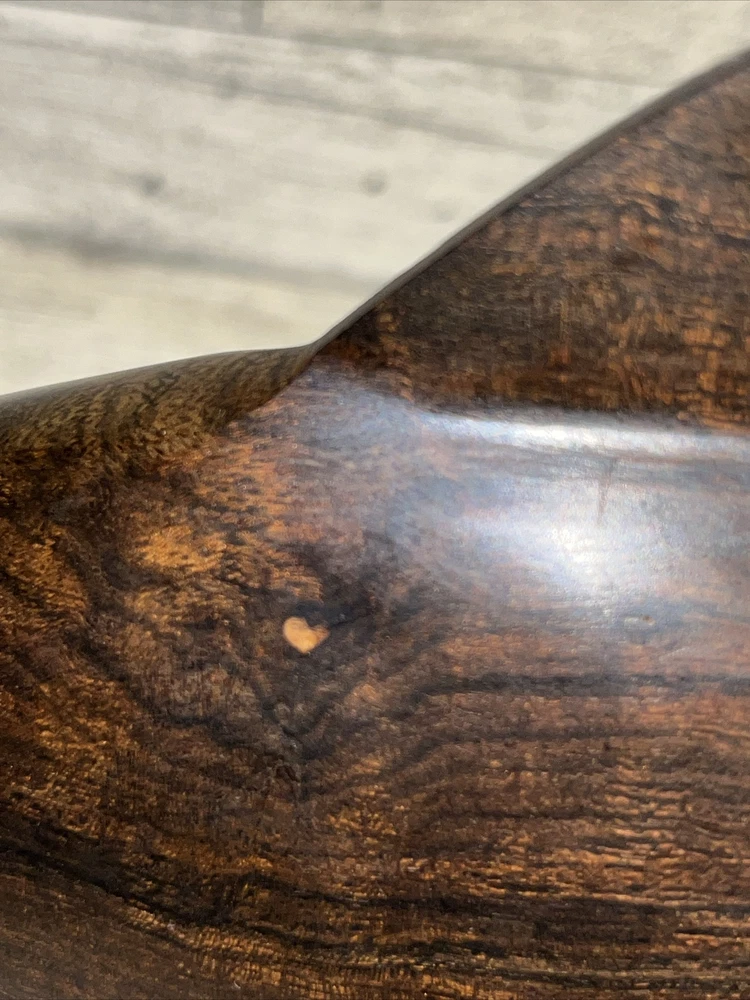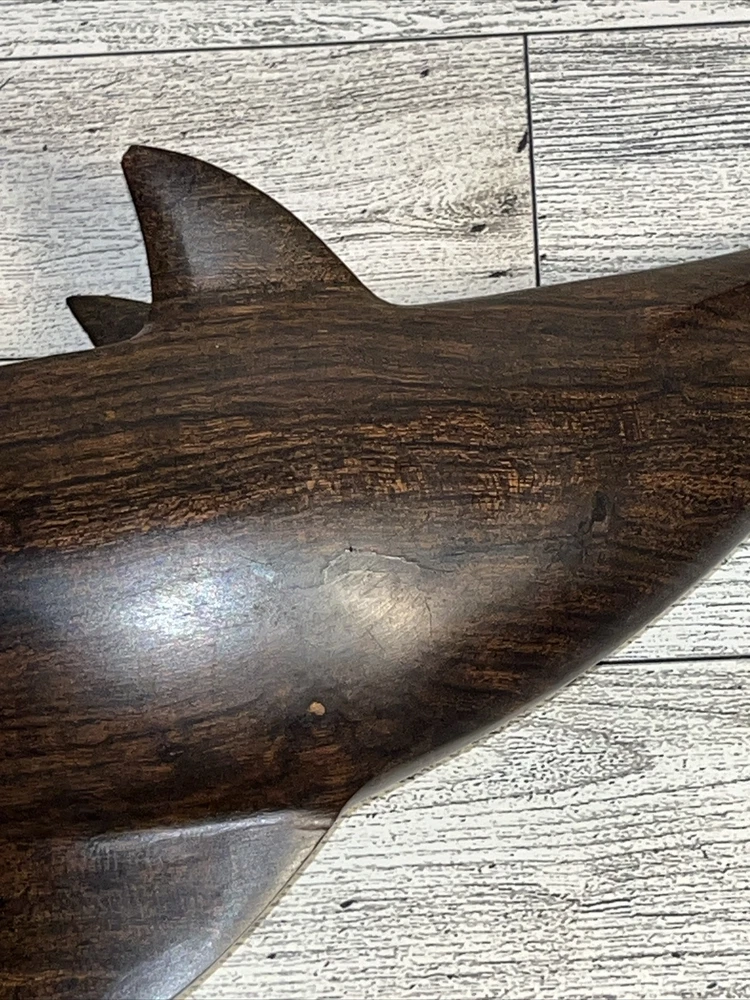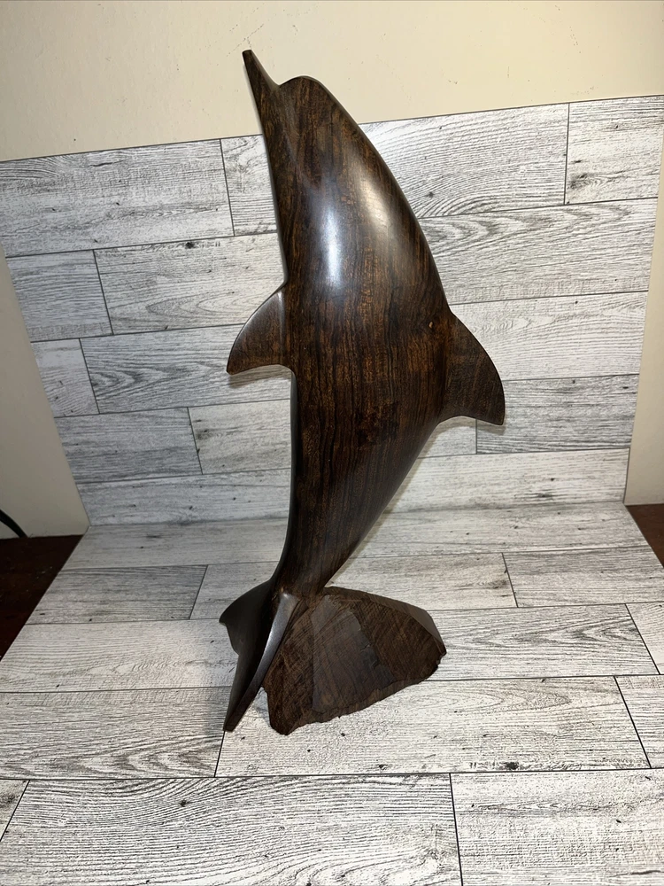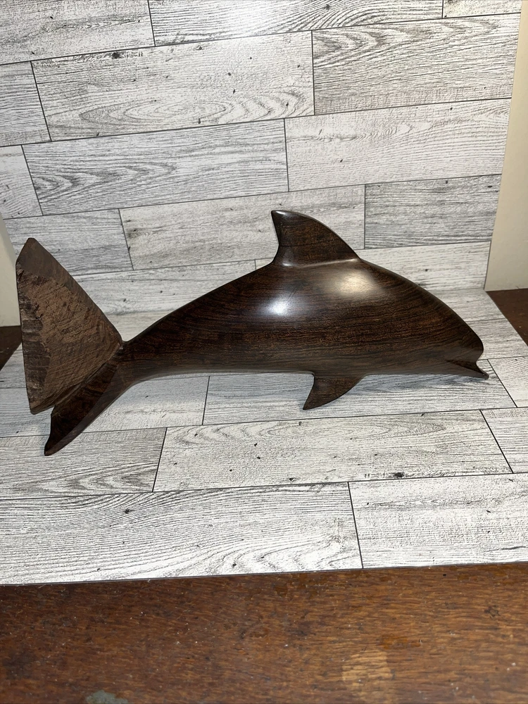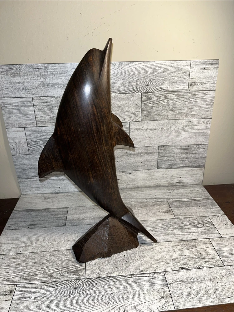 Gorgeous Vintage Piece with superb craftsmanship! Overall Very Good Condition with a few flaws- 1 fin has a chip at the bottom tip & 1 tiny worn spot on the side-nothing a little polish wouldn’t hide-Please see photos. This stunning solid wood dolphin statue is a must-have for any collector or marine life enthusiast. Crafted with incredible attention to detail, this piece showcases the beauty and grace of these magnificent creatures. Measuring approximately 12 inches by 5 inches, and weighing 1.12 lbs, this statue is a perfect addition to any collection. The mixed brown and black coloring of the statue perfectly complements the intricate design of the dolphin, making it a true work of art. Made from high-quality materials, this statue is sure to stand the test of time and become a treasured piece for years to come. Whether you're a fan of dolphins or simply appreciate the beauty of marine life, this statue is a must-have for your collection.