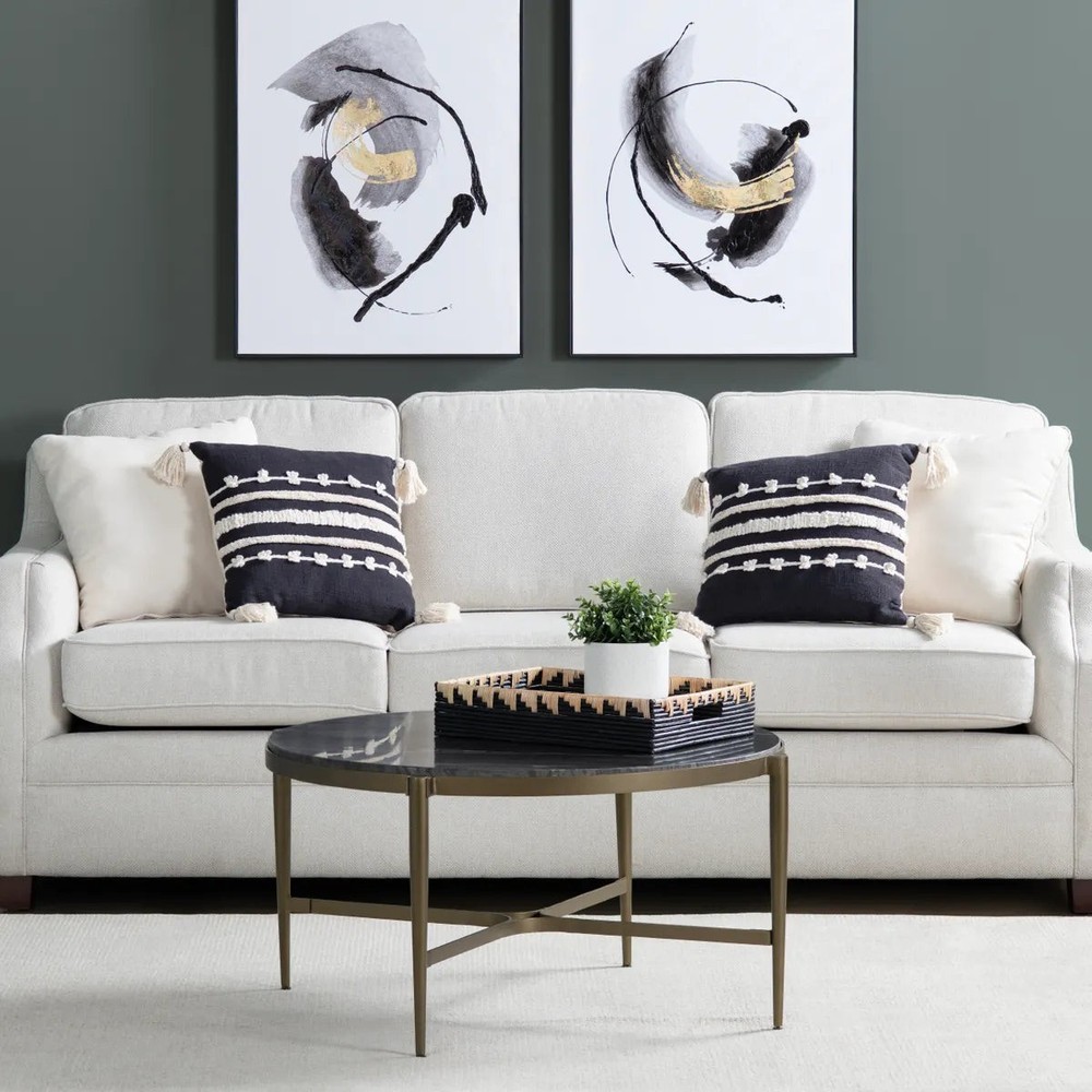 This Cocktail or Coffee Table is sure to add a hint of modern glamour to your interior. This three-post design boasts a textured metal frame in a luminous, antique gold finish that glistens from every angle. At the base, the three legs connect at a central meeting point that not only adds structural stability but creates a stunning visual display of craftsmanship. The crowning feature of this piece is a round slab of natural black marble that elevates the design with organic tones and textures for a truly remarkable Cocktail or Coffee Table. Dimensions: 37 x 37 x 18 (in)