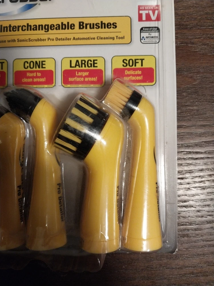 The Sonic Scrubber Pro Detailer Power Cleaner includes a pack of 4 interchangeable brushes designed for heavy-duty cleaning tasks. It features twist removal functionality, making it easy to switch between brushes, and is lightweight for comfortable use. This all-purpose cleaner is suitable for automotive cleaning and is cruelty-free. The brushes are multifunctional and attached to the scrubber for convenience, providing a versatile cleaning solution for various surfaces.