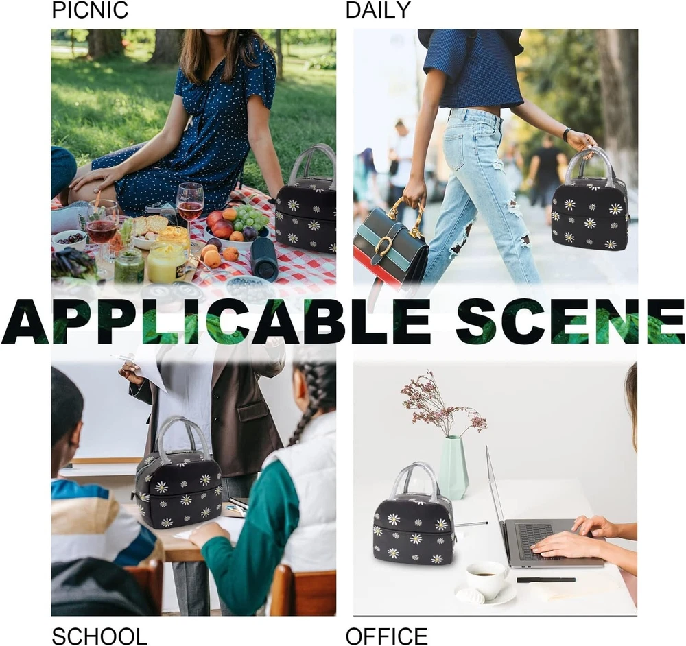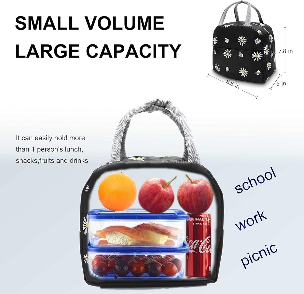 Sonuimy Insulated Lunch Bag for Women & Men, Reusable Leakproof Tote (Black with White Daisy) 【HIGH QUALITY】The insulated lunch box bag is made of high quality high-density oxford cloth and food-grade waterproof aluminum foil to prevent tears and ensure maximum durability, can be leakproof, easy to clean and reusable 【JUST THE RIGHT SIZE】About 9 x 6 x 7.9 inches and weighing only 0.21 pounds, this insulated tote lunch bag is light in weight but big enough to easily hold all the food and dinnerware as you want (lunch box containers, food, fruit, snacks, canned drinks) 【KEEP YOU FOOD FRESH】The cooler lunchbox bag can keep food warm and fresh for a long time, keep your drinks cold, don't worry about food spoilage, it's like a good assistant for your life 【PERFECT DESIGN】Lunch bag with tote style and front pocket design, you can put in some small stuffs you need in life: keys, cards, tissues, cell phone etc.Cute Floral pattern style lunch bag ,ideal gift for teen women or ladies