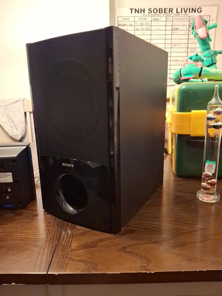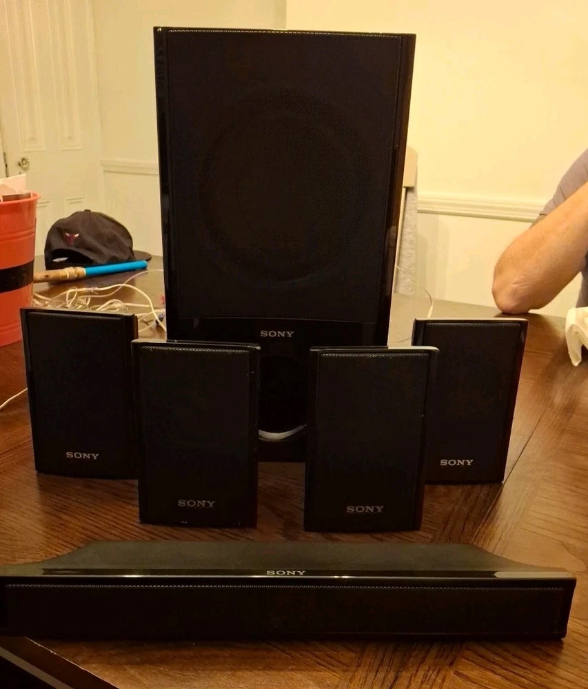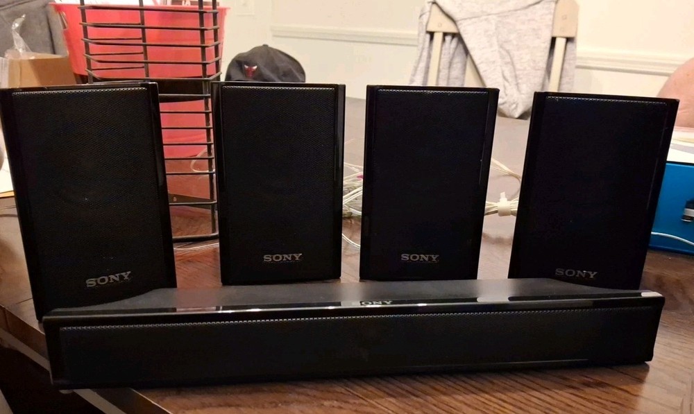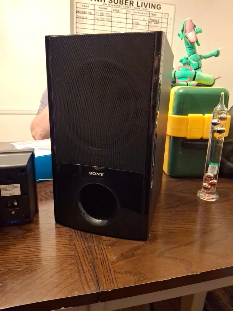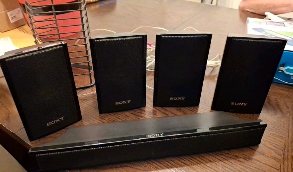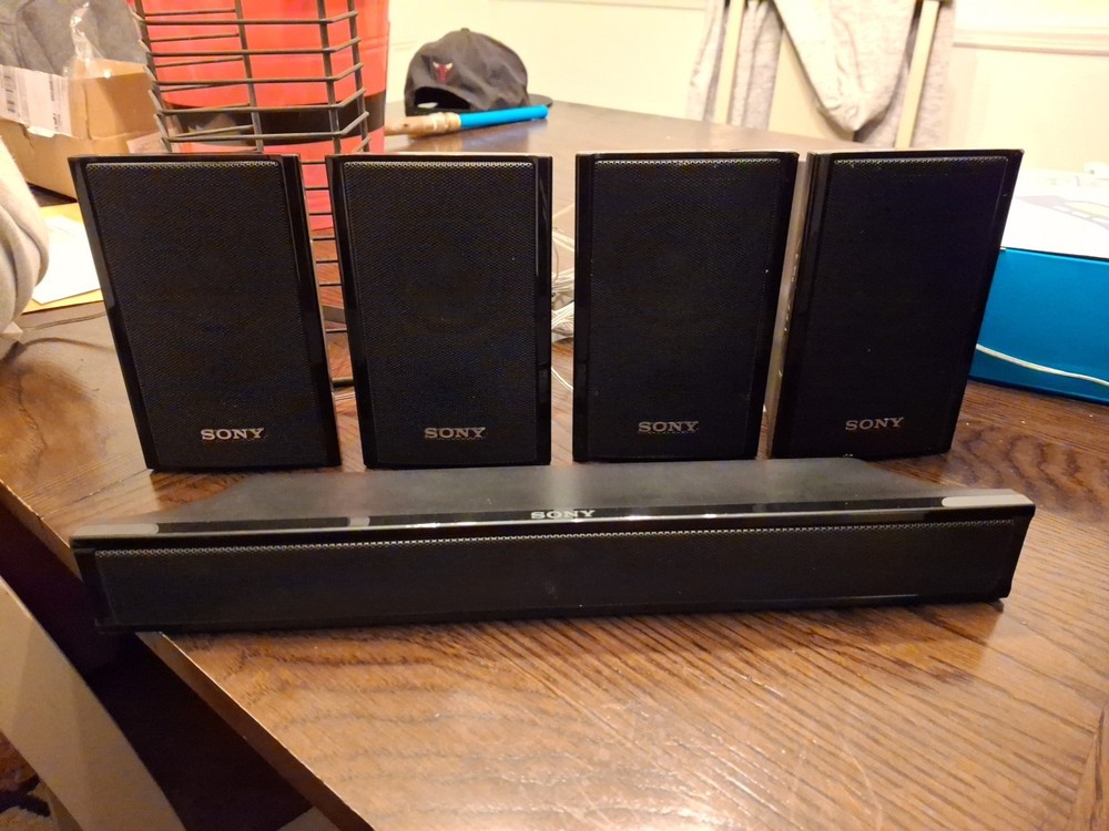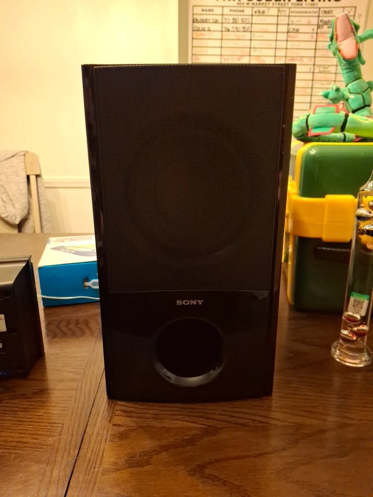 The SONY Speaker System includes a subwoofer SS-WSB92 and five matching speakers SS-TSB95 SS-CTB92. The sleek black rectangular subwoofer and speakers are from the Sony HT-S200F model, offering a 5.1 channel system configuration for a powerful sound experience. With wired connectivity, this home audio setup is perfect for enhancing your TV viewing or music listening experience. Everything's in vg condition and tested comes with speaker wires any questions message me