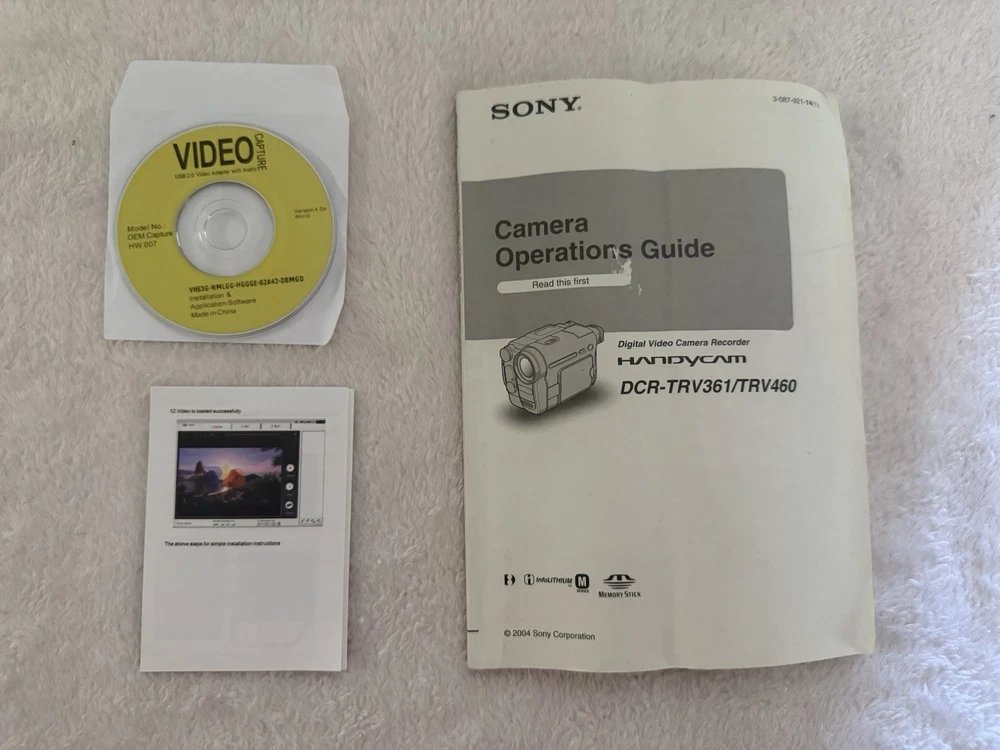 Sony Handycam DCR-TRV460 Digital8 Camcorder Video Camera Silver Tested & Working Items included: Sony Handycam Camcorder, 3 Sony NP-FM30 batteries, 2 Battery chargers, 2 Sony 120 minutes 8 mm video cassettes, Sony 64 MB memory stick, Lexar 128 MB memory stick, A/C compact power adapter, S-Video cable, RCA Audio/video cable, Video DVR cable, A/V video cable cord, USB cable, video capture disc, Sony remote, Sony operations manual, Sony carrying case Pre-owned, used in good working condition. Please see pictures for all details.