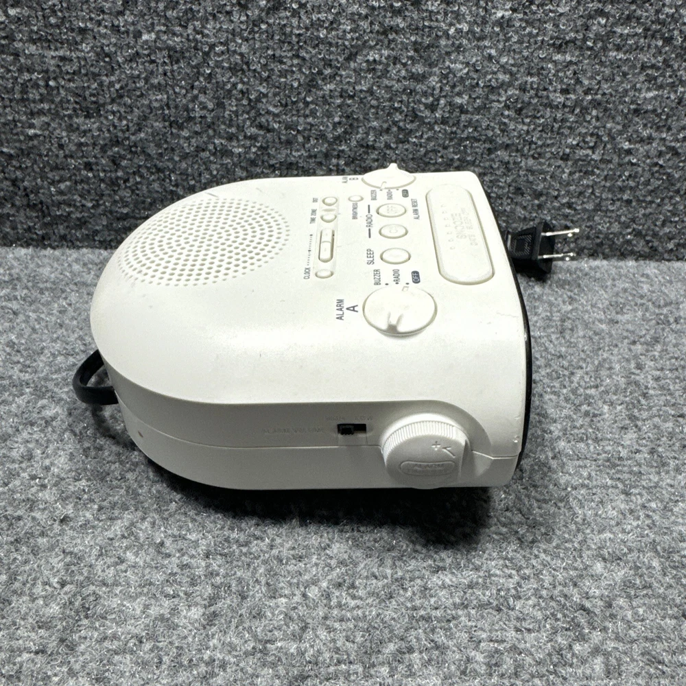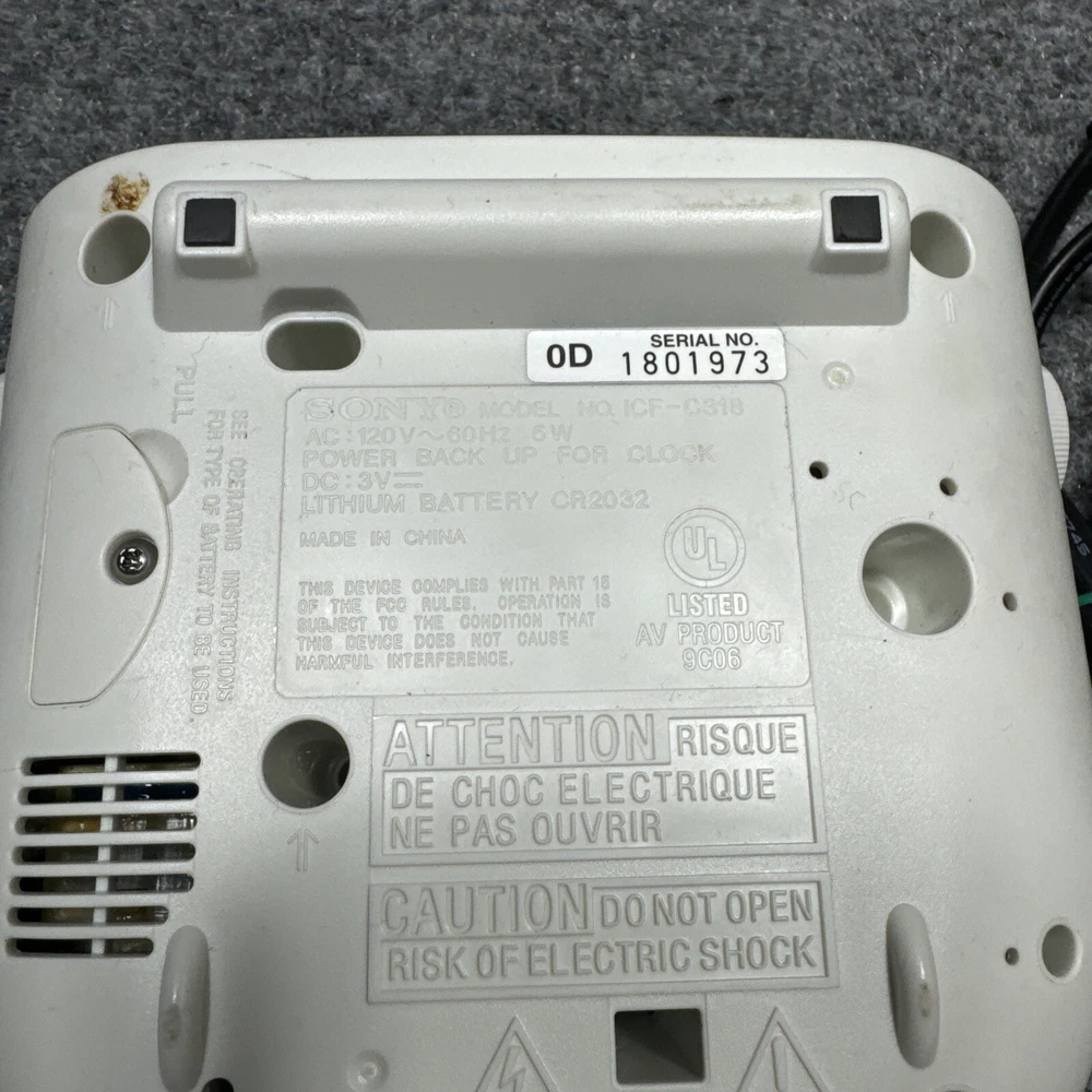This Sony Dream Machine AM/FM Dual Alarm White Clock Radio Model ICF-C318 is a vintage/retro style clock radio that will make a great addition to any bedroom. With a digital display, this clock radio features dual alarms, a 24-hour display, AM/FM radio, battery backup, snooze function, and a quartz movement. The clock radio is made of plastic and has a white finish. It weighs 8.8 oz and measures 6 inches in length, less than 15 inches in height and width. This original Sony product has a manufacturer warranty of 1 year and was manufactured in China. It is compatible with any adult bedroom and has a digital number type. The clock radio is part of the Sony product line and has a model number of ICF-C318.