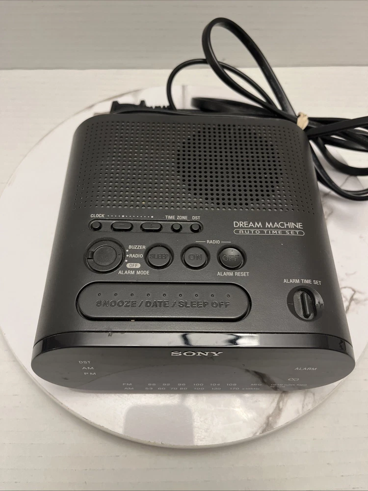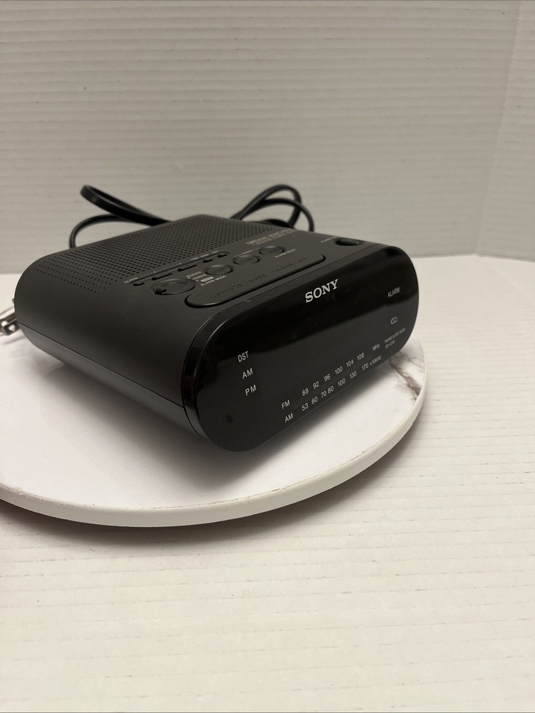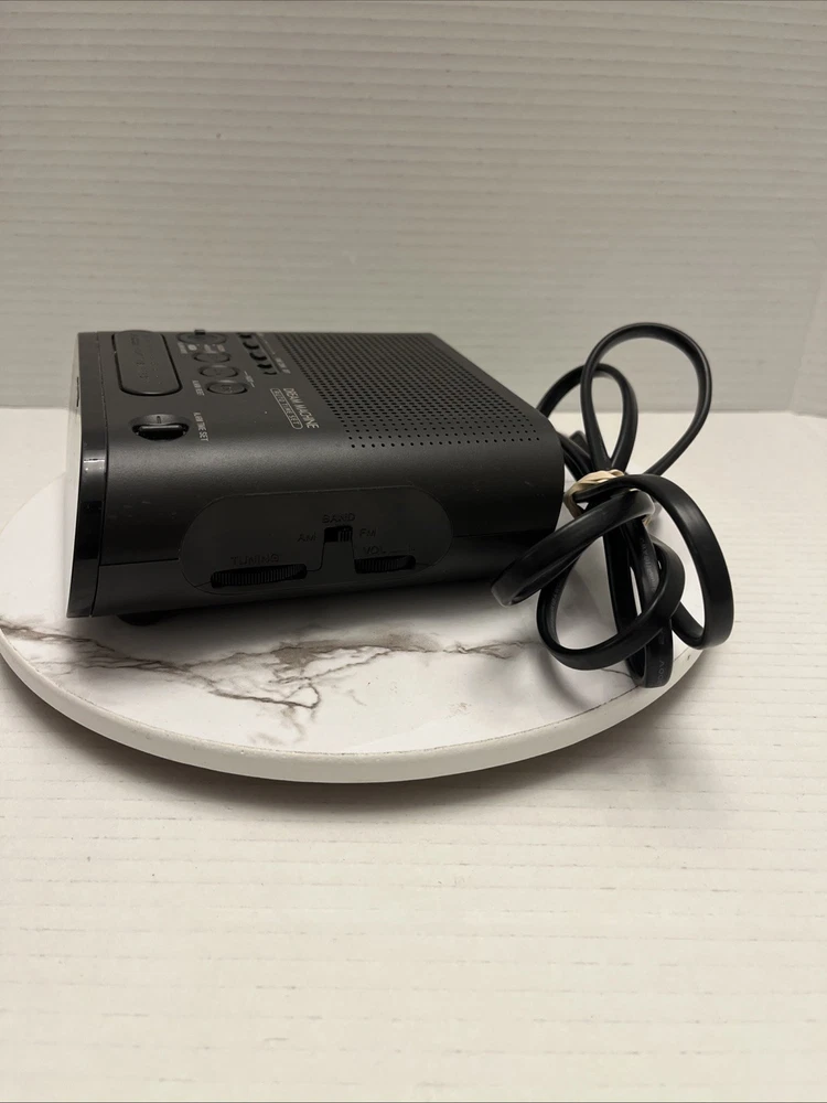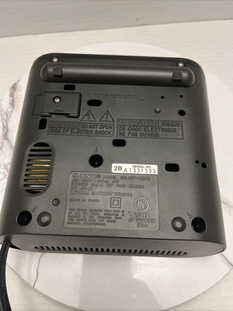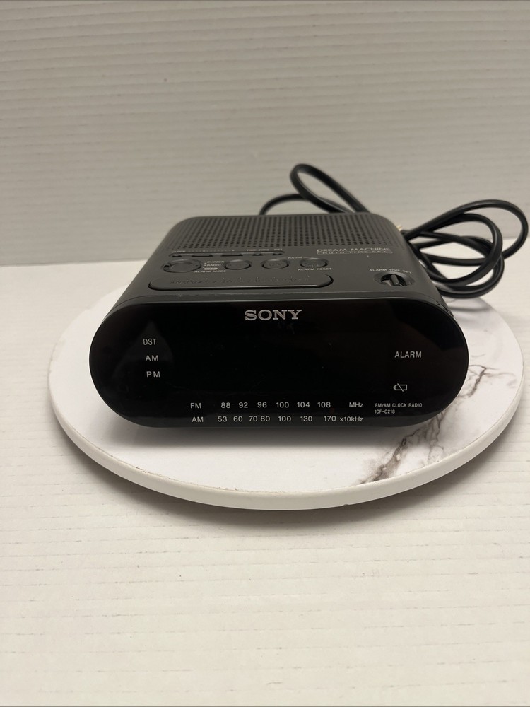This Sony Dream Machine ICF-C218 alarm clock radio is a great addition to any room in your home. With its modern black finish and square shape, it is both stylish and functional. The clock is powered by an electrical source and features an LCD display, which makes it easy to read the time and other important information. In addition to being an alarm clock, this device also has AM/FM radio capabilities, so you can listen to your favorite radio stations while you get ready for your day. It also has a snooze function, battery backup, and 12 hour display. The clock is made of plastic and is an original item, not a reproduction. It is perfect for use in the bedroom, home office, study, dining room, kitchen, or garage.