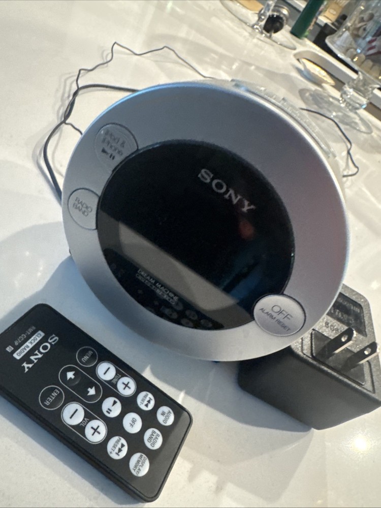 The Sony Dream Machine ICF-C7iP is a modern clock radio with a round shape and a sleek silver and grey/black color design. This iPod dock features AM/FM radio capabilities, alarm function, battery backup, and a 3.5 mm auxiliary input for expanded connectivity. Perfect for teens, adults, and kids alike, this 21st-century clock radio from Sony is a stylish and functional addition to any bedroom, kitchen, home office, or garage. With its digital display and convenient remote control, this clock radio offers a seamless blend of aesthetics and practicality for a contemporary lifestyle.