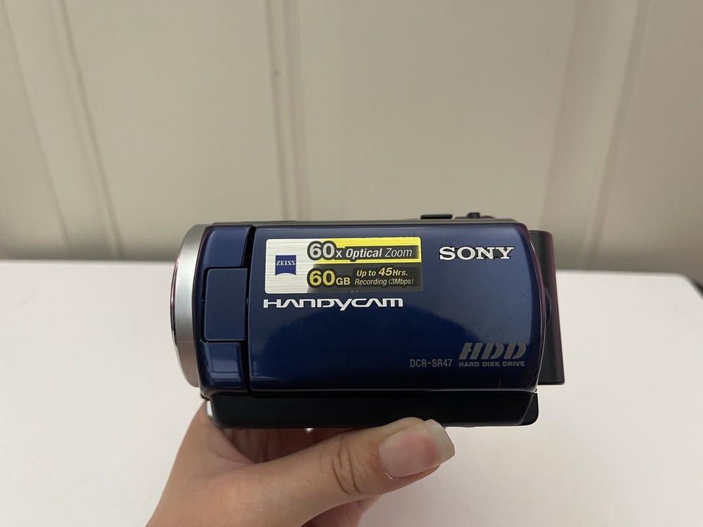 Sony Handycam DCR-SR47 60GB Compact HDD Digital Video Camcorder Blue Bundle Item is preowned, used. TESTED WORKING. Item shows light wear, scratches, marks, etc.. Includes: camcorder, battery, charging cord, SD card, AV cord, usb cord, and carrying case Any other accessories or manuals are NOT INCLUDED Please SEE PHOTOS in DETAIL for item condition.