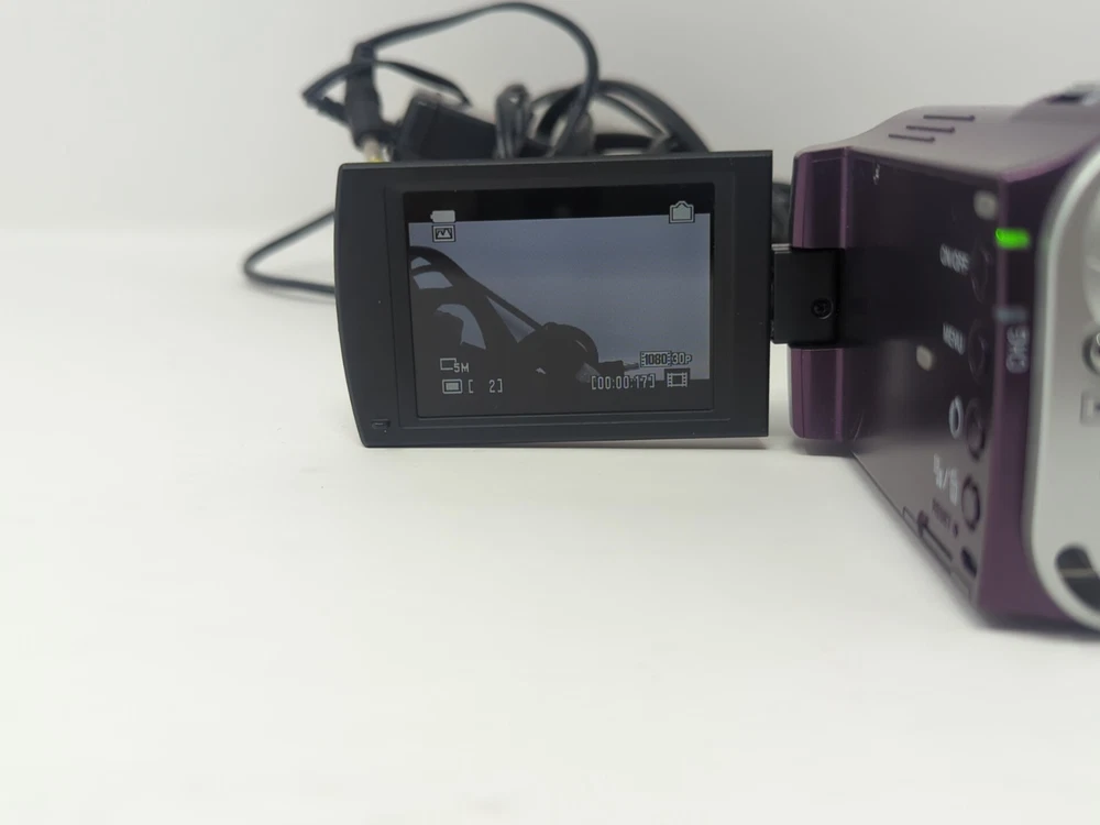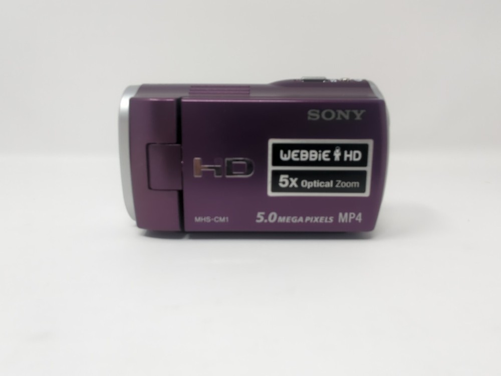 Camera works and has a few cosmetic flaws as shown in the photos, comes with the charger, no sd card The Sony MHS-CM1 HD Camcorder is a compact and portable device perfect for capturing high-definition videos. With a sleek purple design, this camcorder offers 5x optical zoom and HD recording capabilities. It uses SD media format for storage, making it easy to transfer and store your videos. The compact size of this Sony Handycam model makes it convenient to use and perfect for capturing special moments on the go. Made in Japan, this camcorder is a reliable choice for anyone looking to record in HD quality.