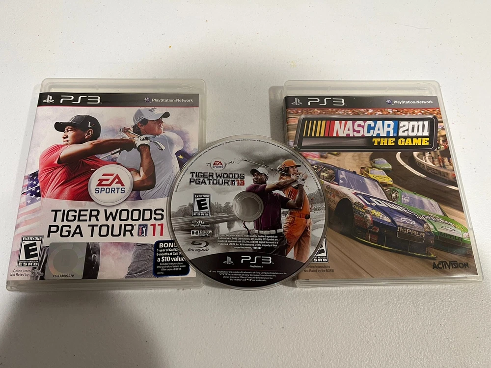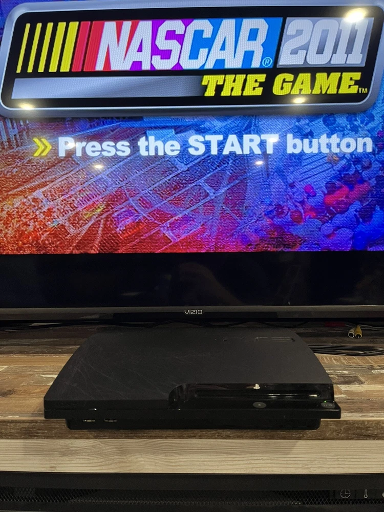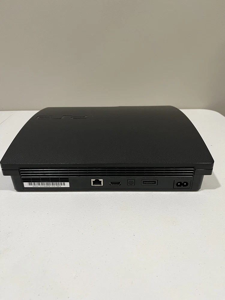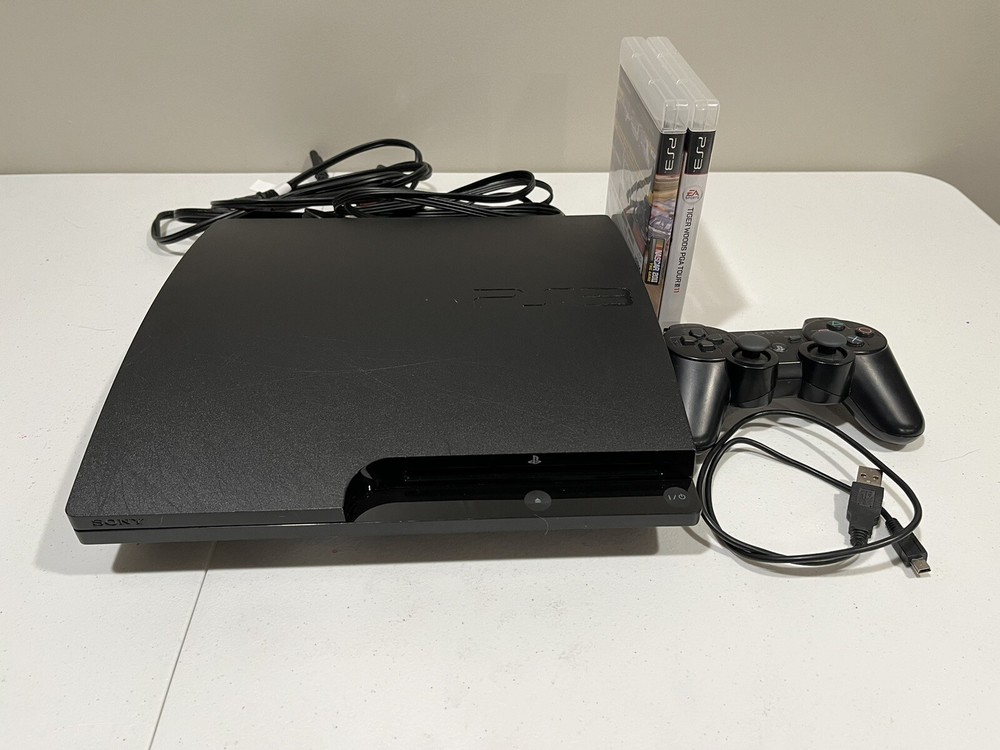 This is a Sony PlayStation 3 Slim console in black, with a storage capacity of 160GB. It includes a controller and games, and is tested for functionality. The console is a home entertainment system that can play Blu-Ray discs and has Wi-Fi capability. It has HDMI connectivity and a resolution of 1080p. The model is CECH-3001A, manufactured in the United States for the NTSC-U/C region. Games and controller have also been tested and discs are in excellent condition. Tiger Woods 13 is disc only. NASCAR 11 and Tiger Woods 11 are complete.