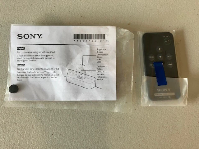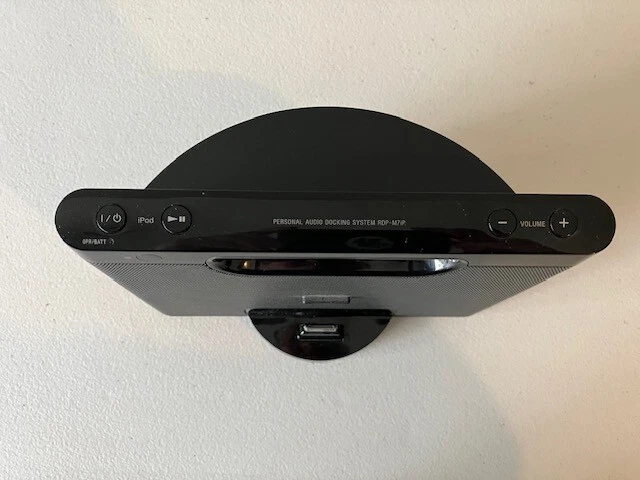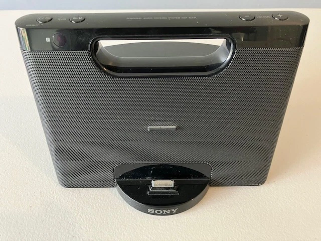 Sony Personal Audio Docking System- RDP-M7iP- Adaptor Tested- Works. Includes Docking System with Speaker for Iphone or Ipod. Also includes AC Power Adaptor (6V) and Remote Control. Works with Older Ipods and Iphones. Takes 4 AAA Batteries- Ships without batteries. Tested with Adaptor and green light works. Not tested with iphone. Measures 8 3/4" x 6 1/2". Iphone port 6/8" long. In good condition for age and use. No cracks or chips. Battery compartment clean. Includes adaptor and remote. See Photos.