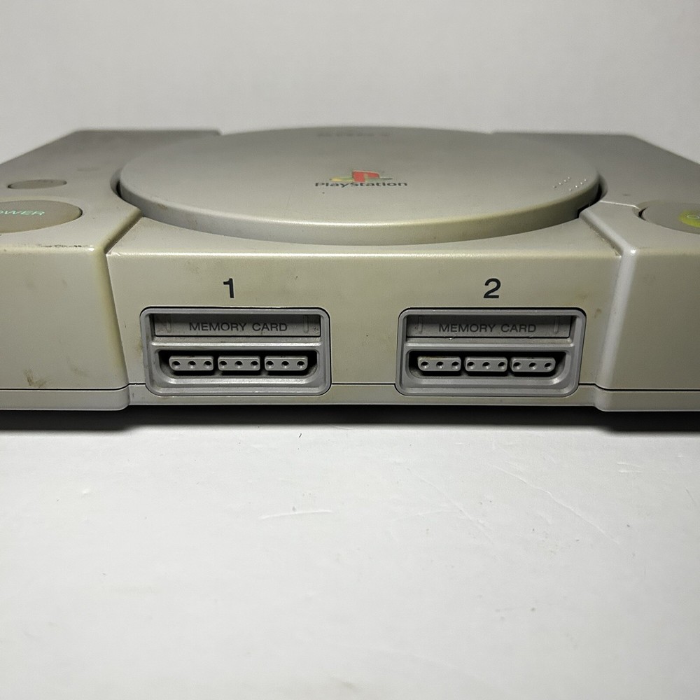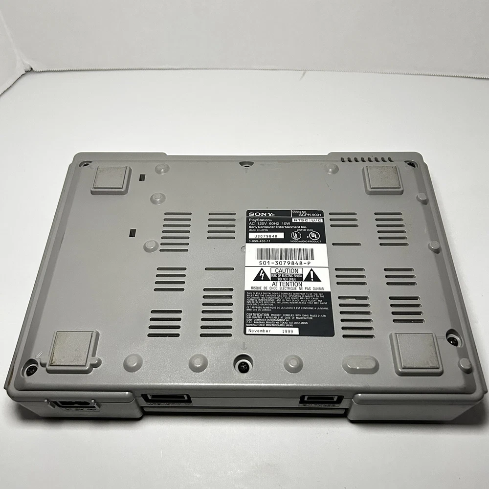 This is a Sony PlayStation 1 console (model SCPH-9001) manufactured in 1999 in Japan. The color of the console is gray. It is being sold for parts or repair. The listing includes only the console itself, no additional accessories are mentioned. Untested with a mark on the open button. Open button also gets stuck causing door not shut