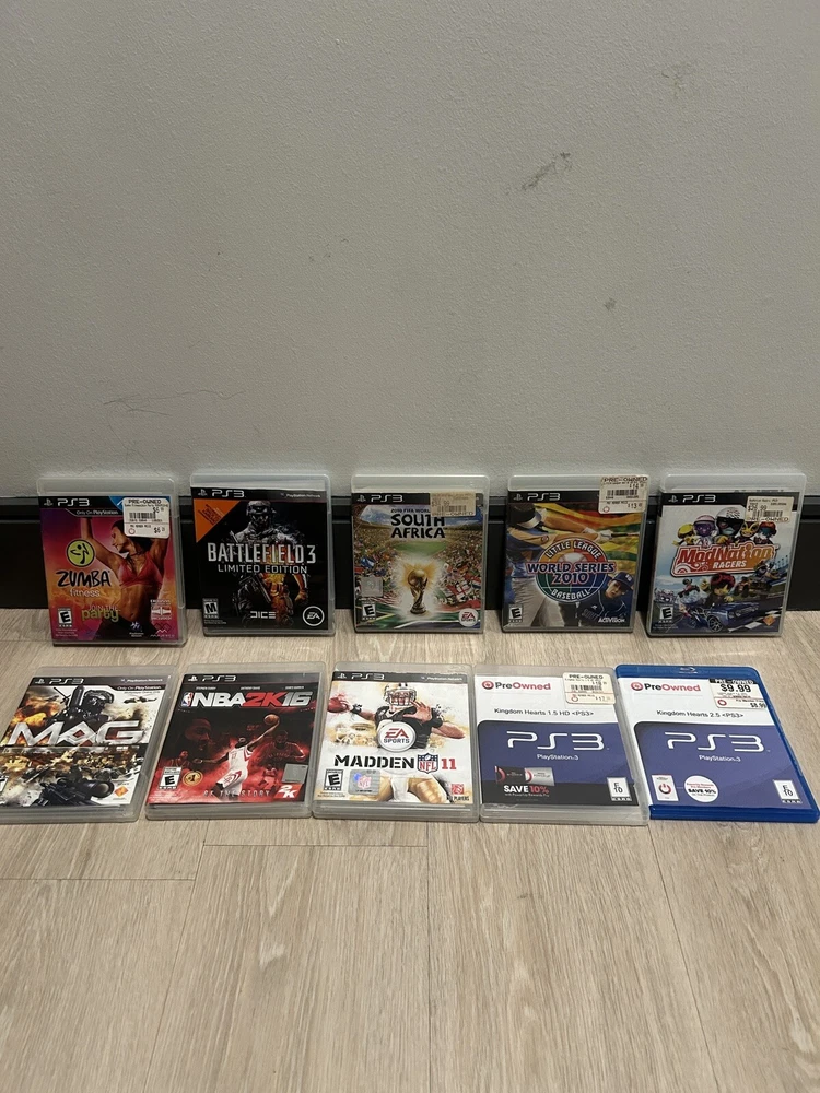 PS3 Slim 250 GB CECH-2001B. System is tested and works great. Comes with 4 controllers. 1 actual Sony PS3 controller and 3 3rd party ones. From my memory, the controllers don’t work great but they still function. Some stick drift on them. Also comes with 10 games and includes titles like Madden, NBA 2K, FIFA and Kingdom Hearts. Great system and lots of hours can be spent on it. Has a power cord but does not come with an HDMI cord. If you have any questions or need additional photos, please let me know!