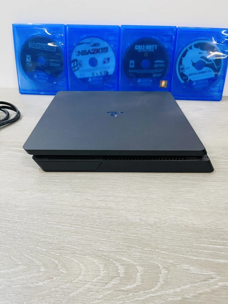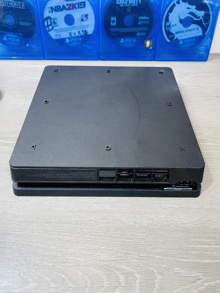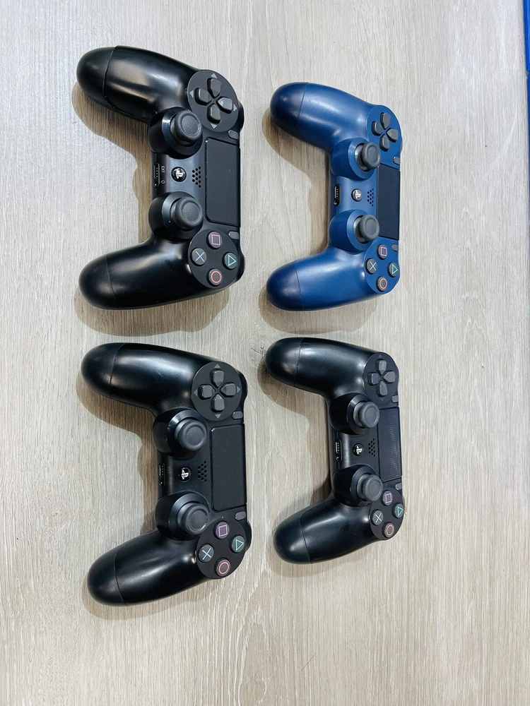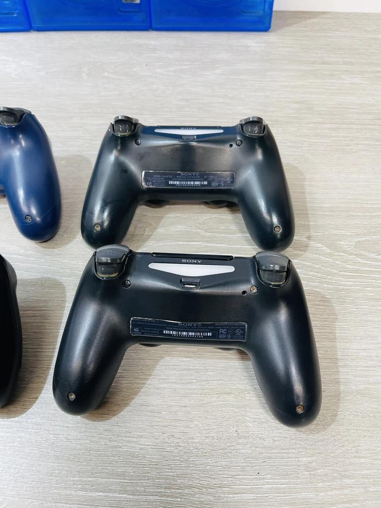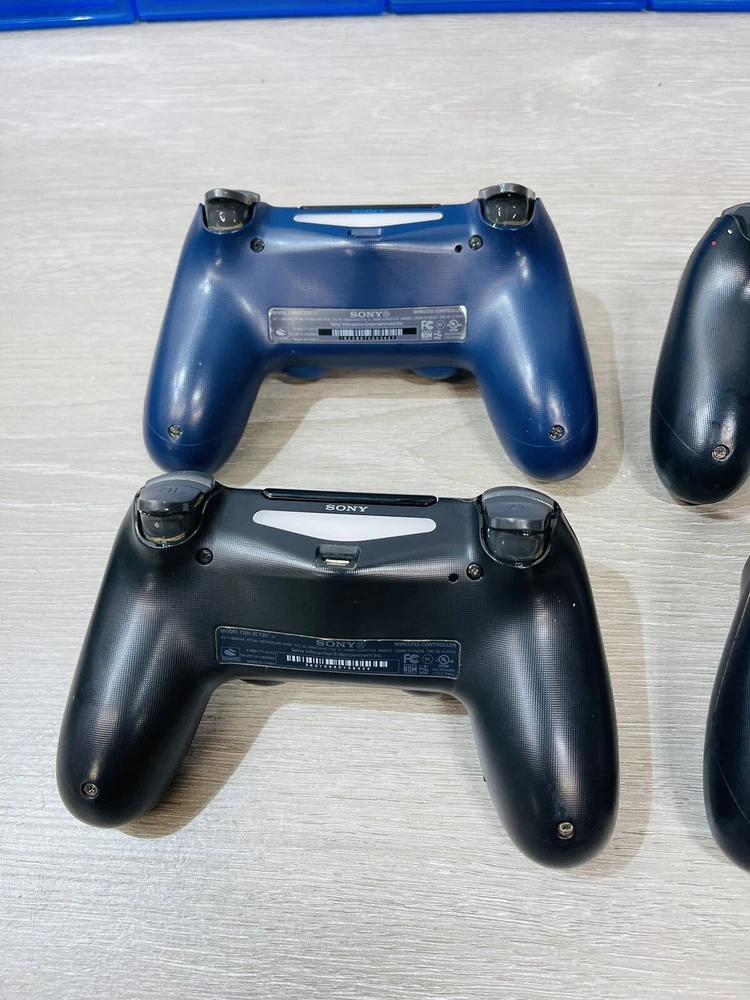 In good working condition, the PS4 slim has been upgraded to one terabyte , All four controllers hold a charge and work , One does have a lifted cover . There is minor wear present to the system and controllers .