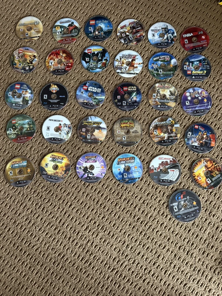 PS3 , 2 controllers and 31 games . Modern warfare , midnight club, Harry Potter, FX vs Atv , madden 25, nba 2k14,Lego Indiana jones 2,dragon ball z, Lego Batman, time crisis 4, hot shots golf, Lego Batman 3 , buss quiz words, Mx vs atv supercross, Lego Star Wars , Lego Star Wars 3,nba jam, Lego Jurassic world, Lego lord of the rings, fifa aoccer 11, motor storm pacific drift , monster madness, uncharted 3 , Lego Lego movie, mercenaries 2,need for speed most wanted , grand tourism o 5, Ratchet and Clank- tools of destruction/ into the nexus/ all4 one / a crack in time