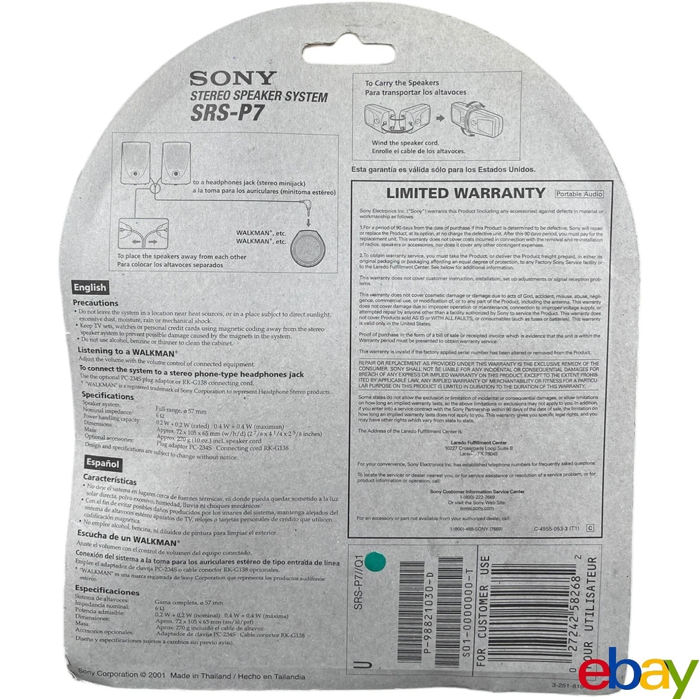 Speaker Depth: 2.63in Brand: Sony Speaker Width: 2.88in Max. Power Output: 0.8W Speaker Height: 4.25in Connection Type: Wired Subwoofer: Without Subwoofer UPC: 0027242582682 Type: Portable Speaker System Speaker Weight: 0.58lb. Speaker Frequency Response: 250-15000Hz gtin13: 0027242582682 Model: SRS-P7 MPN: SRS-P7 Connectivity: Wired, Audio Jack System Configuration: 2, 2.0 System